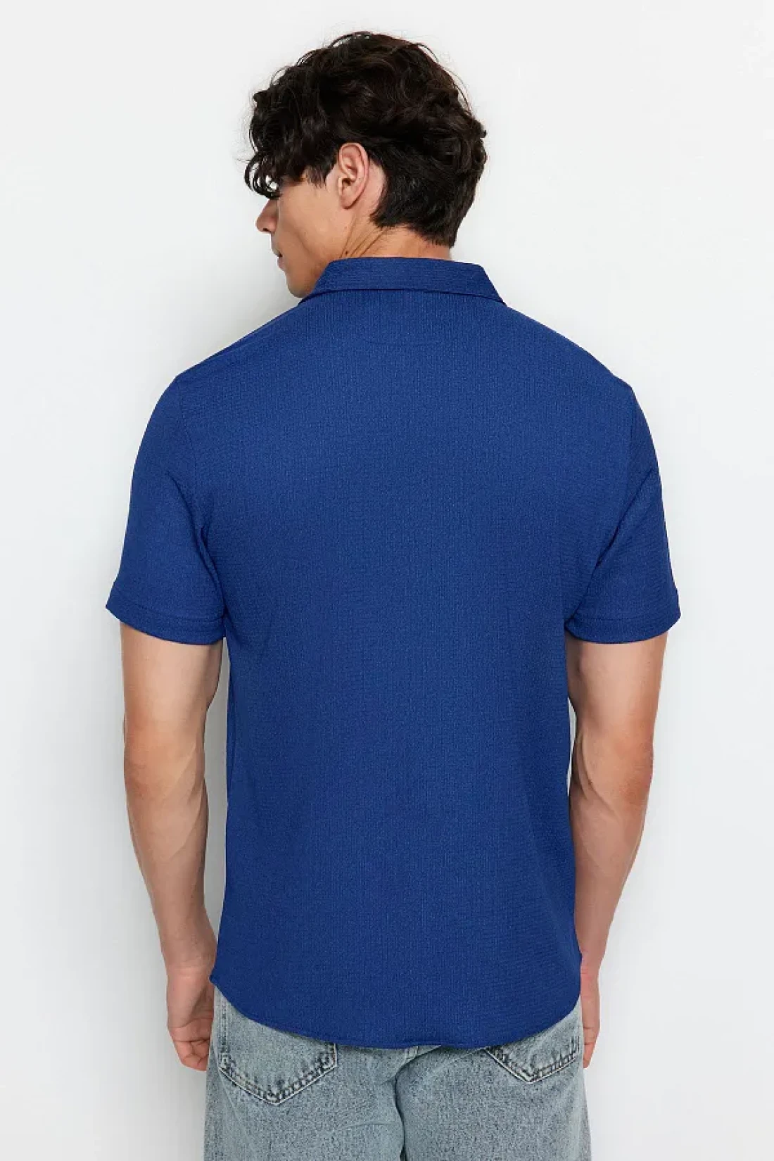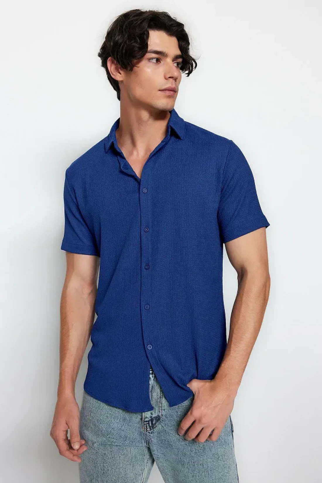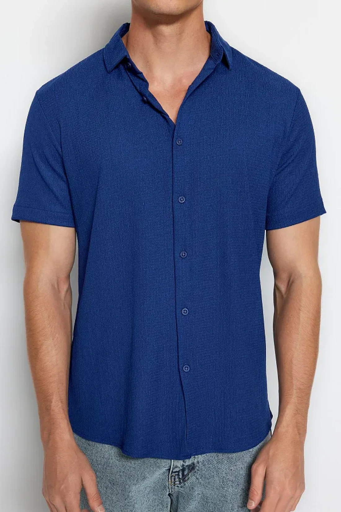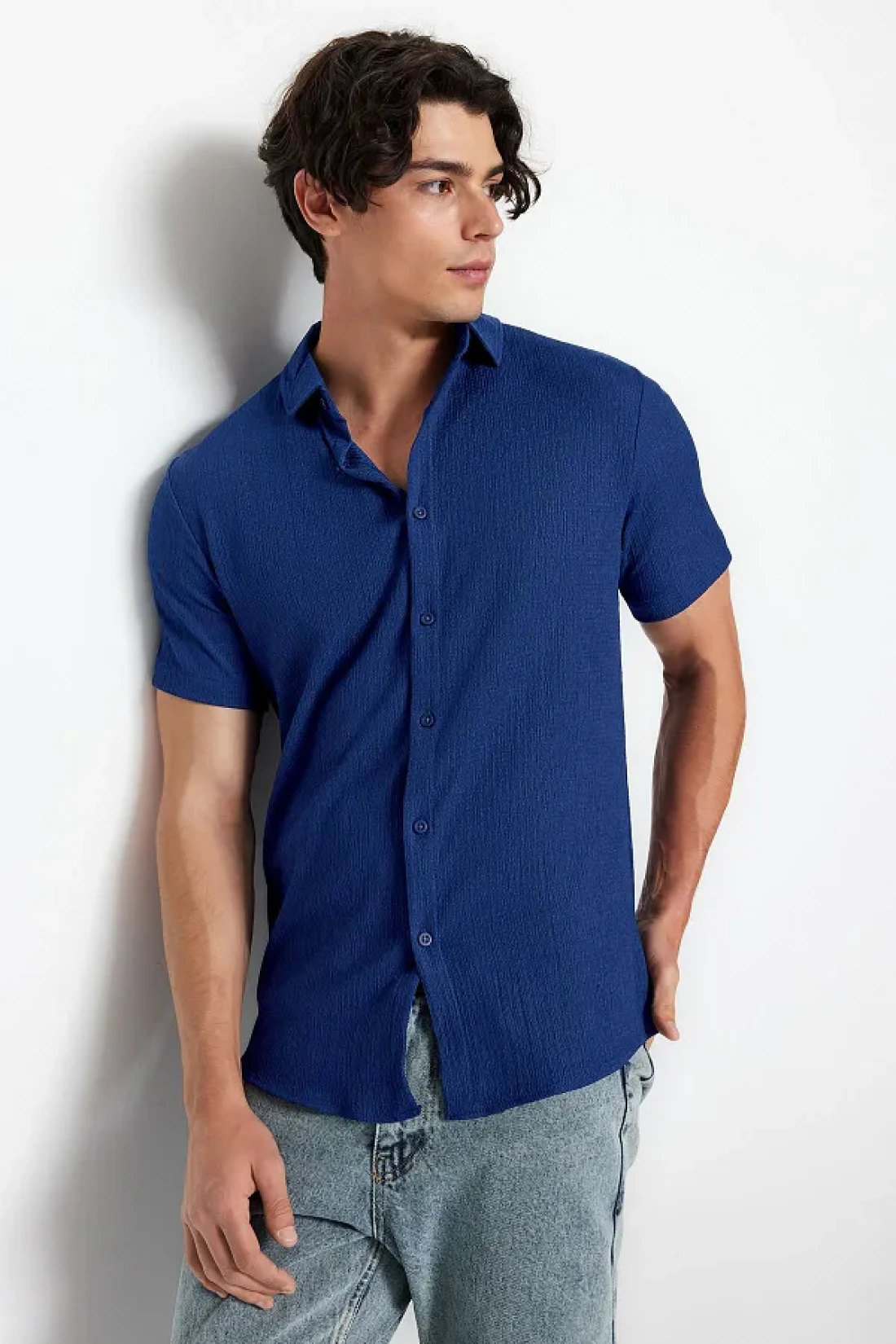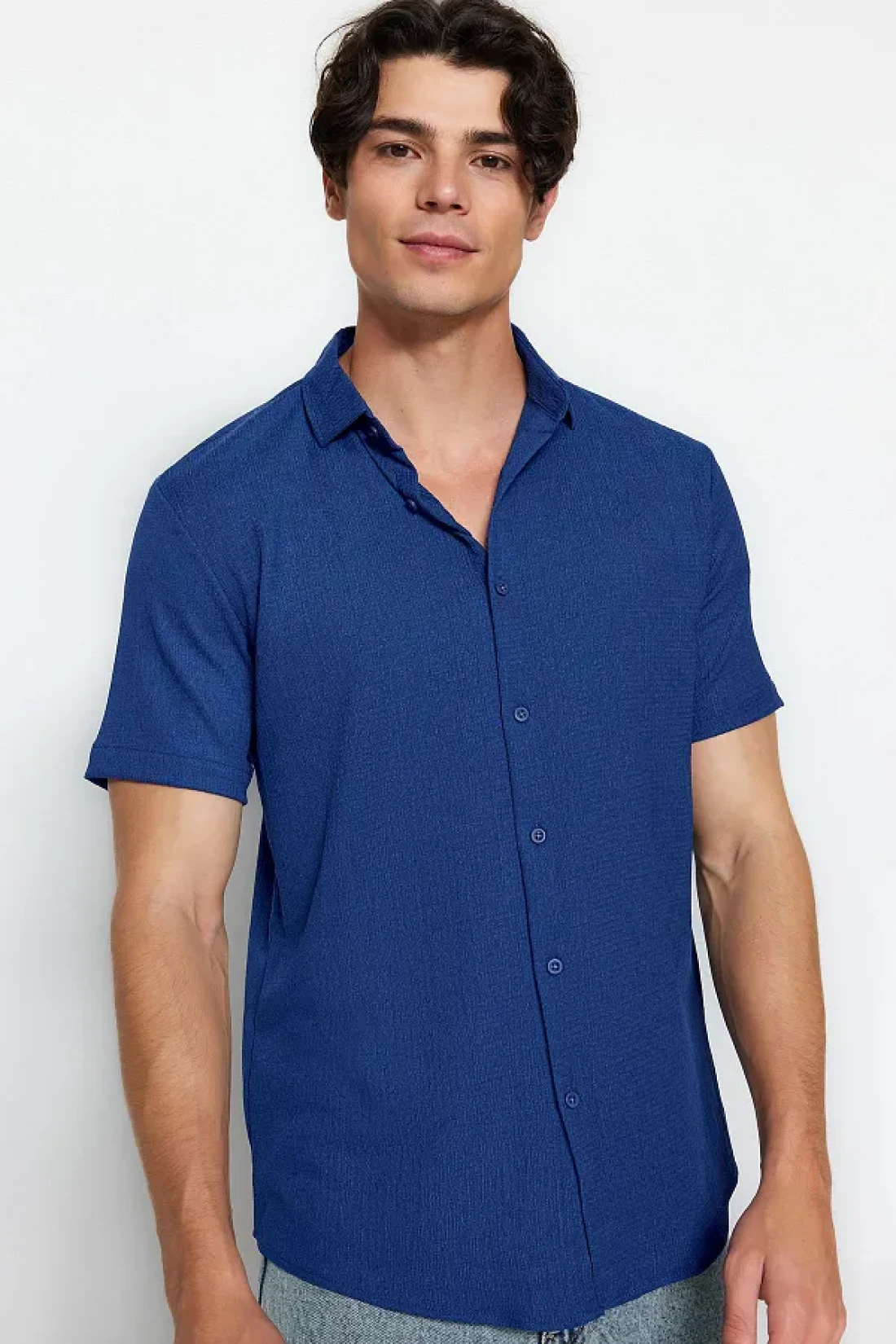 Collection Summer Textured Navy Blue Wrap Shirt - Short Sleeve, Regular Fit Tmnss23Go00055