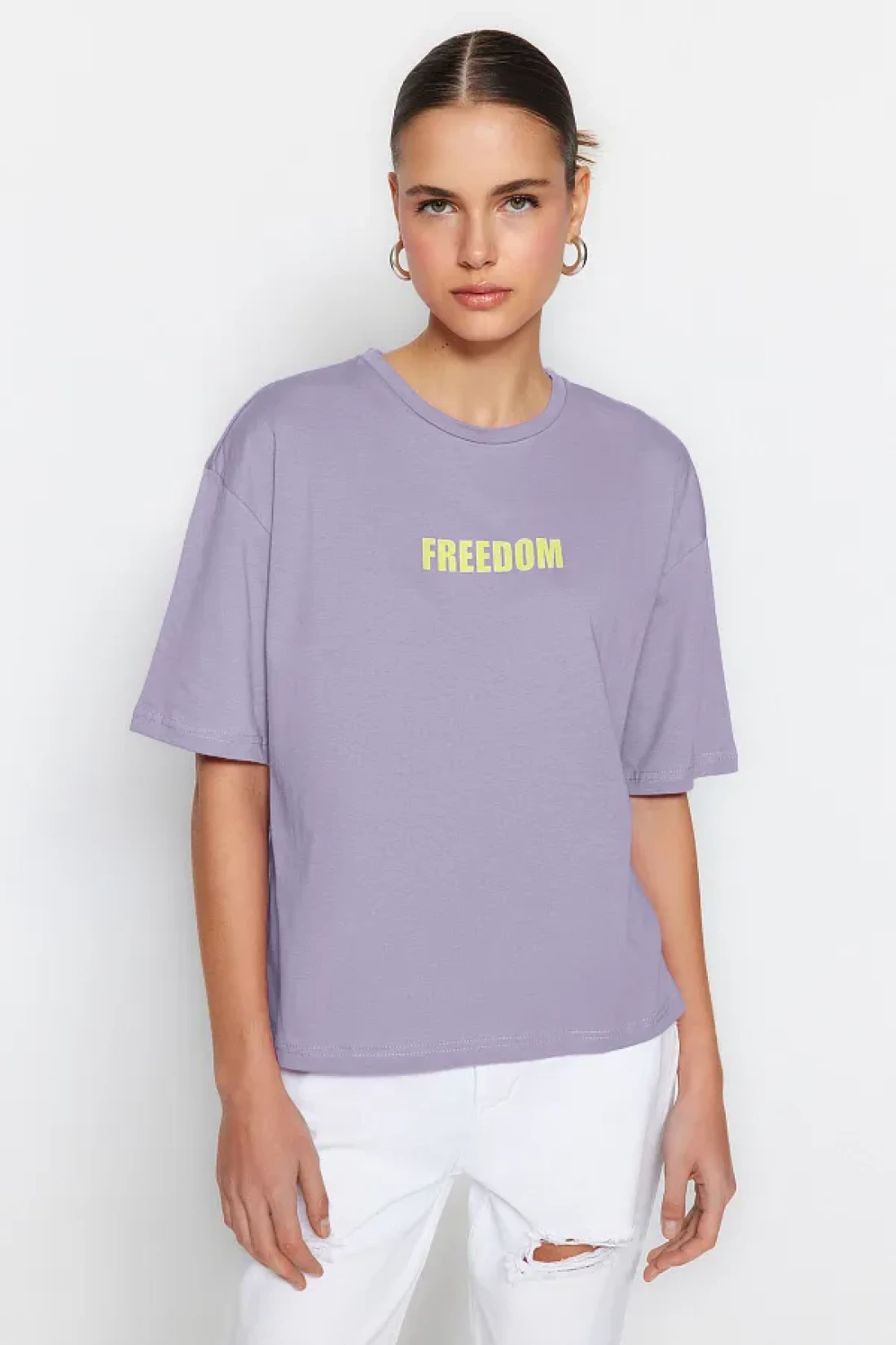 Collection Lilac 100% Cotton Slogan Printed Relaxed/Comfortable Fit Crew Neck Knitted T-Shirt TWOSS21TS0316