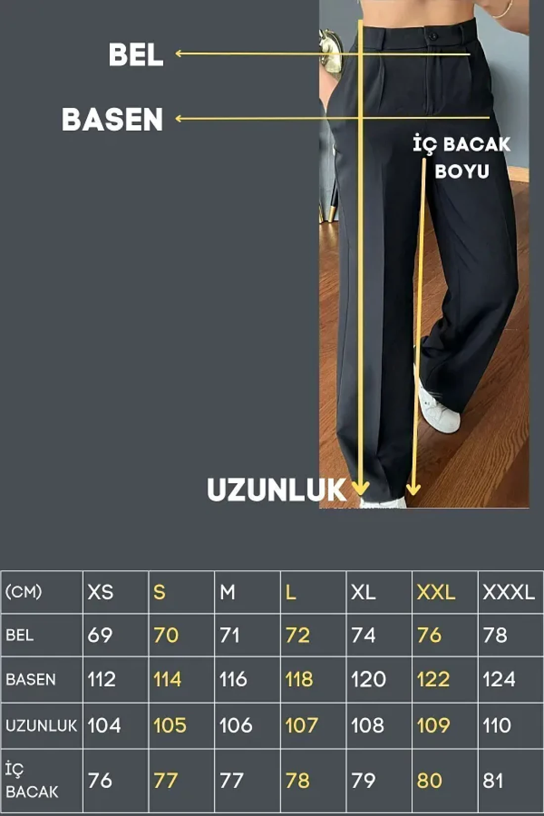 This material, with its flexible structure, provides freedom of movement, while its stylish appearance represents you in the best way in every environment, from the office to dinner. You can find your correct size from the size chart in our product images. high waist stylish trousers. model's measurements: height: 172 waist: 70 hips: 114. the product on the model is size s. You can find our models such as velcro, also known as velcro closure, and striped ones in the product variants. Colors in studio shots may vary due to differences in lighting.