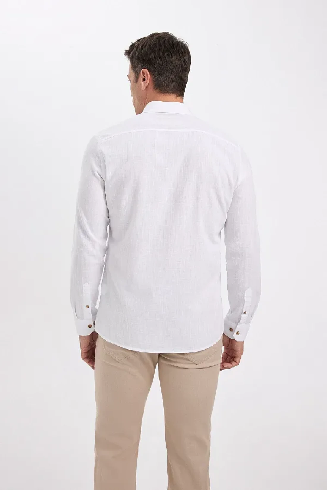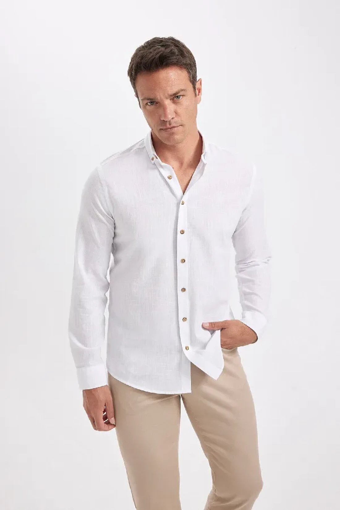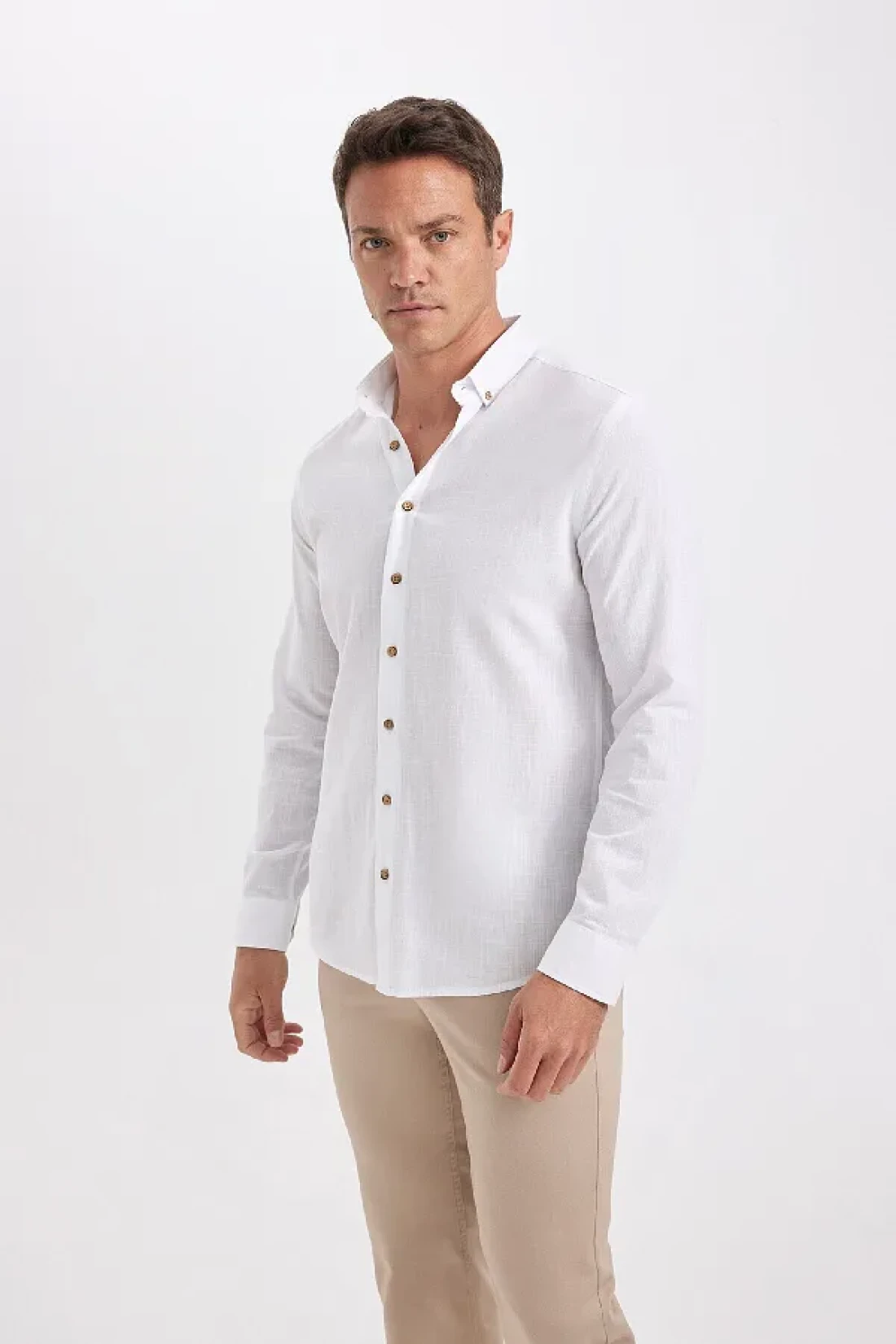 Defacto Modern Fit Buttoned Polo Neck Linen Look 100% Cotton Long Sleeve Shirt T6284Azns