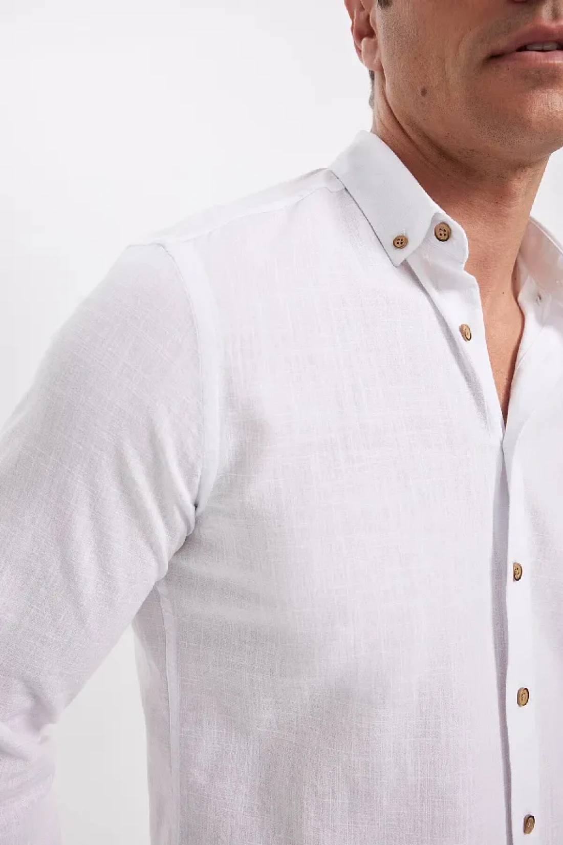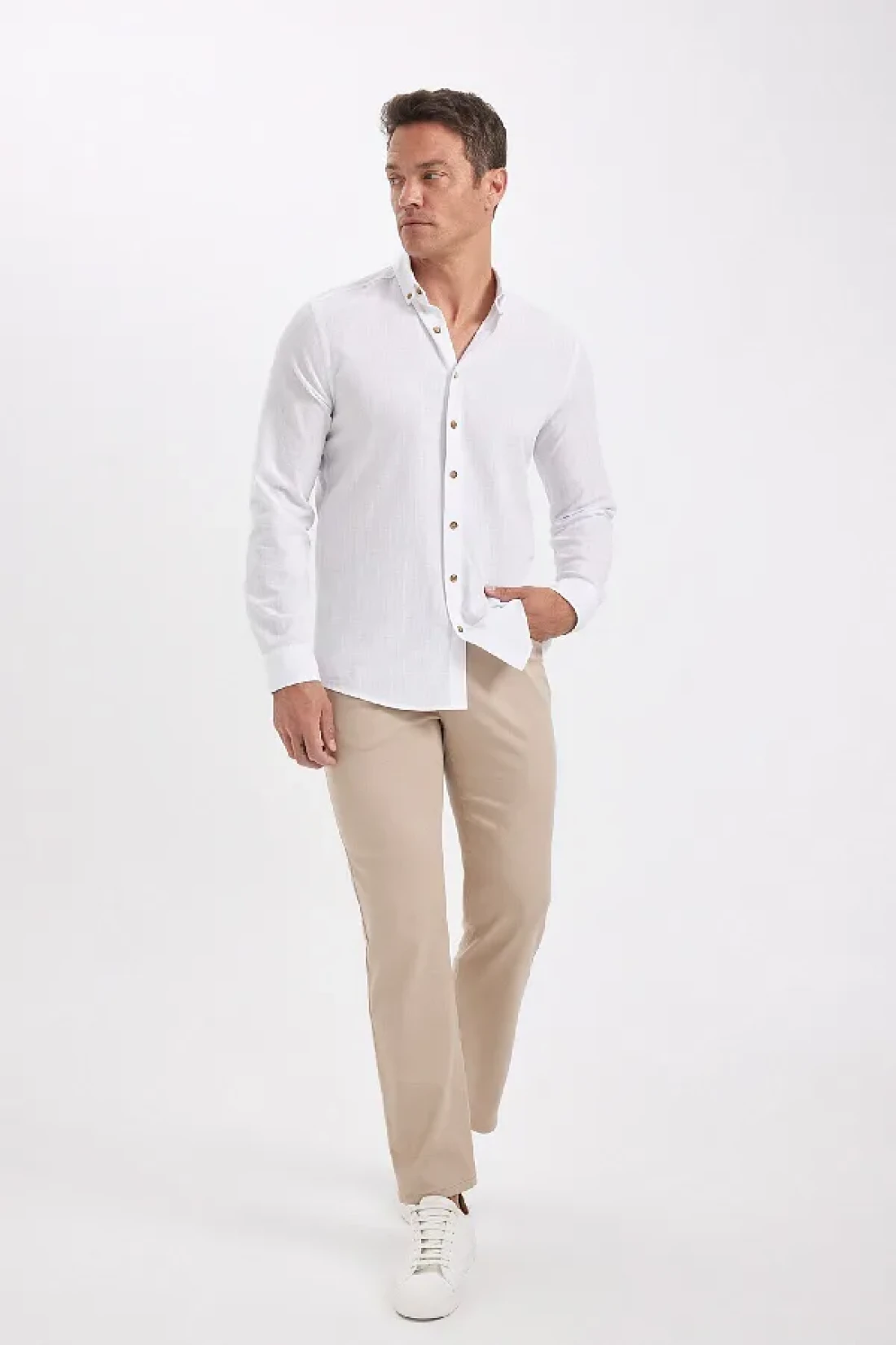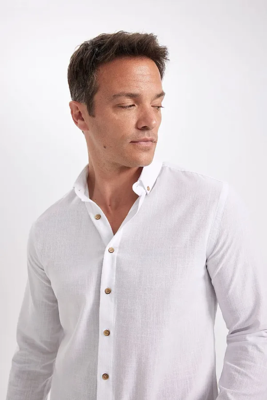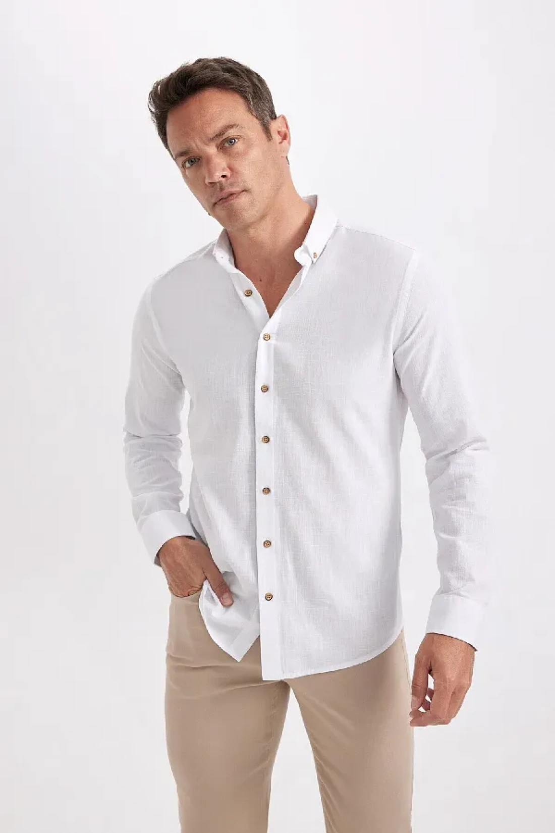 Defacto Modern Fit Buttoned Polo Neck Linen Look 100% Cotton Long Sleeve Shirt T6284Azns