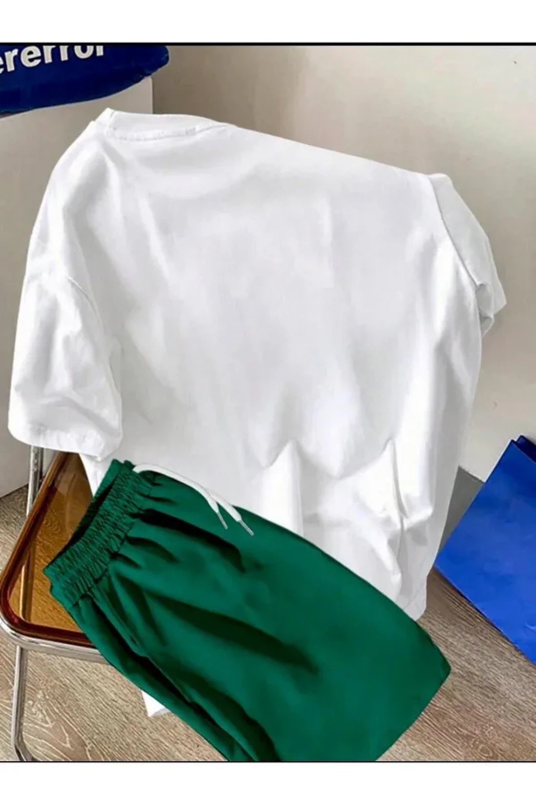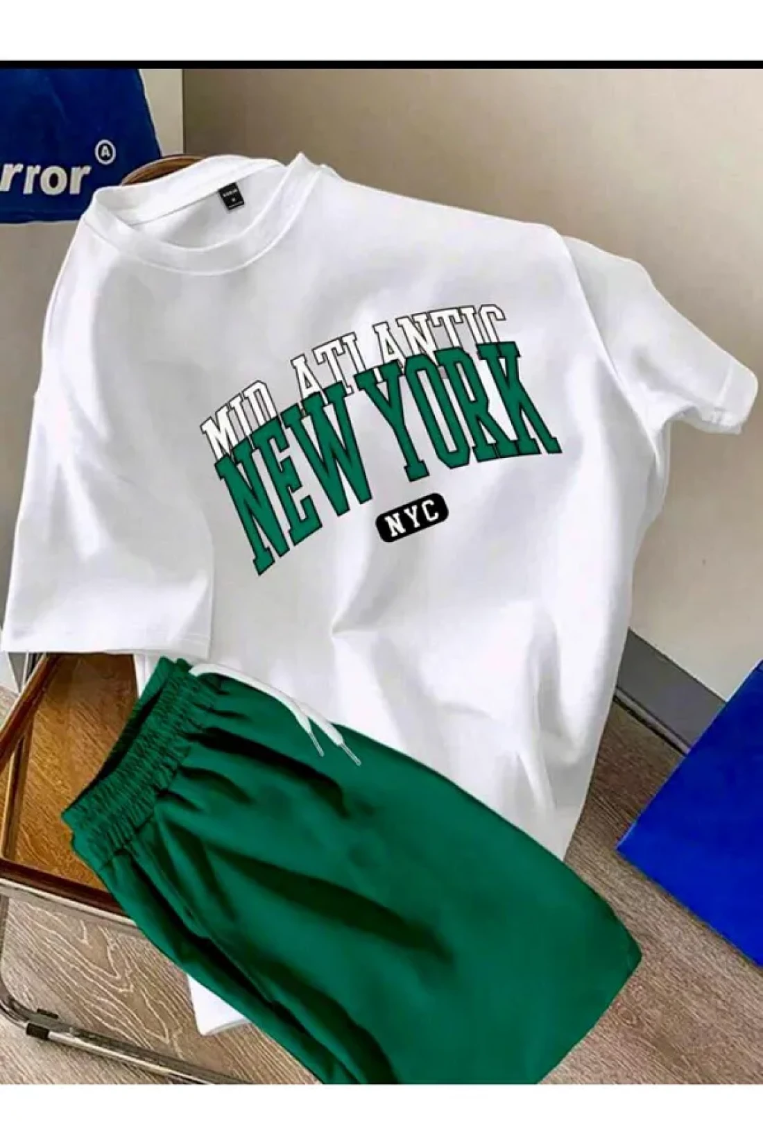 SELENA BUTİK Unisex Nyc White T-Shirt Green Shorts Top Bottom 2 Piece Set