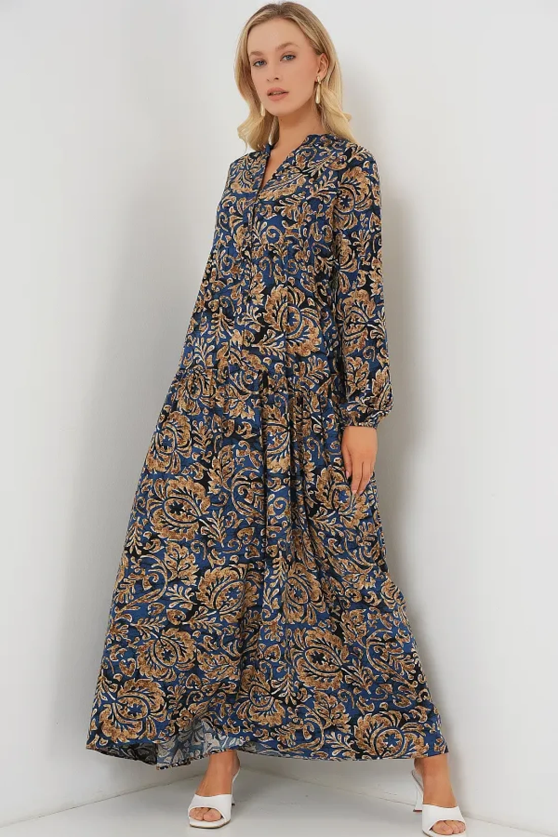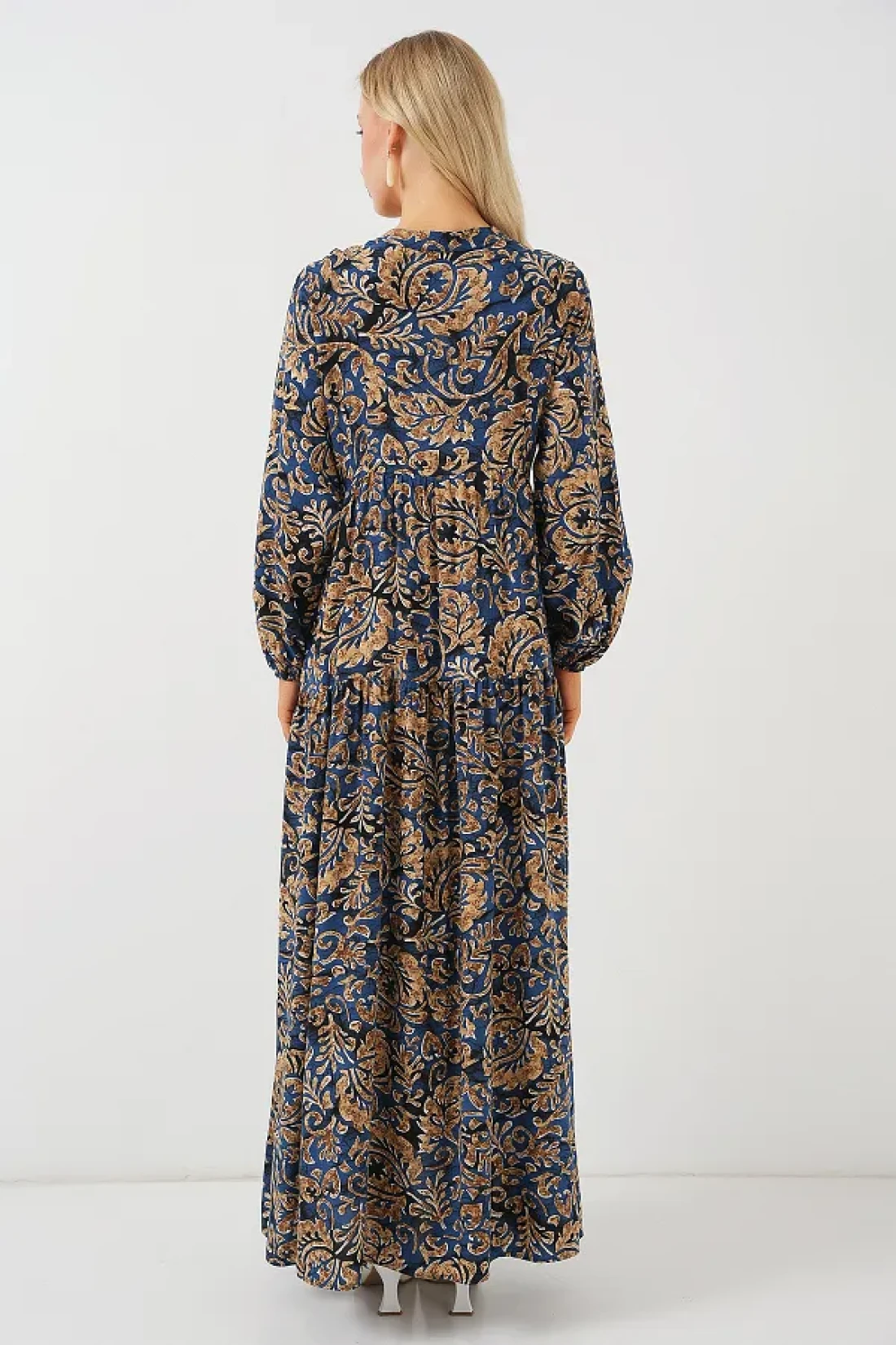 Product content: 100% viscose. product features: authentic patterned dress. model information: size: 38. product length: 136 cm. sleeve length: 60 cm. our product is unlined. Model measurements: height: 176 chest: 90 waist: 63 hips: 94 general washing and usage instructions: do not exceed 30 c to avoid damaging the product during washing. wash the product according to the washing instructions. use appropriate detergent for colored products.