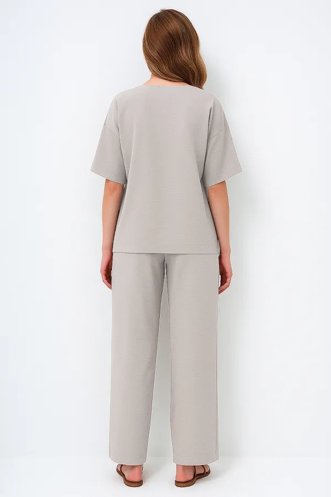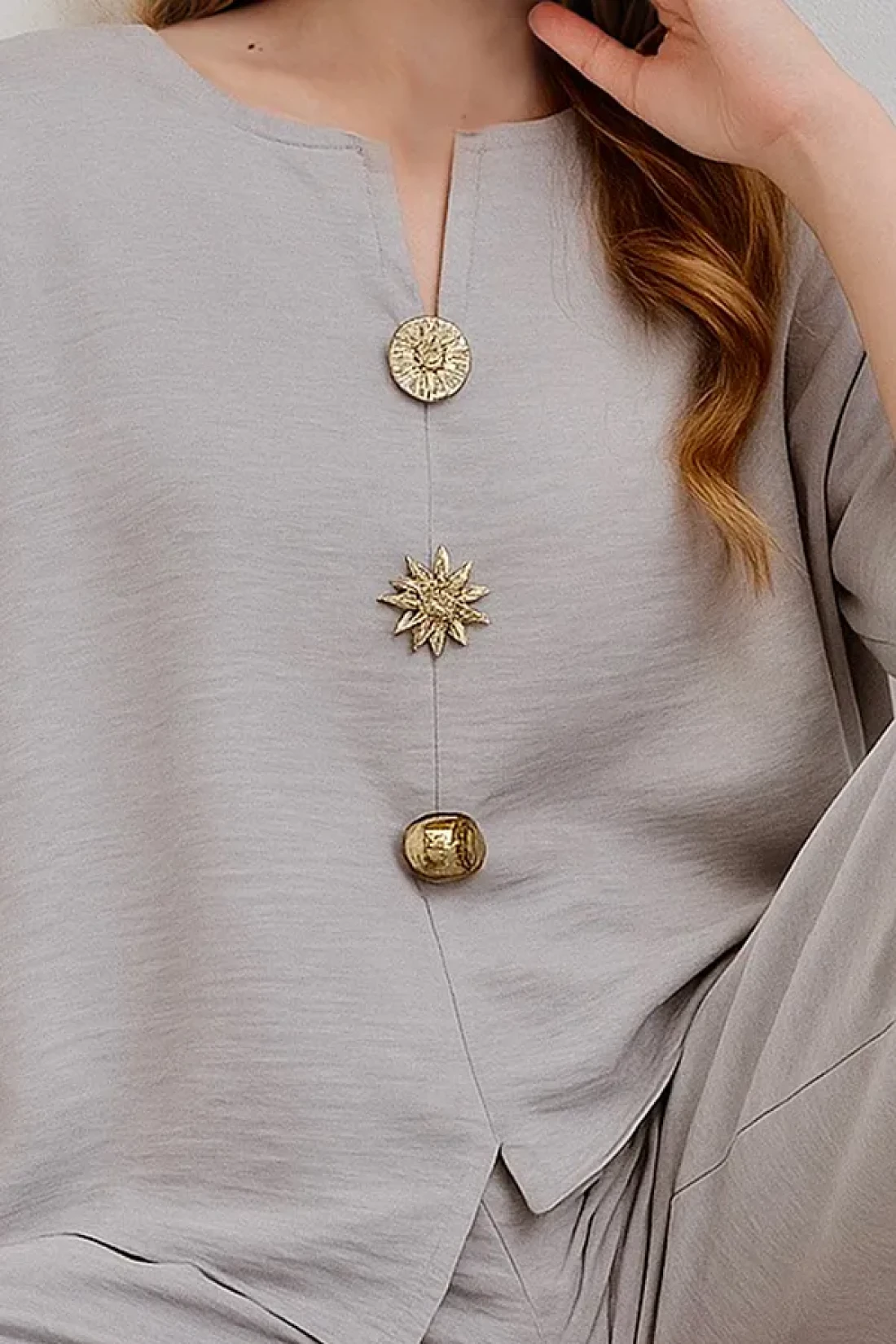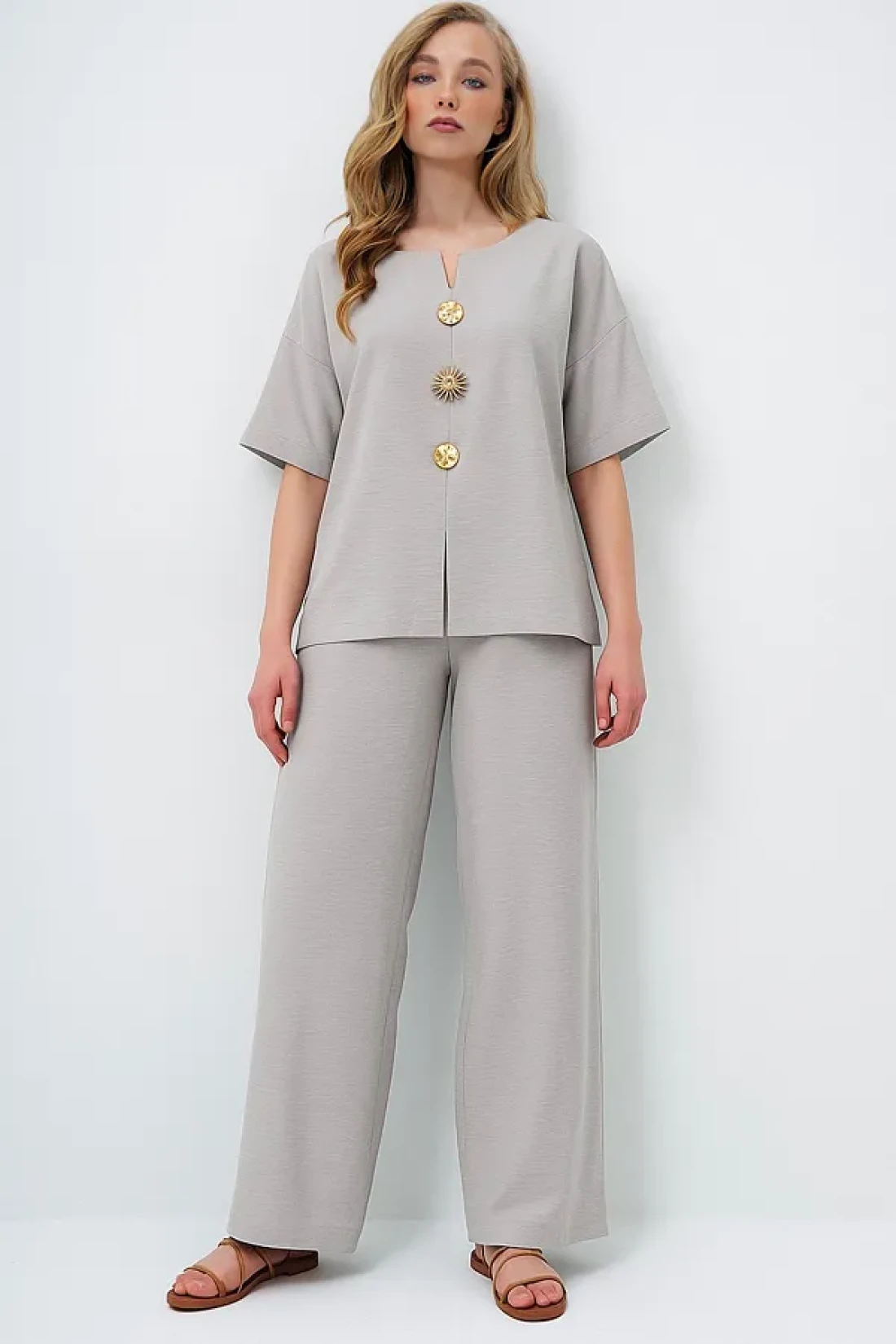 Trend Alaçatı Stili Women's Gray V-Neck Metal Gold Button Detailed Aerobin Linen Blouse and Trousers Set Alc-X14122