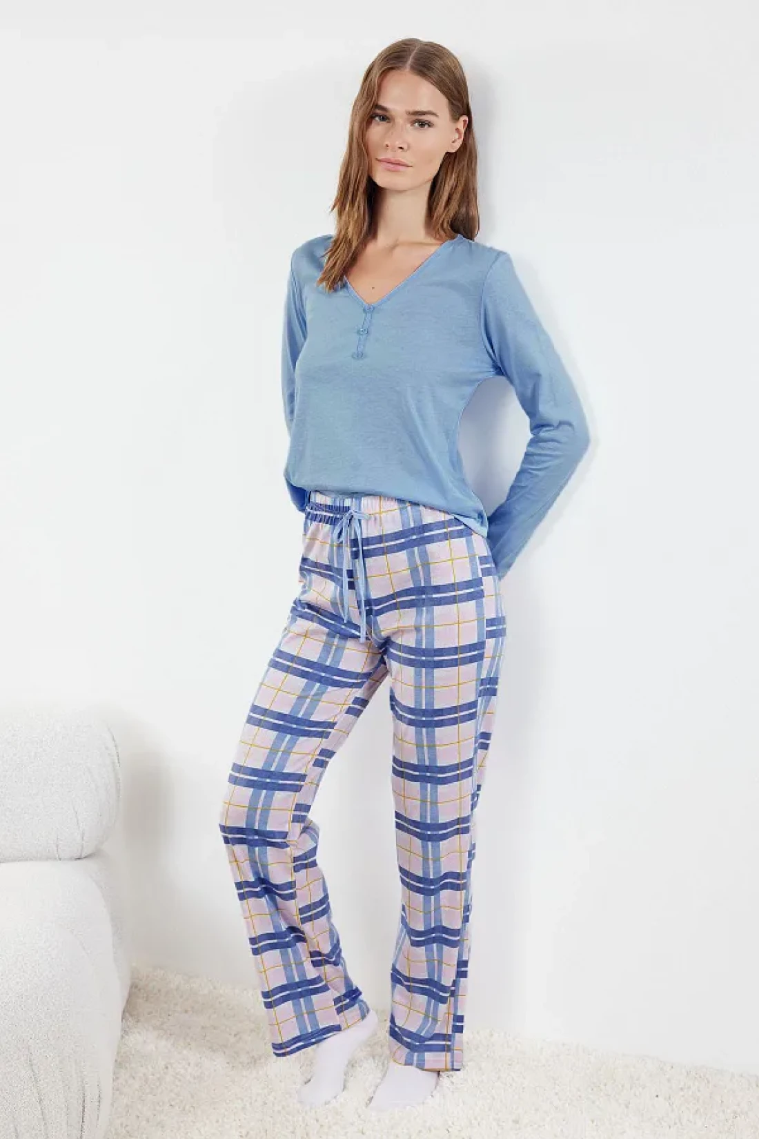 Collection 100% Cotton Blue PlaiD Pajamas Set - Lacing anD Button DetaileD THMAW25PT00004