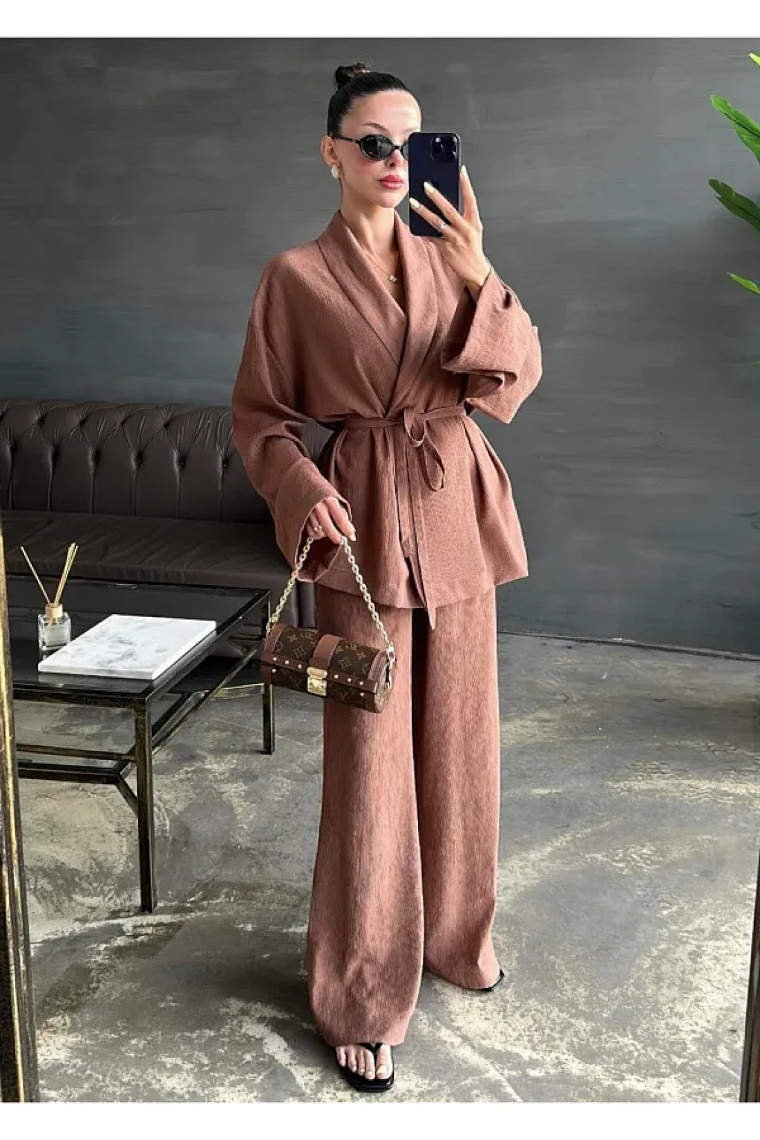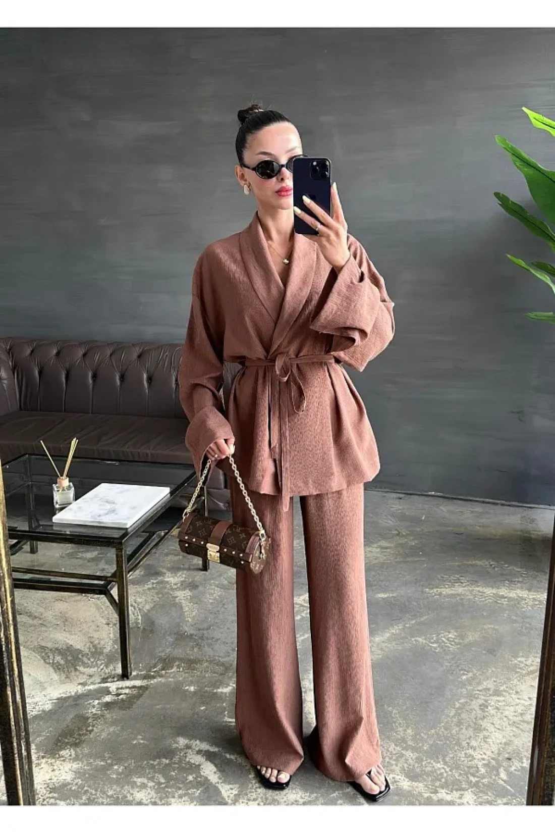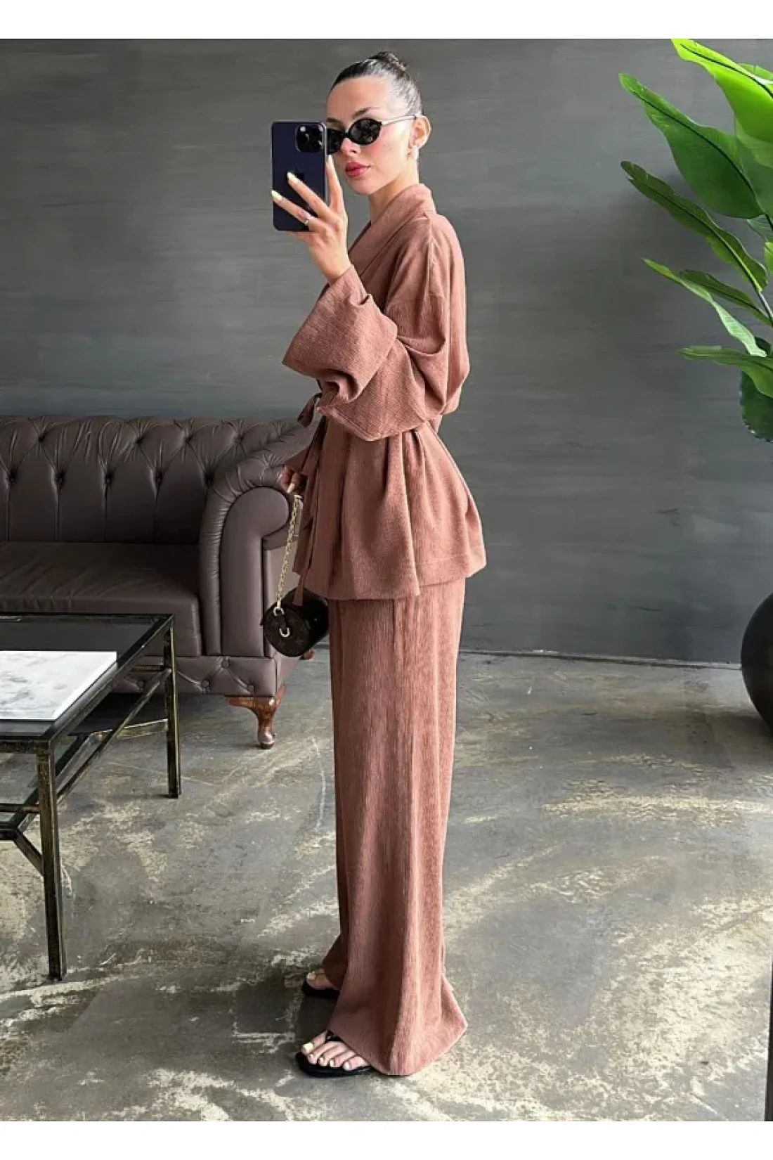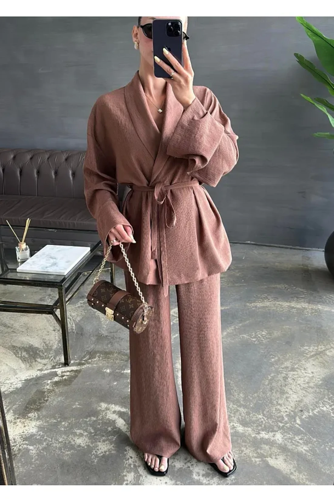 My Blog Brown Shawl Collar Kimono Pants Set - 98655