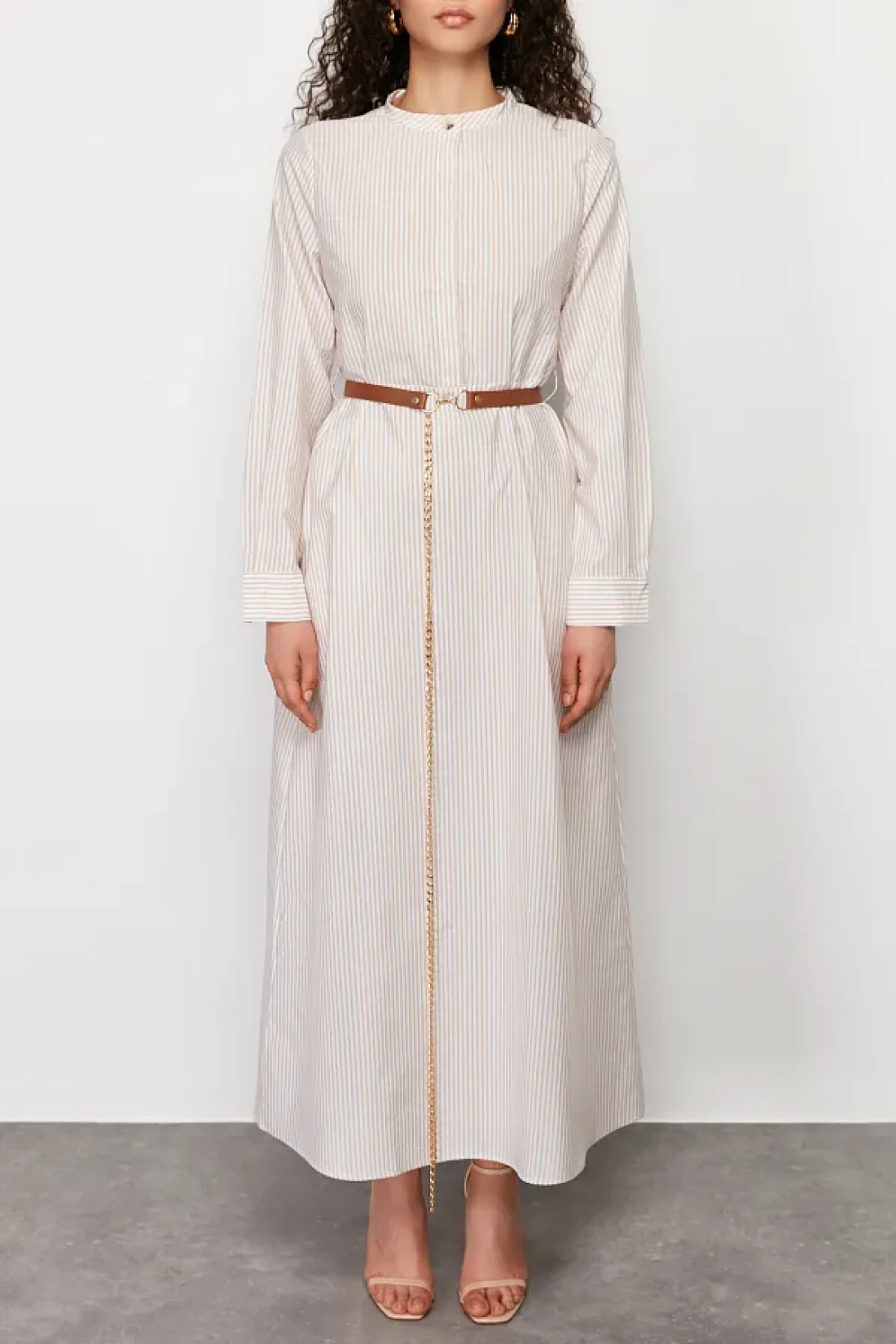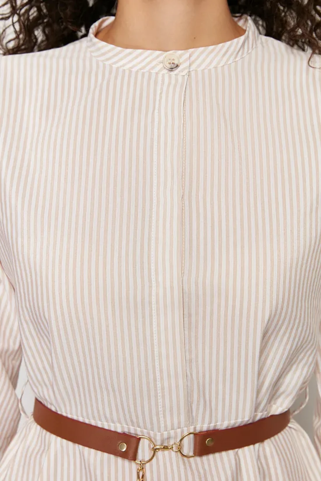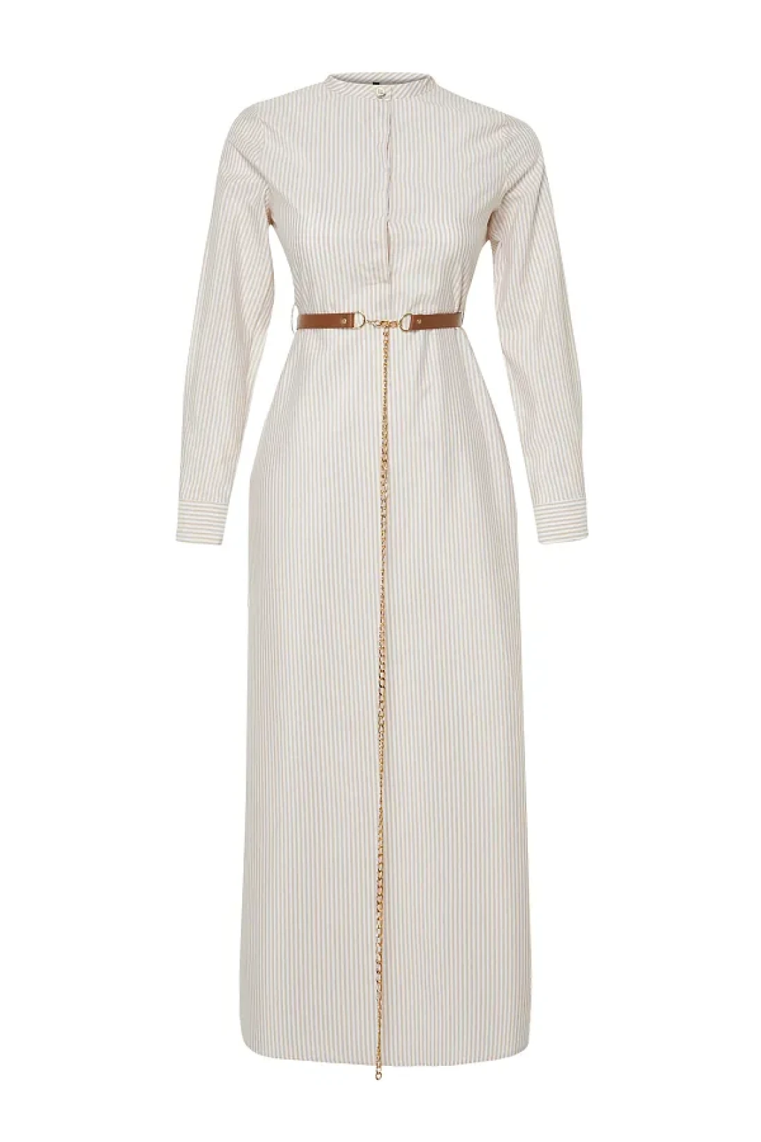Modest Beige Striped Belt Detailed Woven Dress TCTSS24EB00171