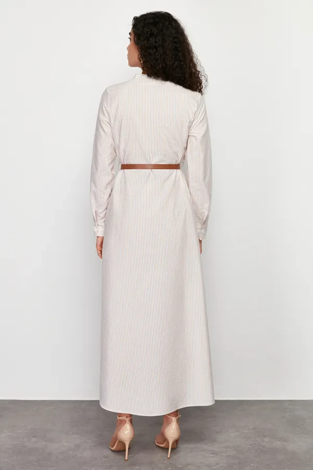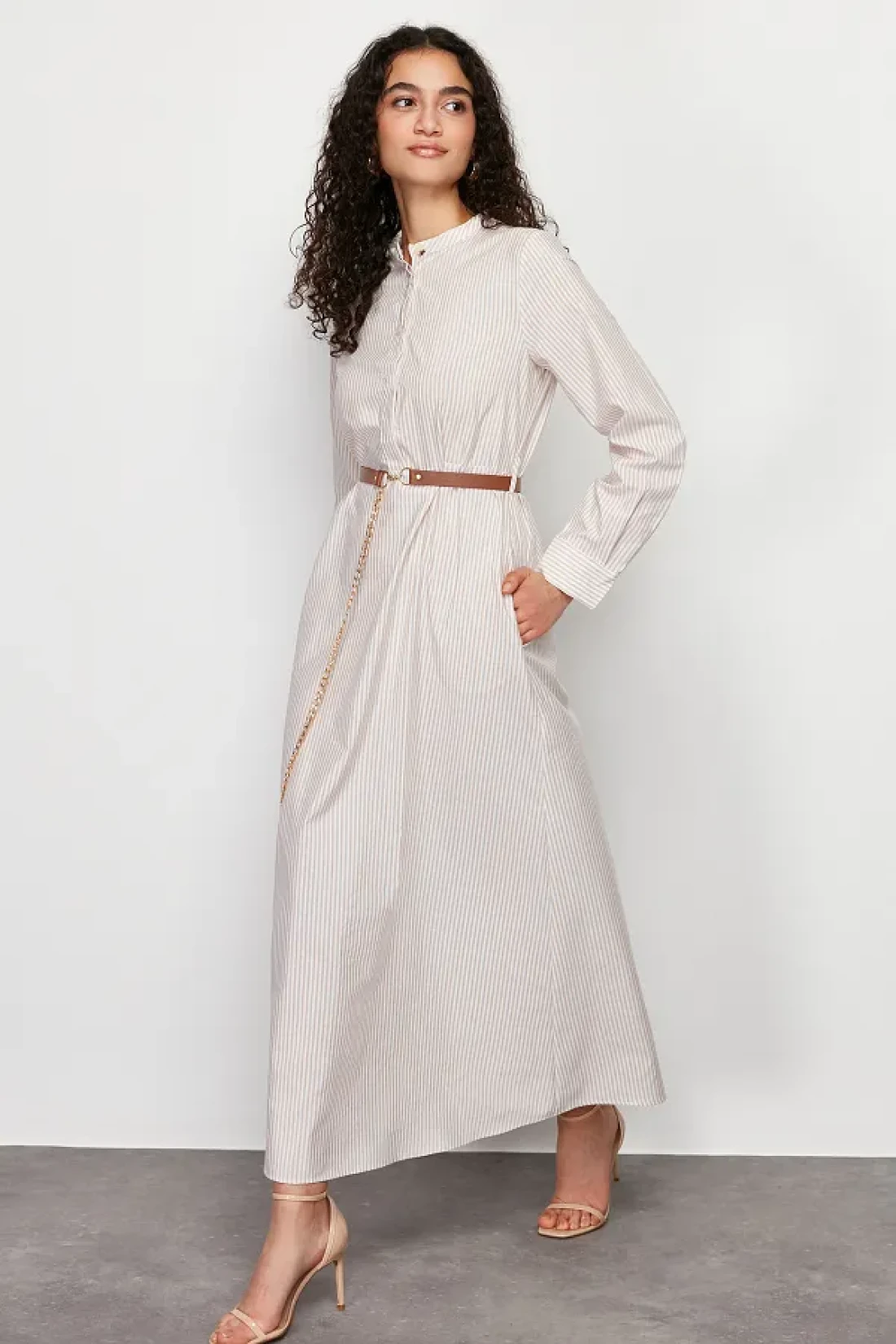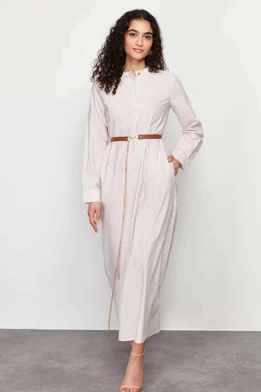 Modest Beige Striped Belt Detailed Woven Dress TCTSS24EB00171