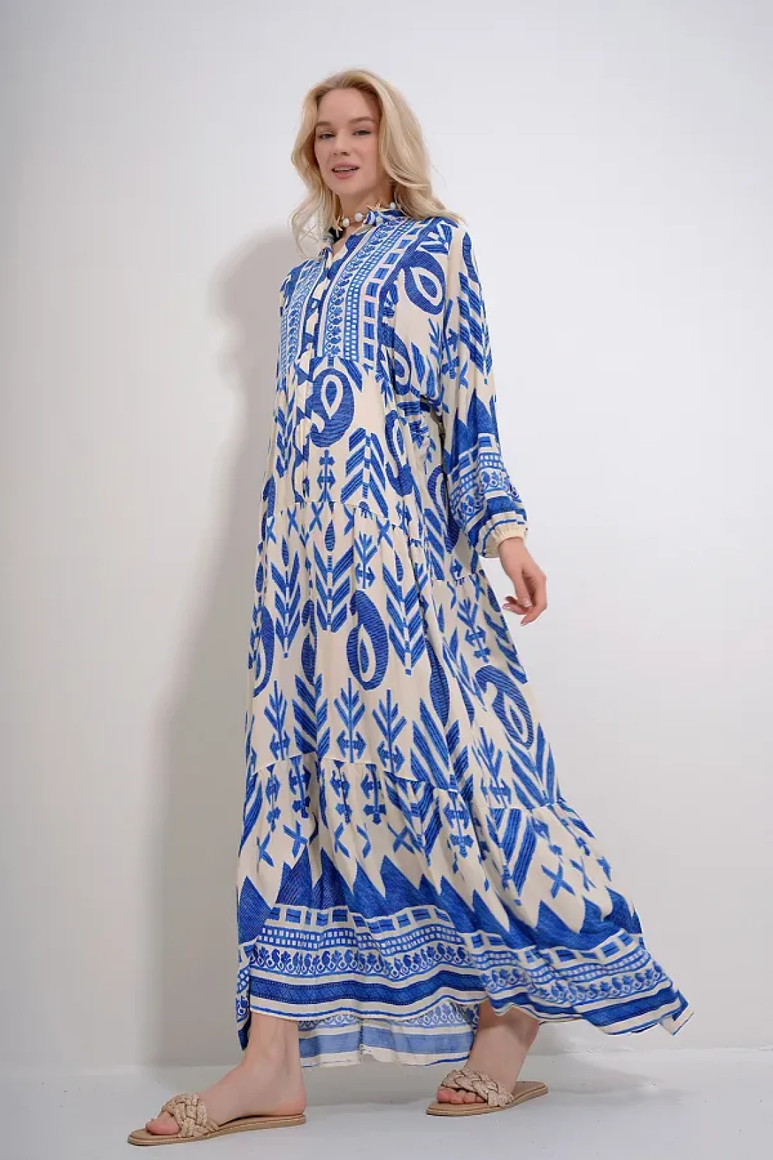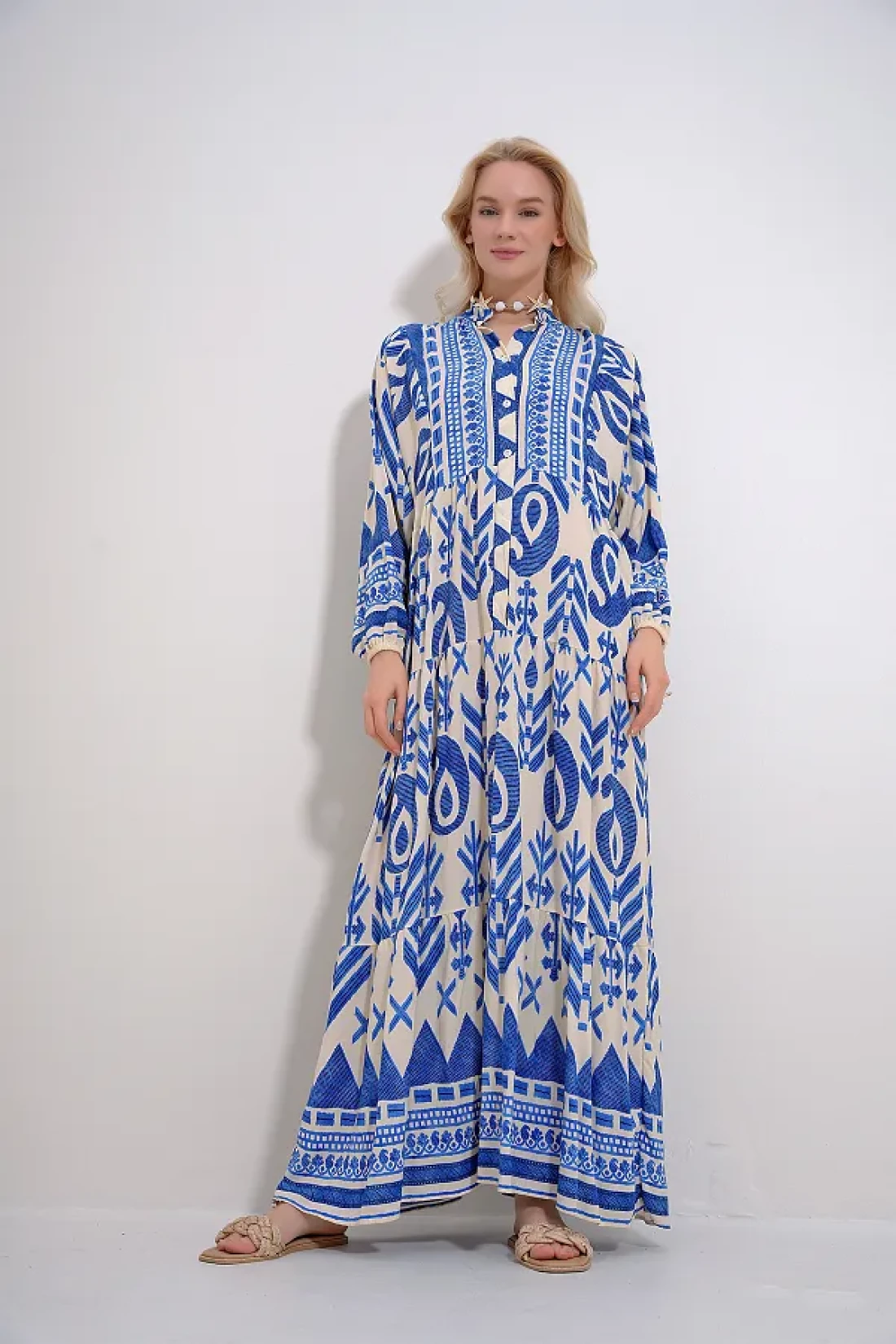 Trend Alaçatı Stili Women's Blue Magnifying Collar Buttoned Skirt Flounced Patterned Maxiboy Dress ALC-X12037