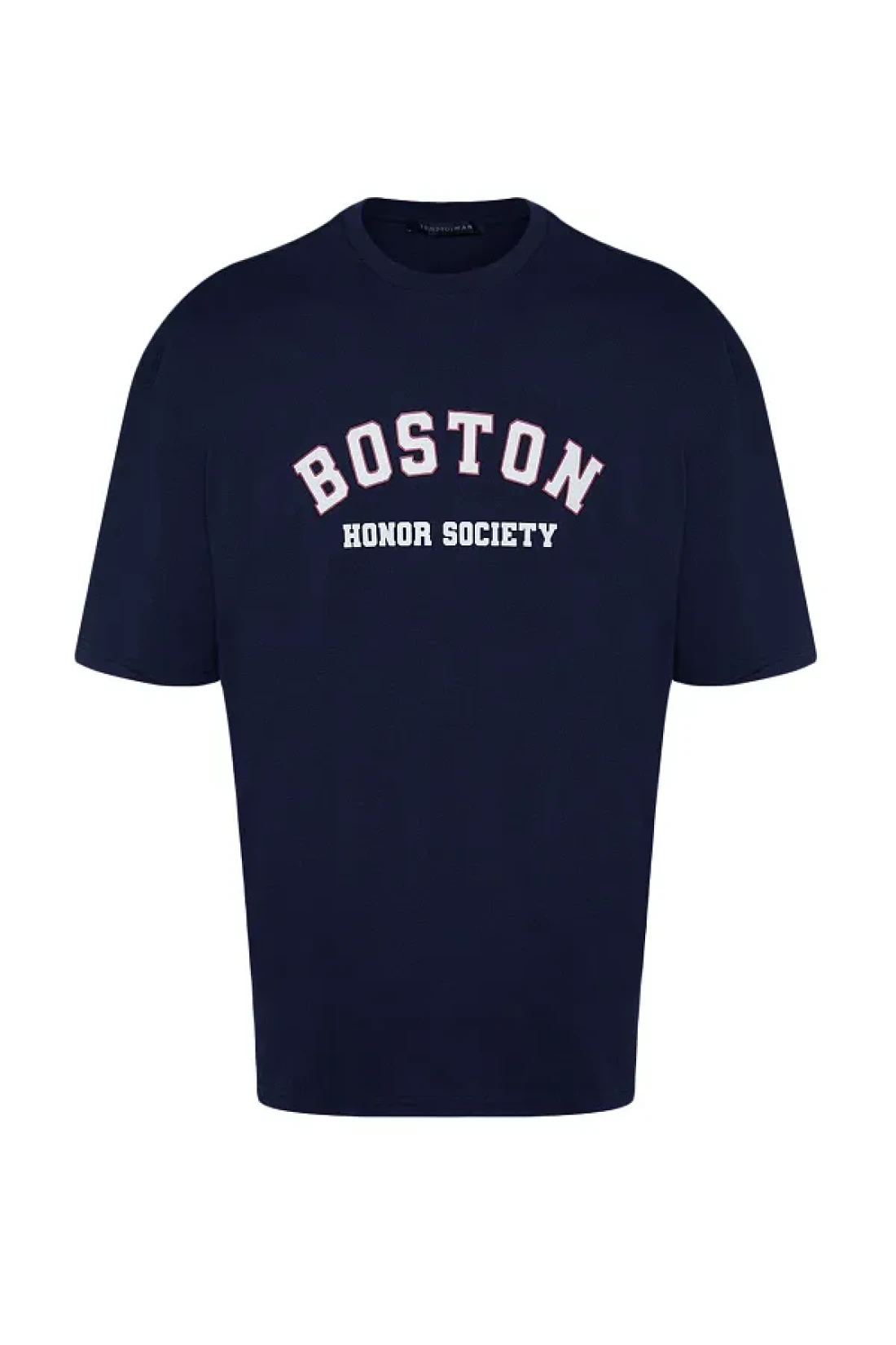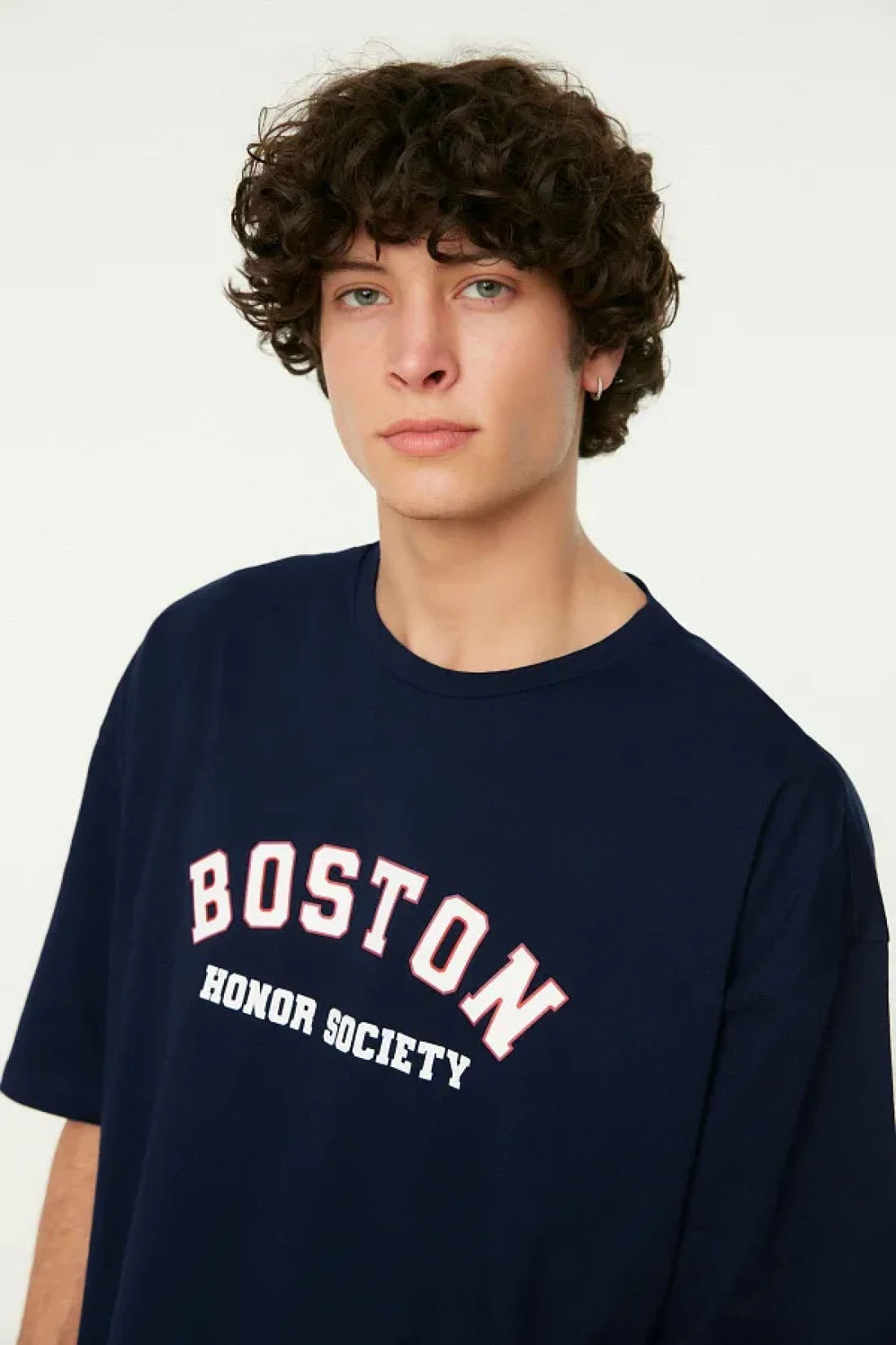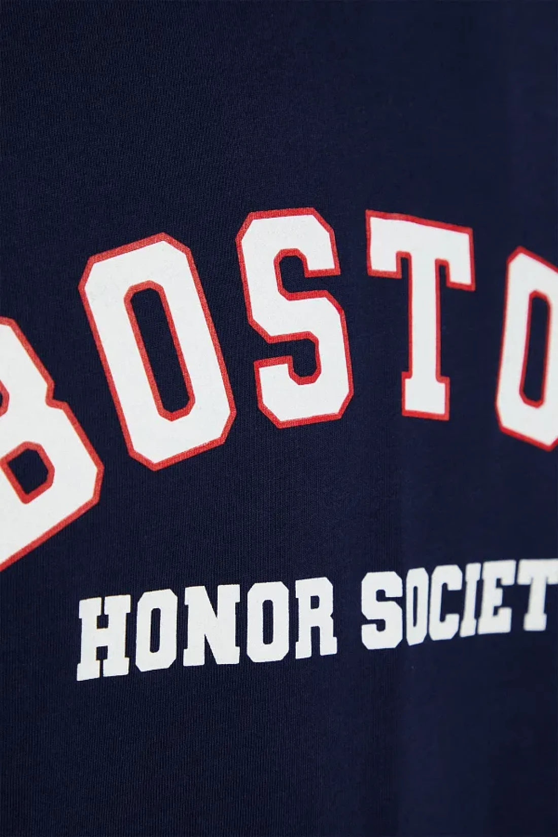 Collection Navy Blue Oversize Socks, Short Sleeve Boston Printed Cotton T-Shirt