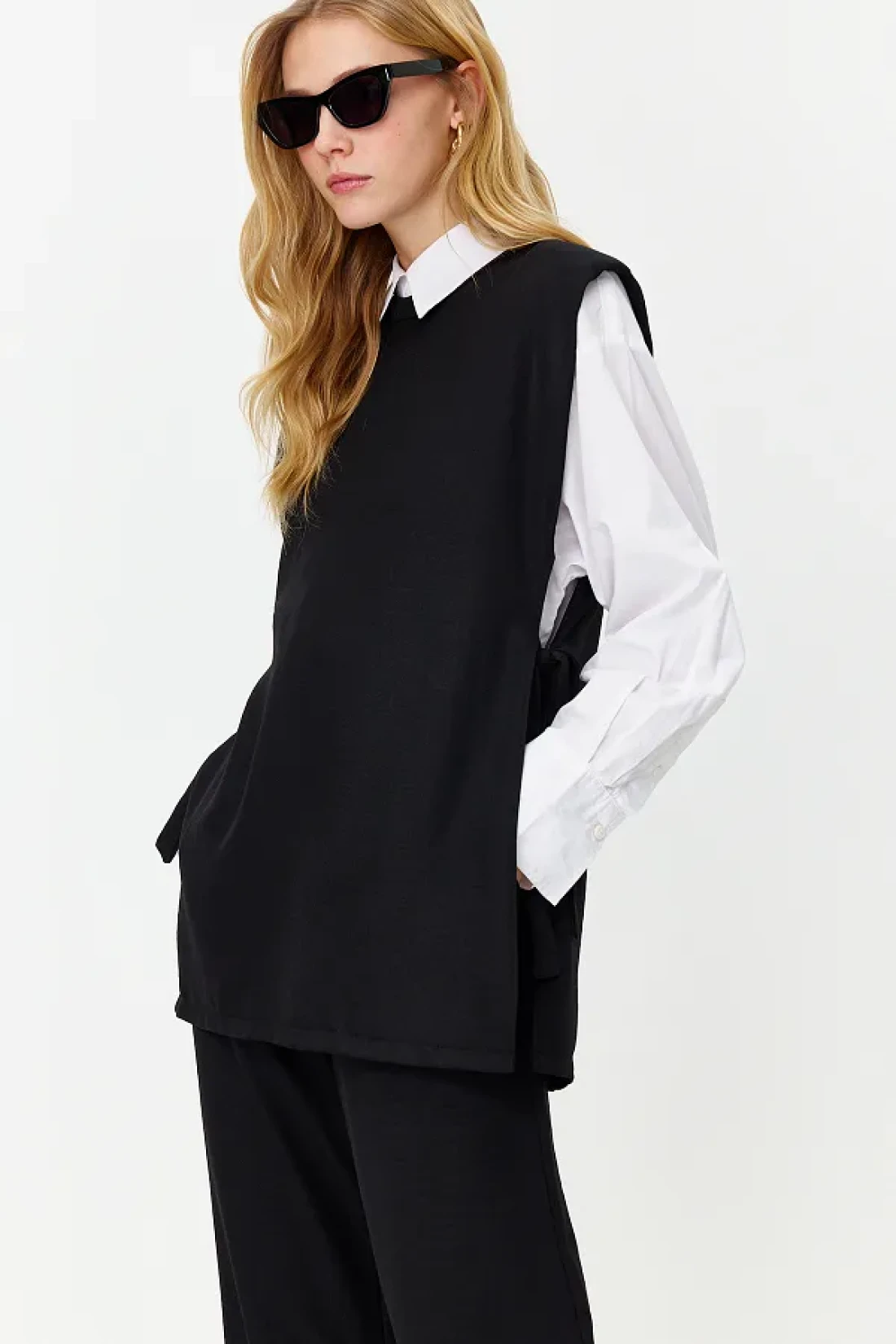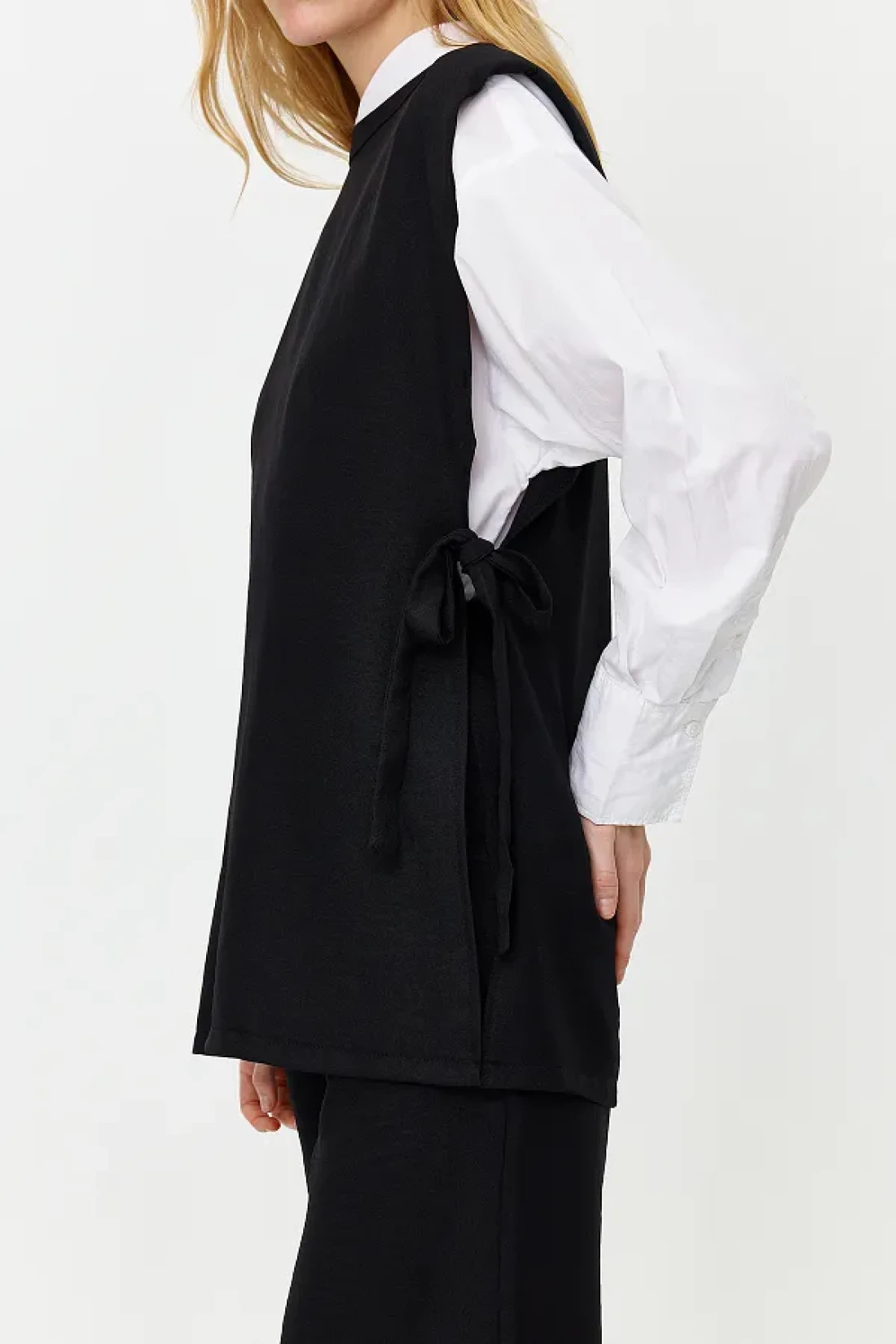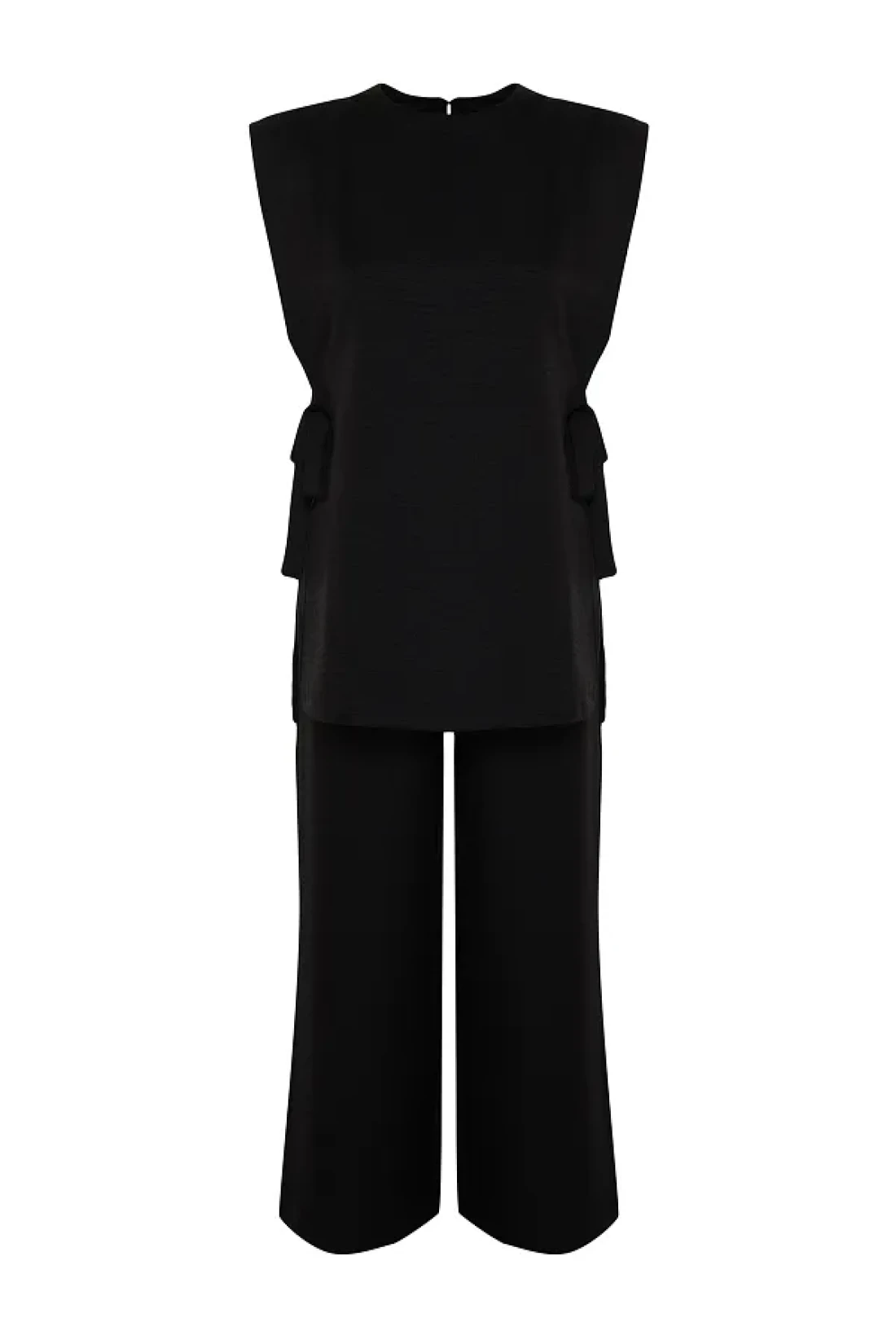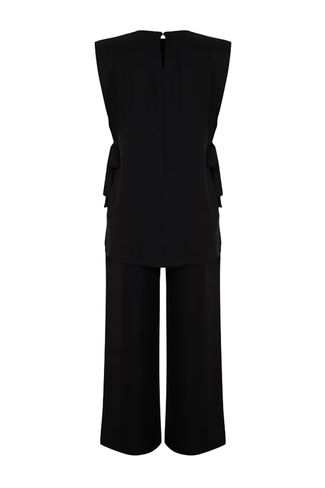 Modest Black Linen Look Side Tie Woven Bottom Top Set TCTSS24US0001