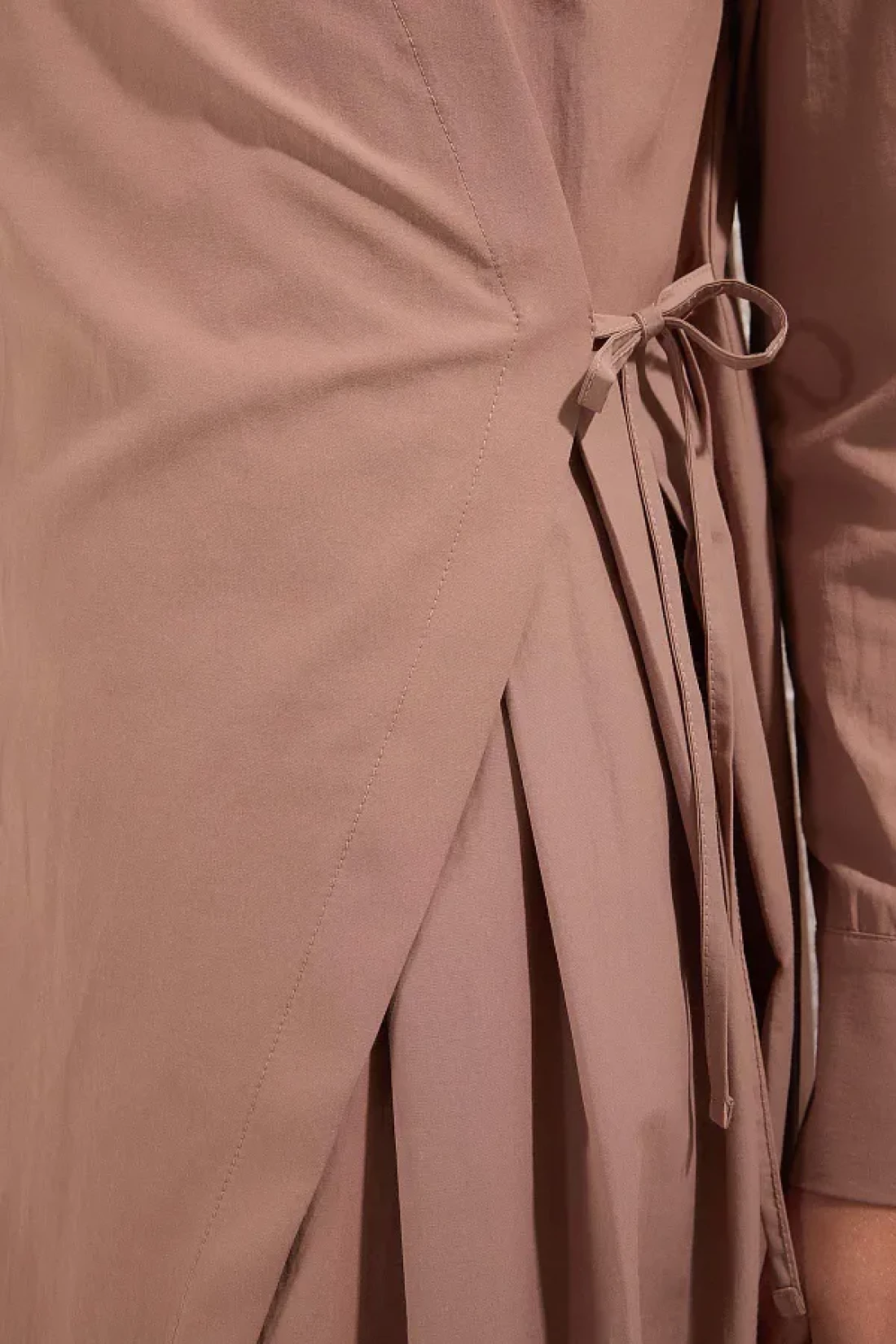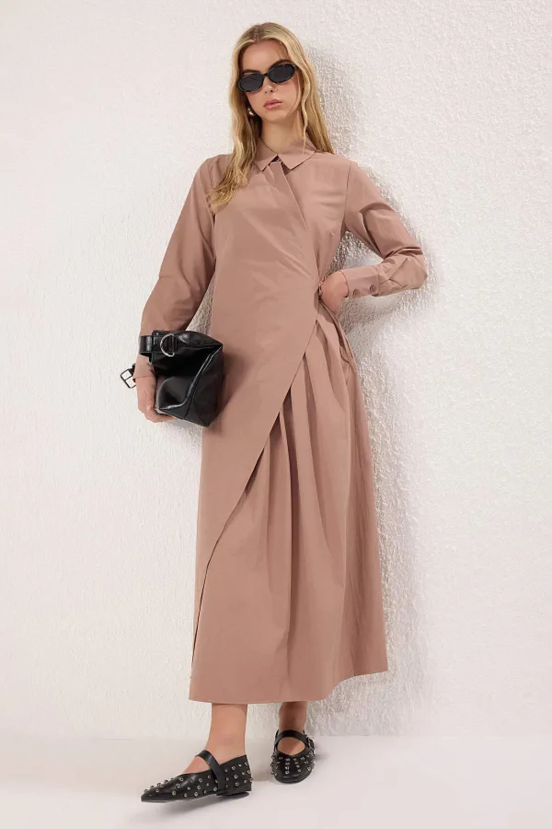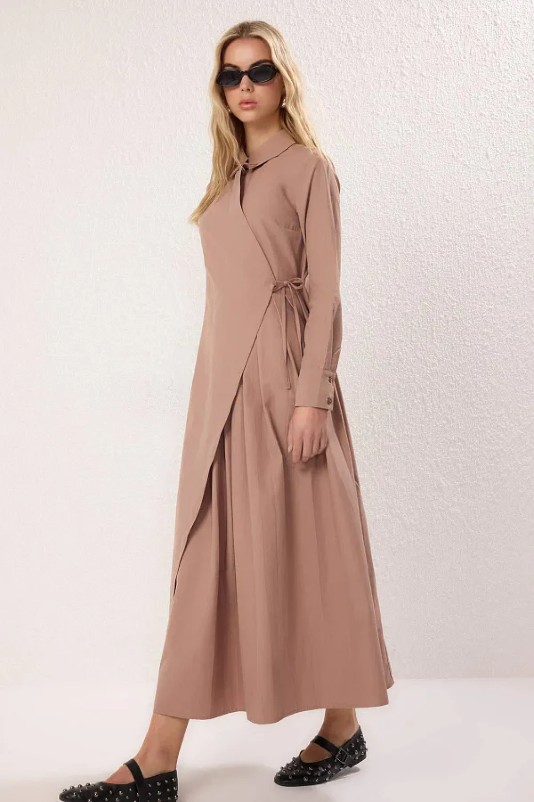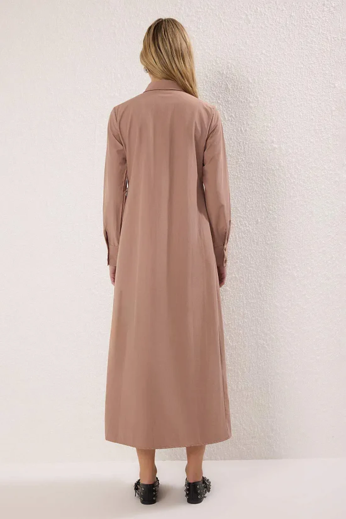 Modest Camel Double Breasted Closure Pleated Cotton Woven Dress Tctss25Eb00065