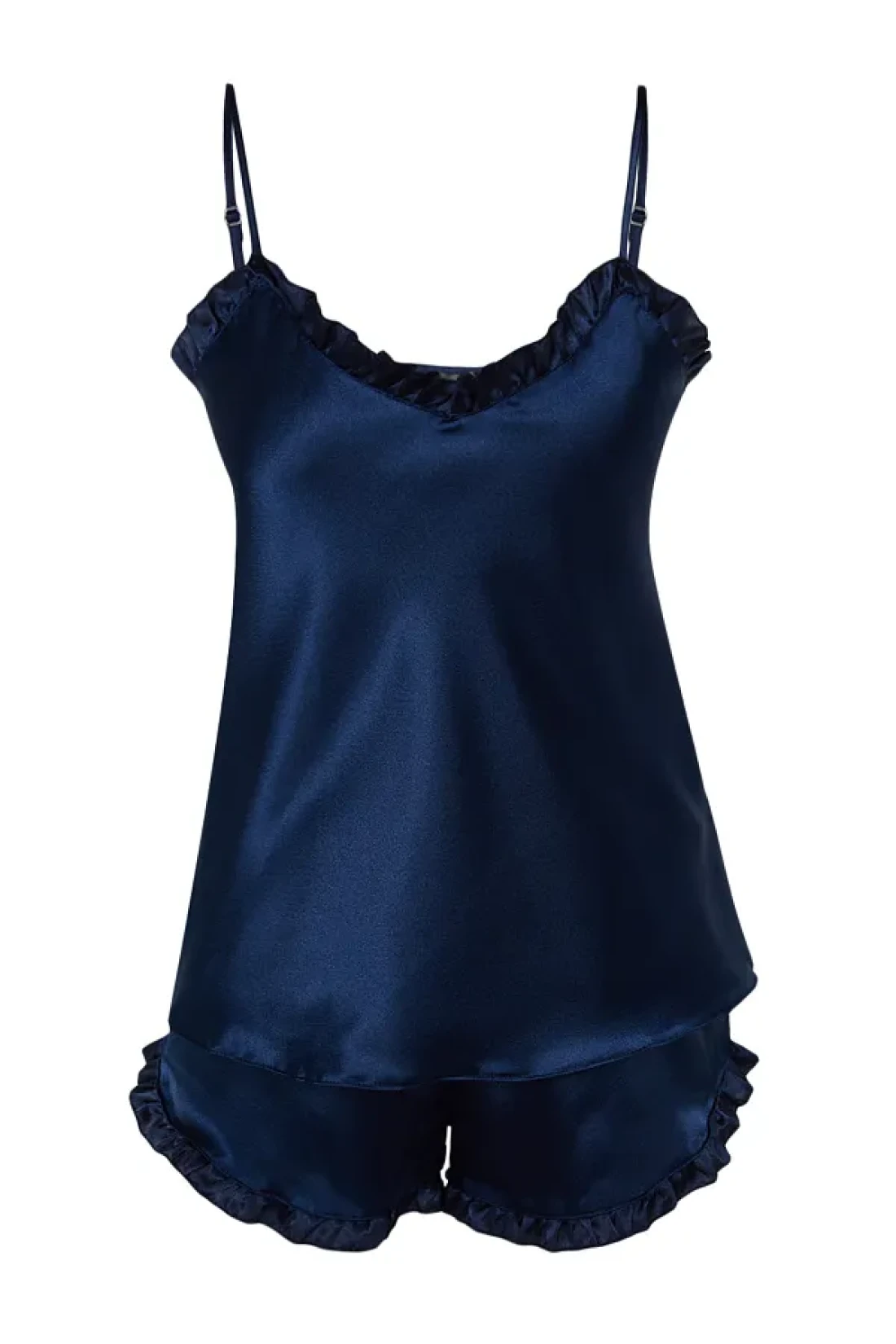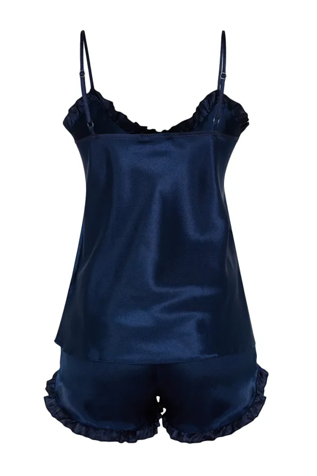 Collection Navy Blue Ruffled Rope Strap Satin Shorts Woven Pajamas Set Thmss22Pt0274