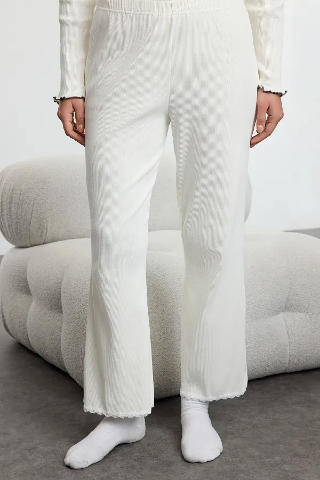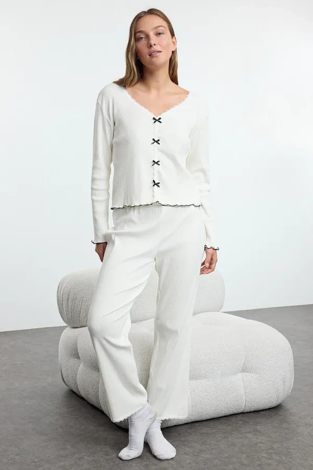 Collection White Cotton Lace and Ribbon/Bow Detail Ribbed Knitted Pajamas Set Thmaw25Pt00206