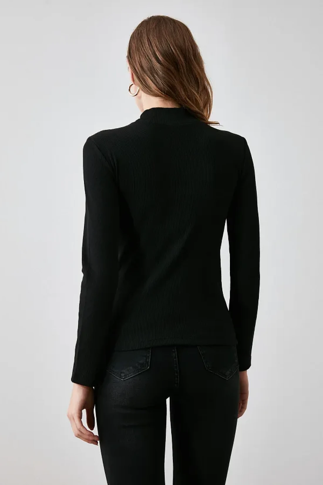A black blouse that appeals to all age groups and offers comfortable use with its straight cut. Design that fits the body and gives a stylish look thanks to its slim fit It can be easily preferred in any environment with its casual style suitable for daily use. With its plain pattern, it creates a simple and timeless style, while its medium thickness provides ideal comfort during seasonal transitions. The knitted fabric structure offers flexibility and durability, granting freedom of movement