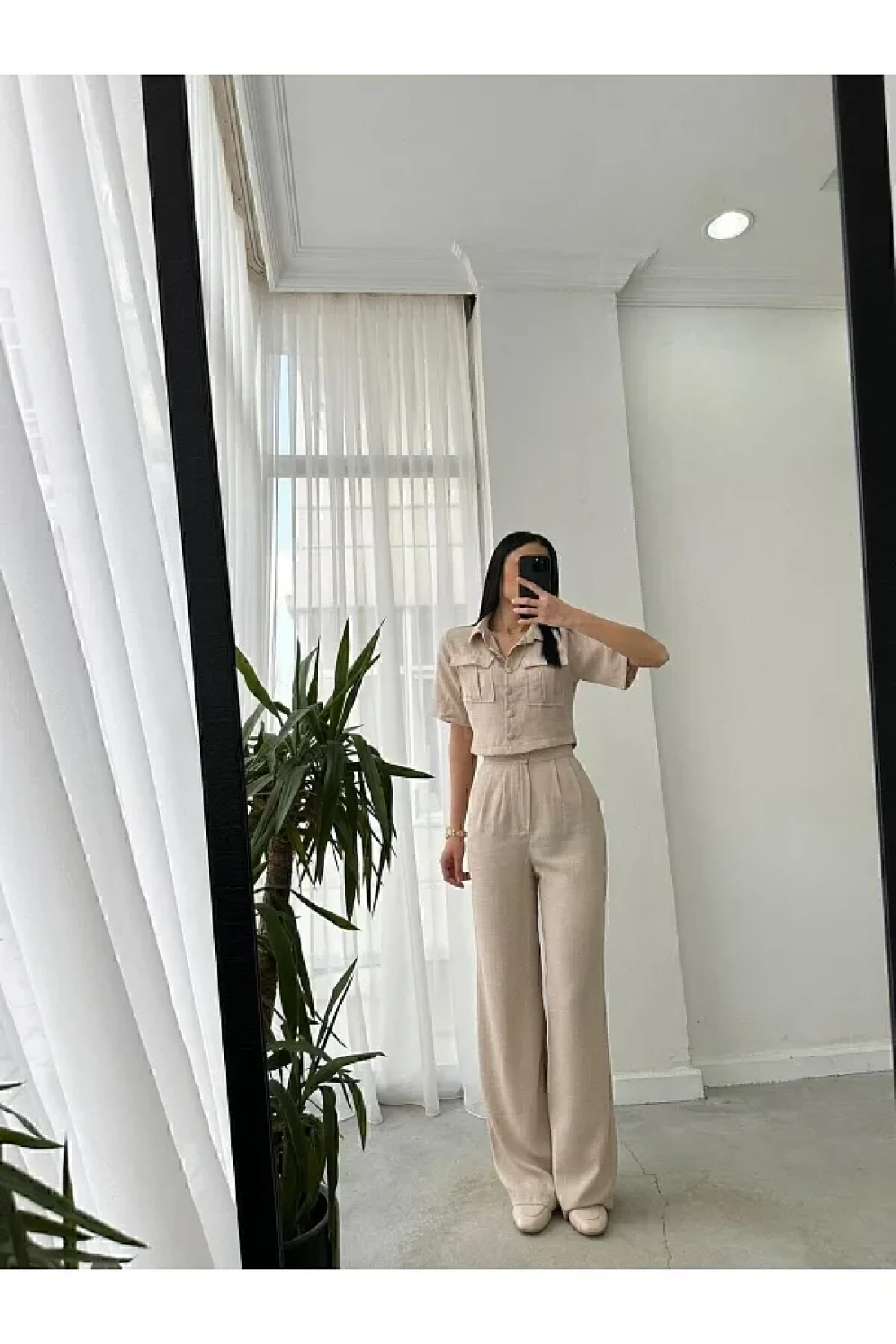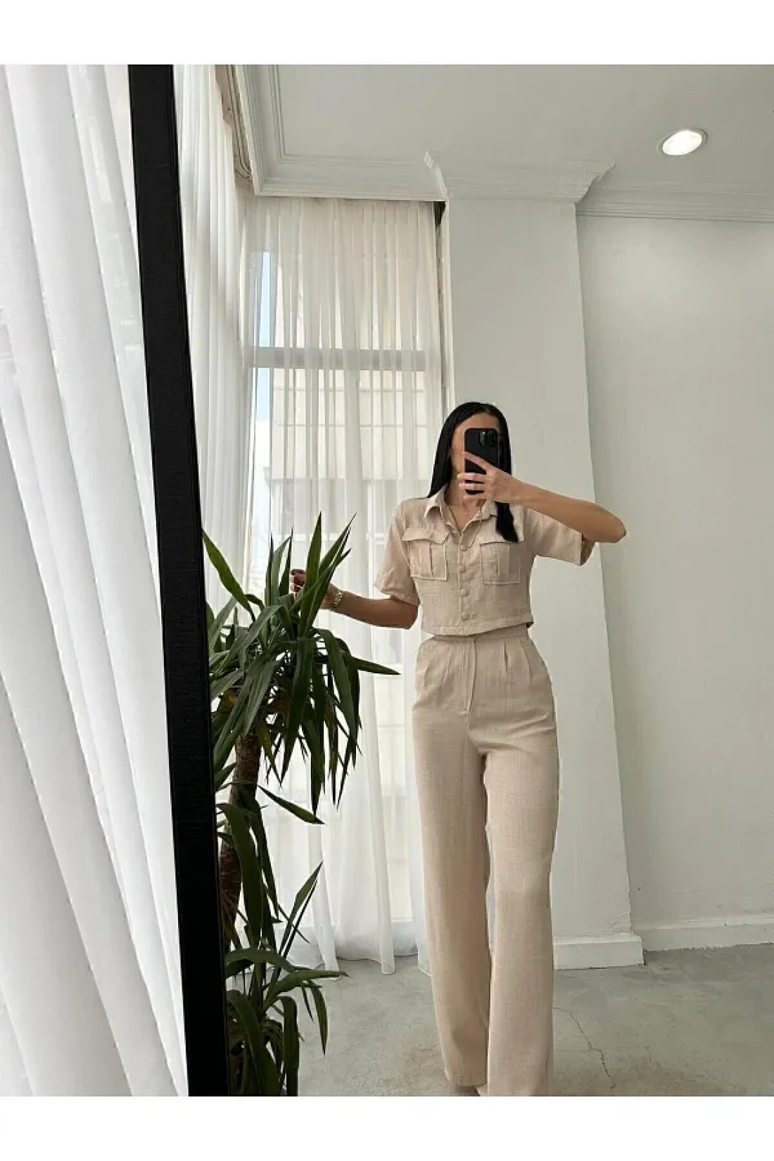 butik derin Cotas Linen Shirt Jacket Trousers Women's Set Stone