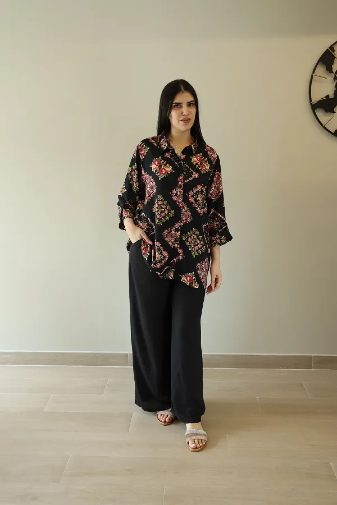 • Solid Black Pants: the matching solid black pants complement the printed shirt effortlessly, making it perfect for both casual and semi-formal occasions.