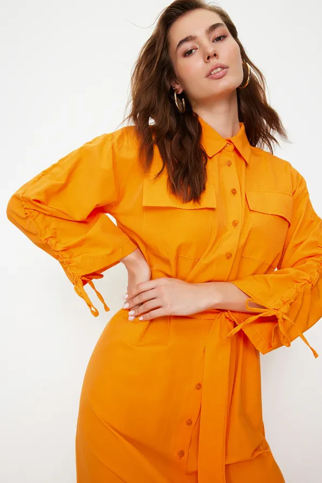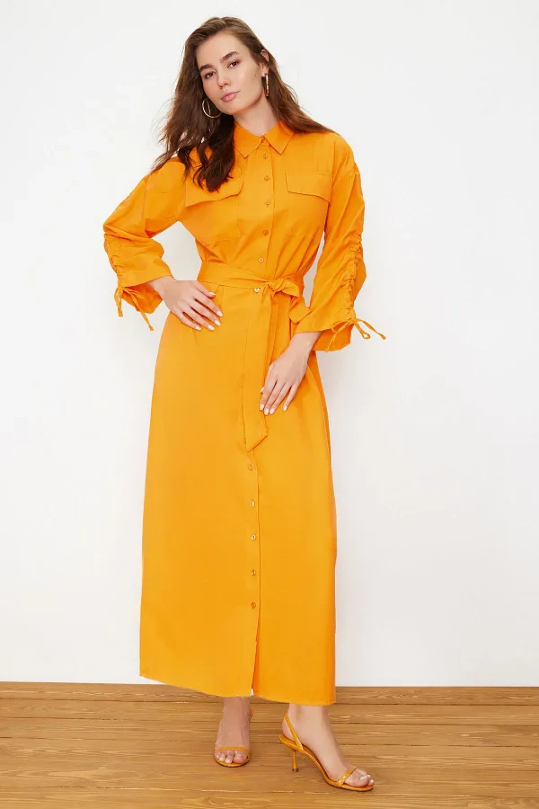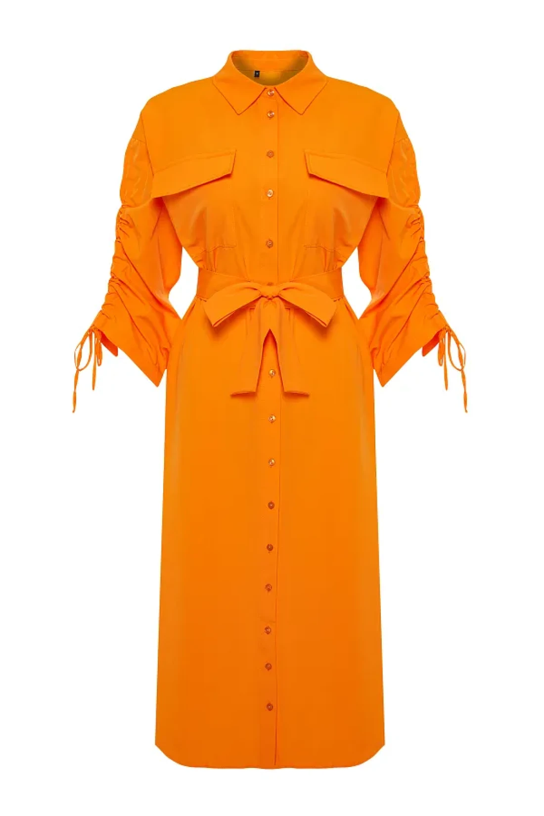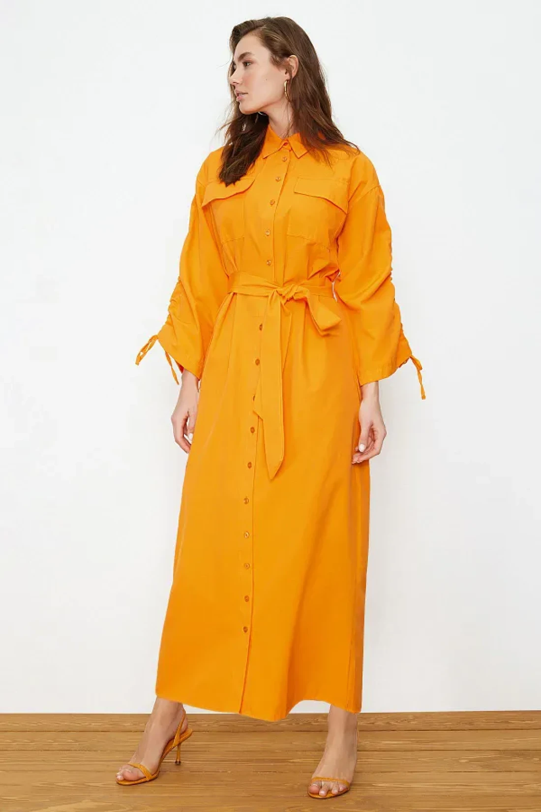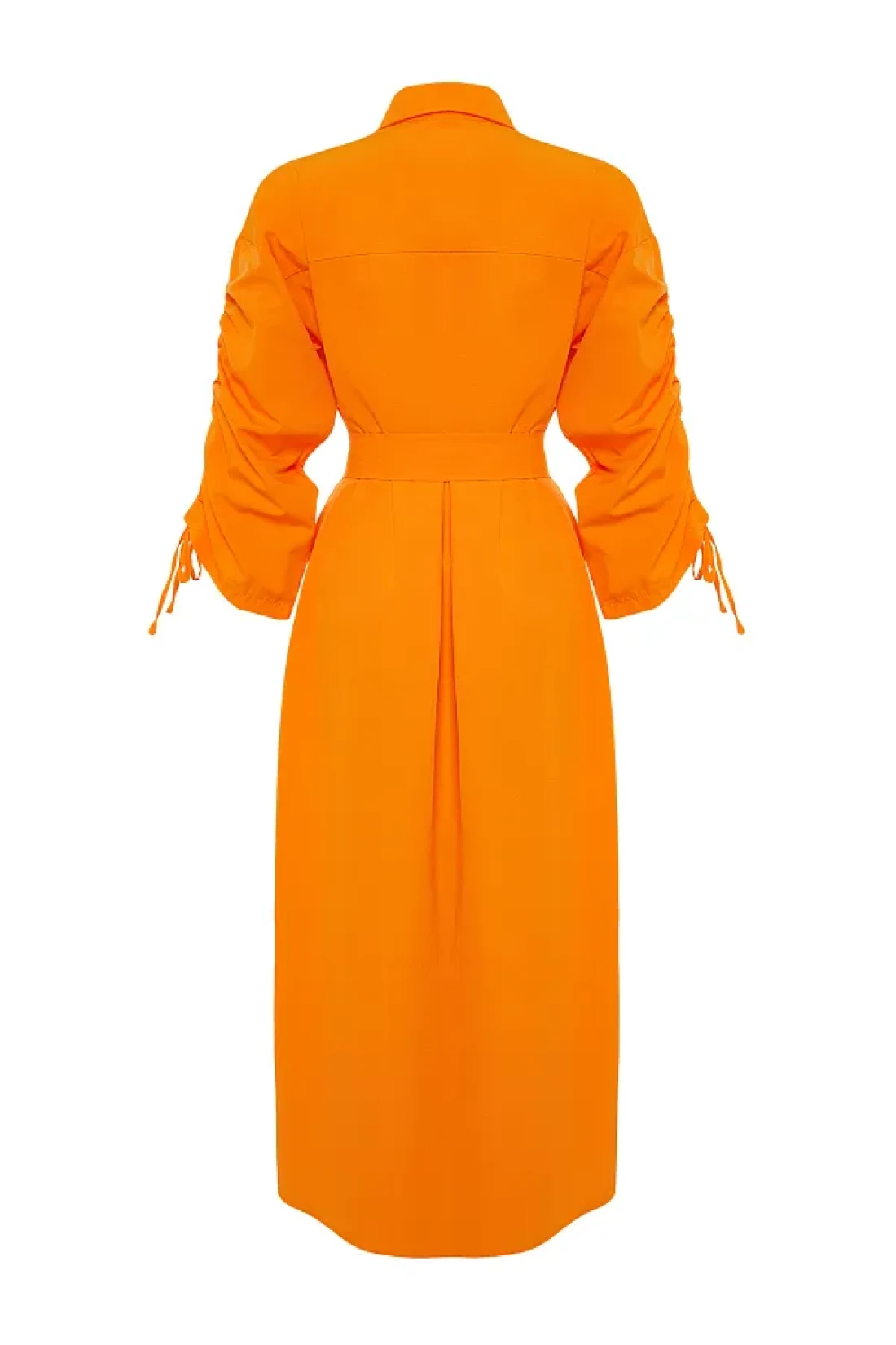 Modest Orange Belted Sleeves Adjustable Detail Button Cotton Woven Shirt Dress Tctss23Eb00365