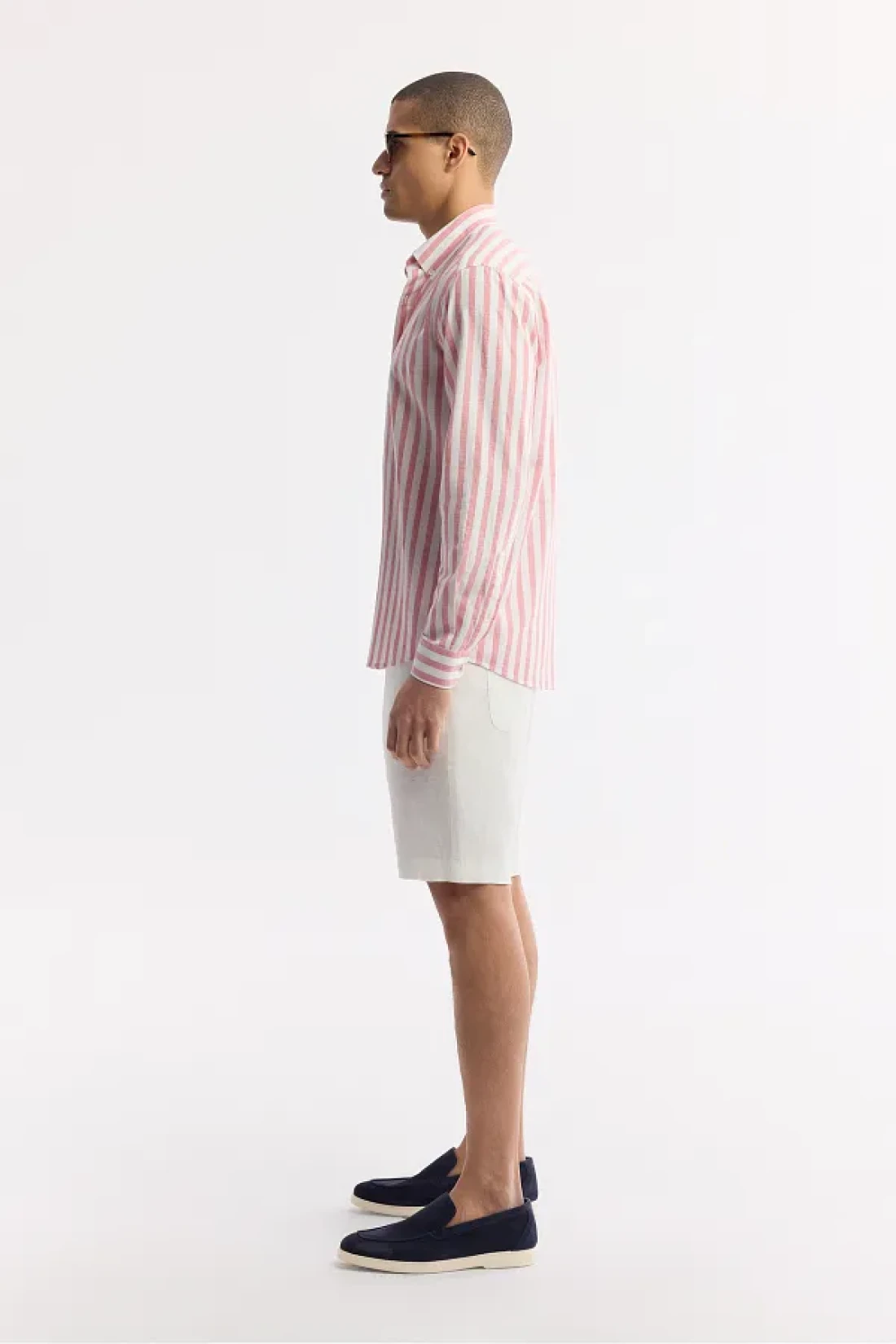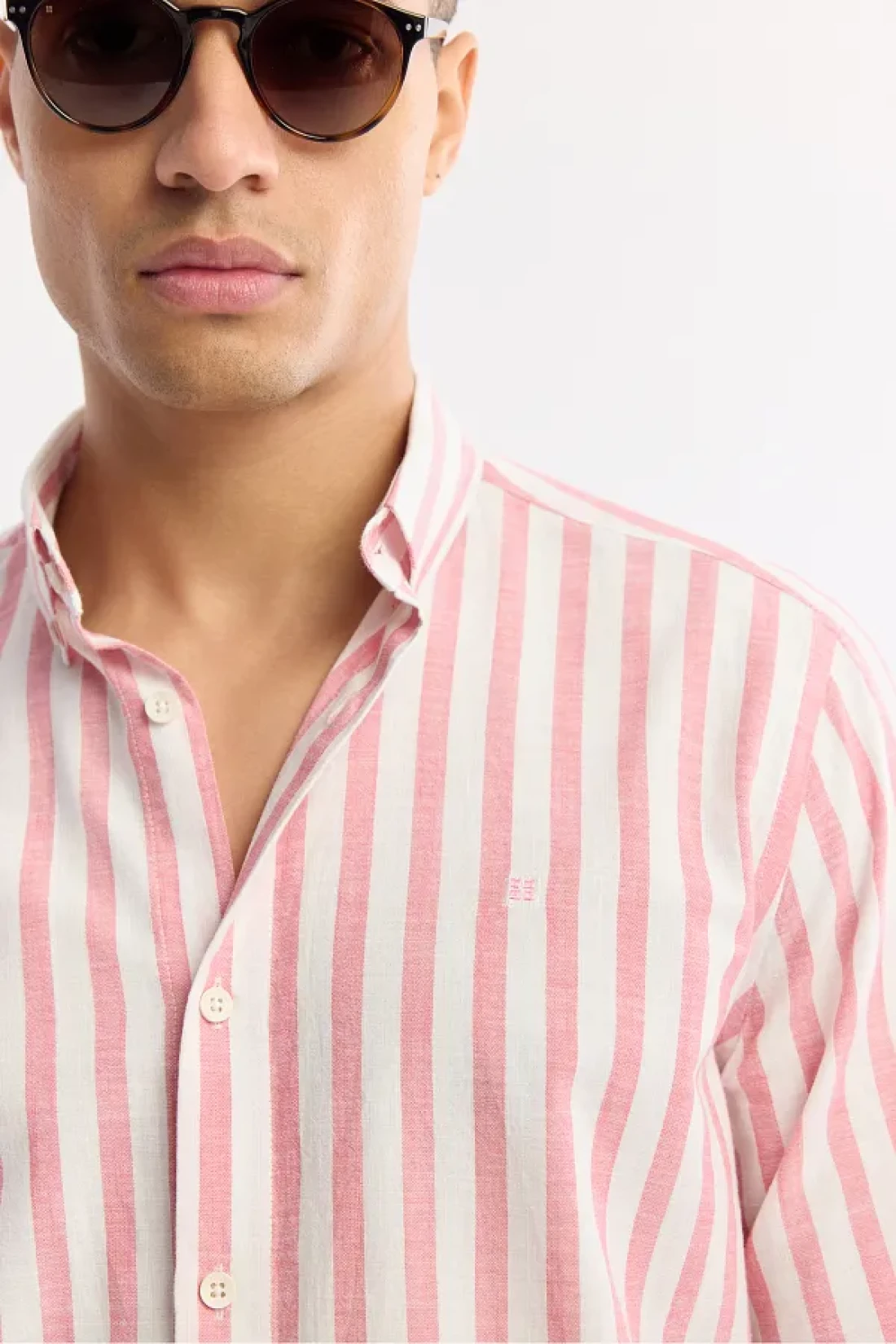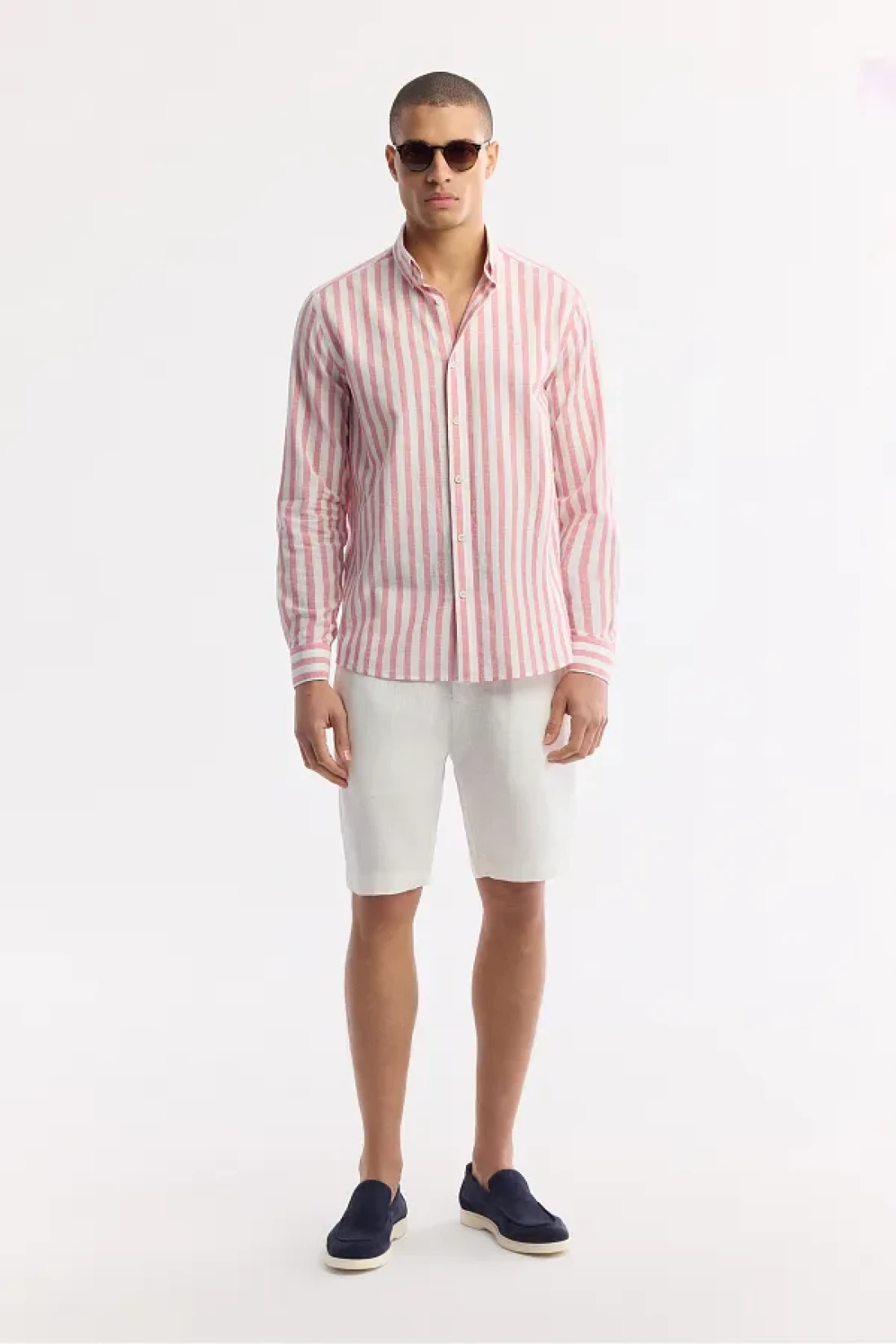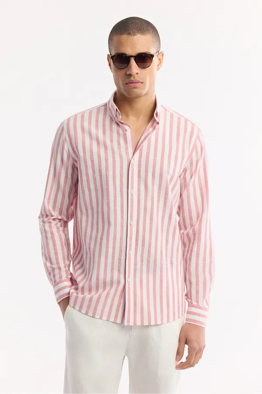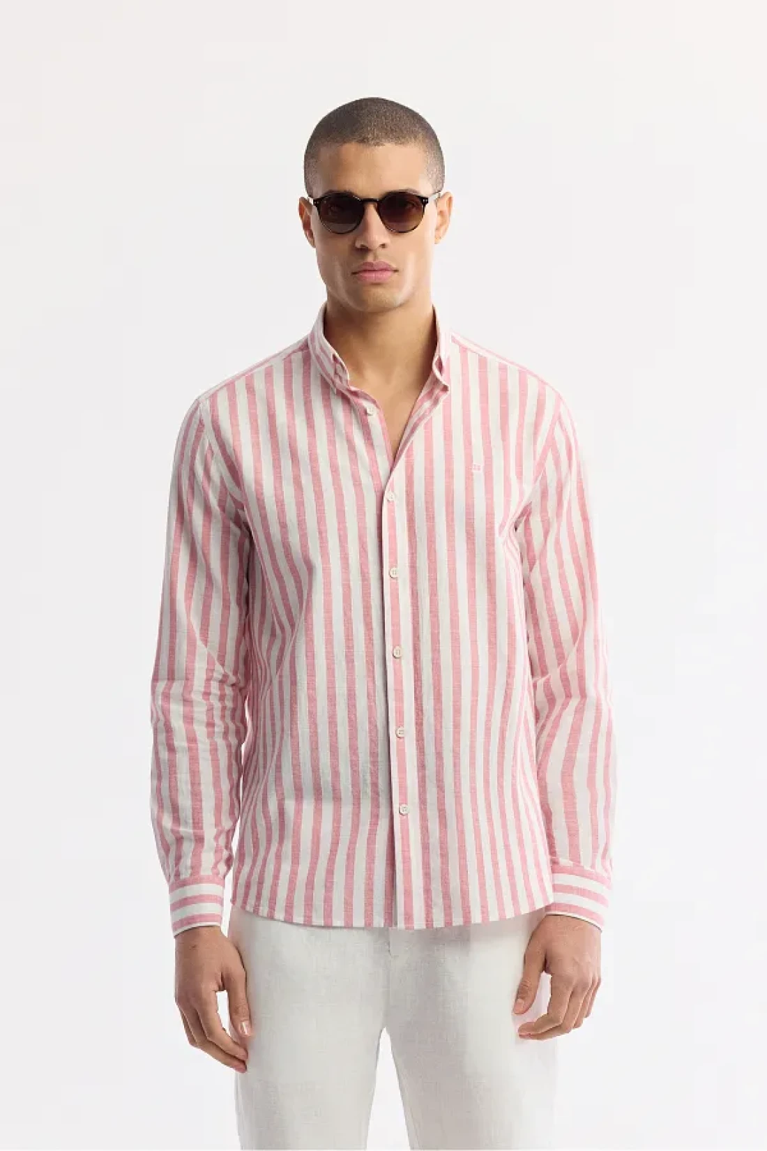 Avva Men's Red Comfort Fit 100% Cotton Button Collar Linen Textured Striped Shirt A51Y2167