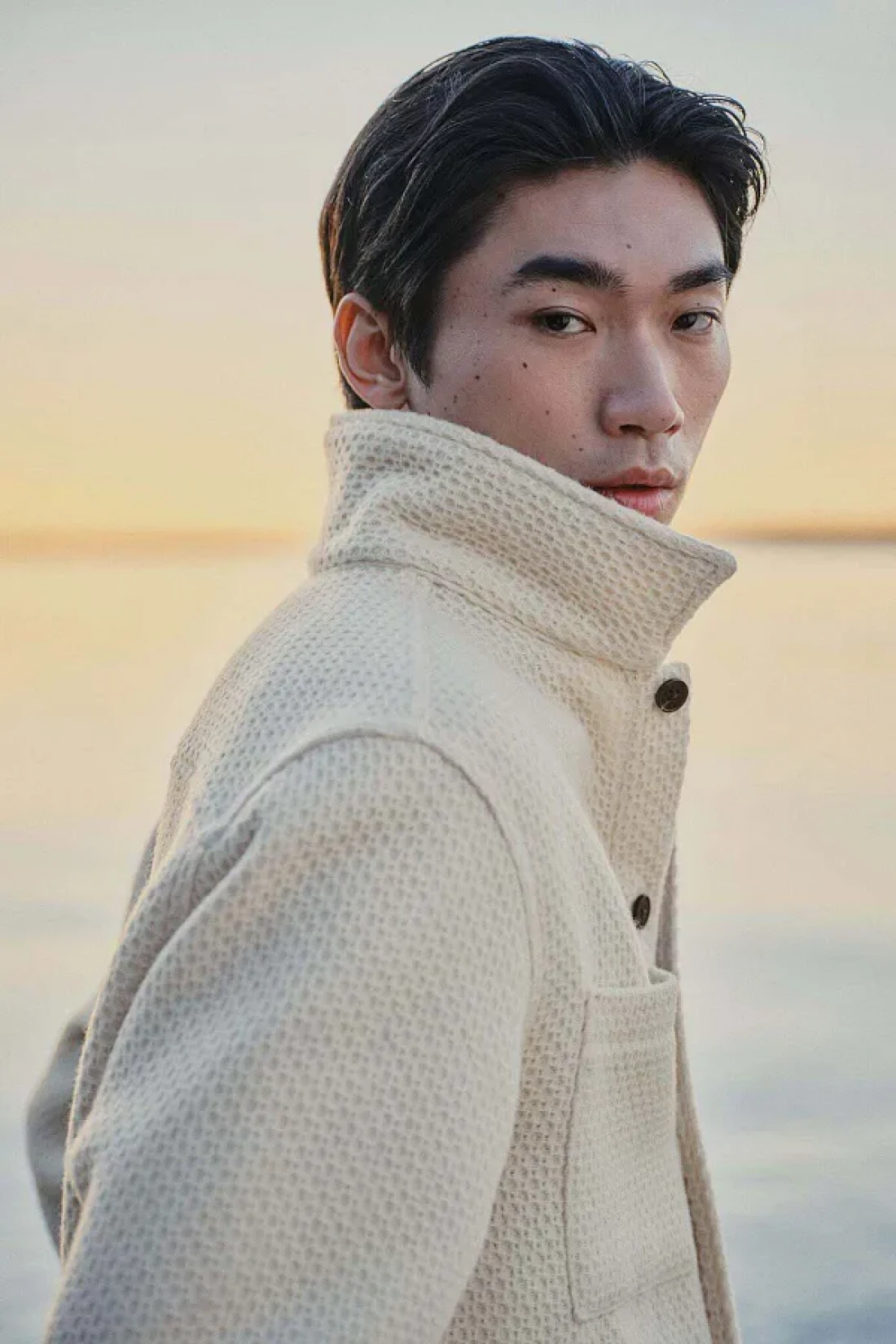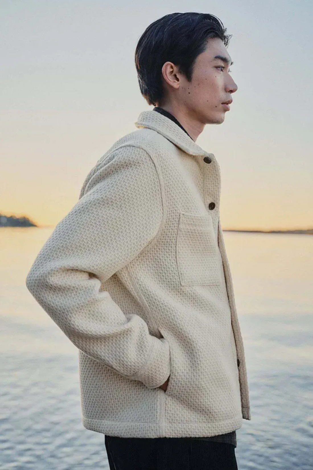 Overshirt in waffled jersey with a collar, buttons down the front and open chest pockets.