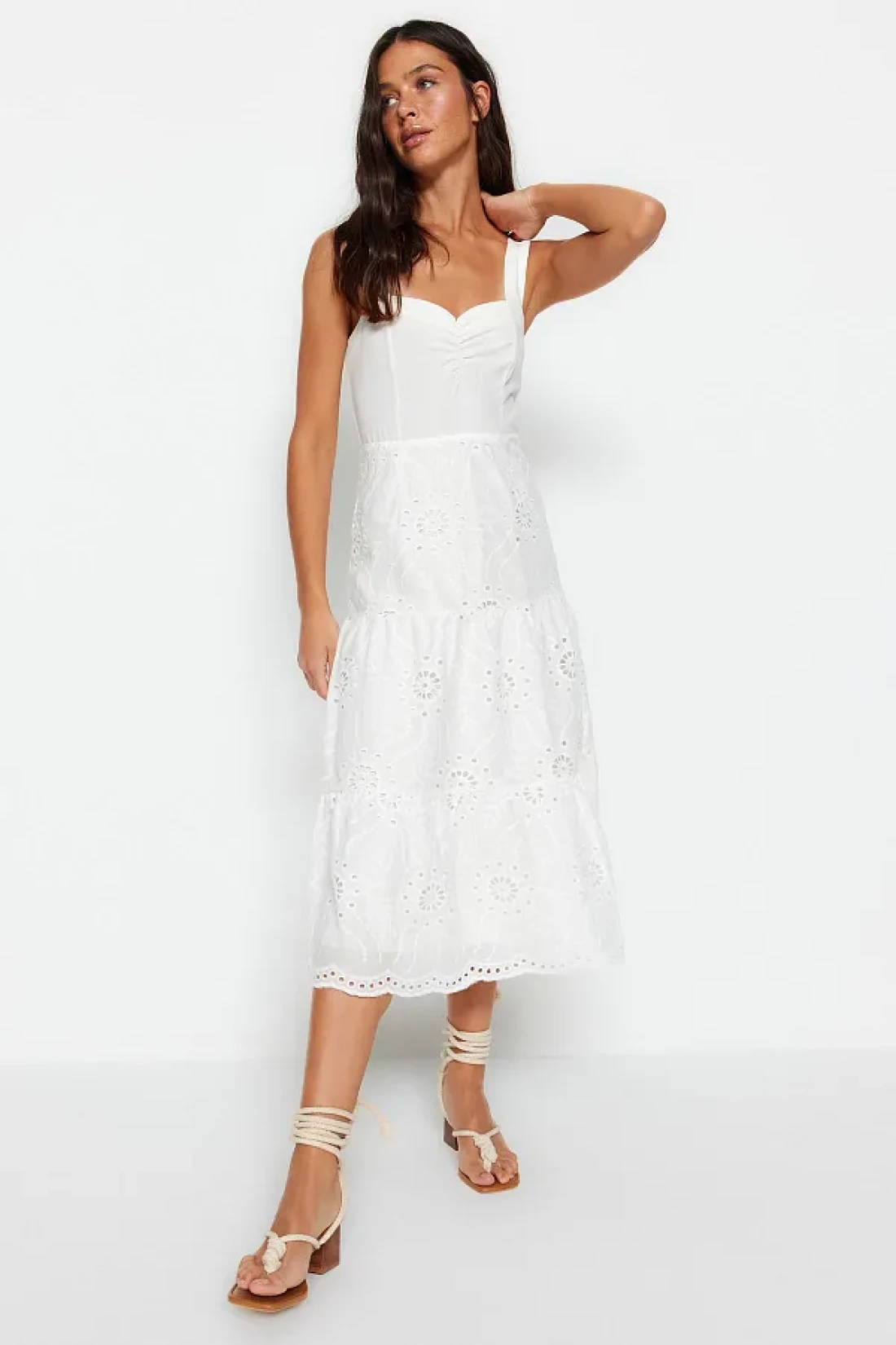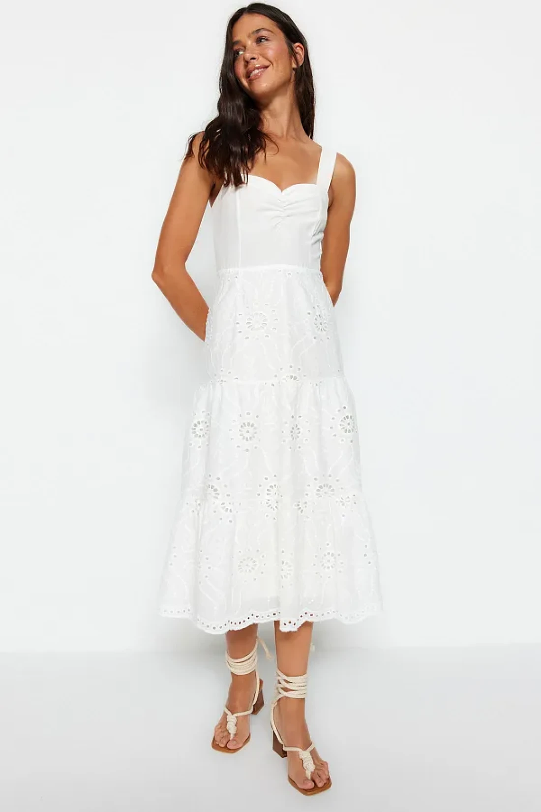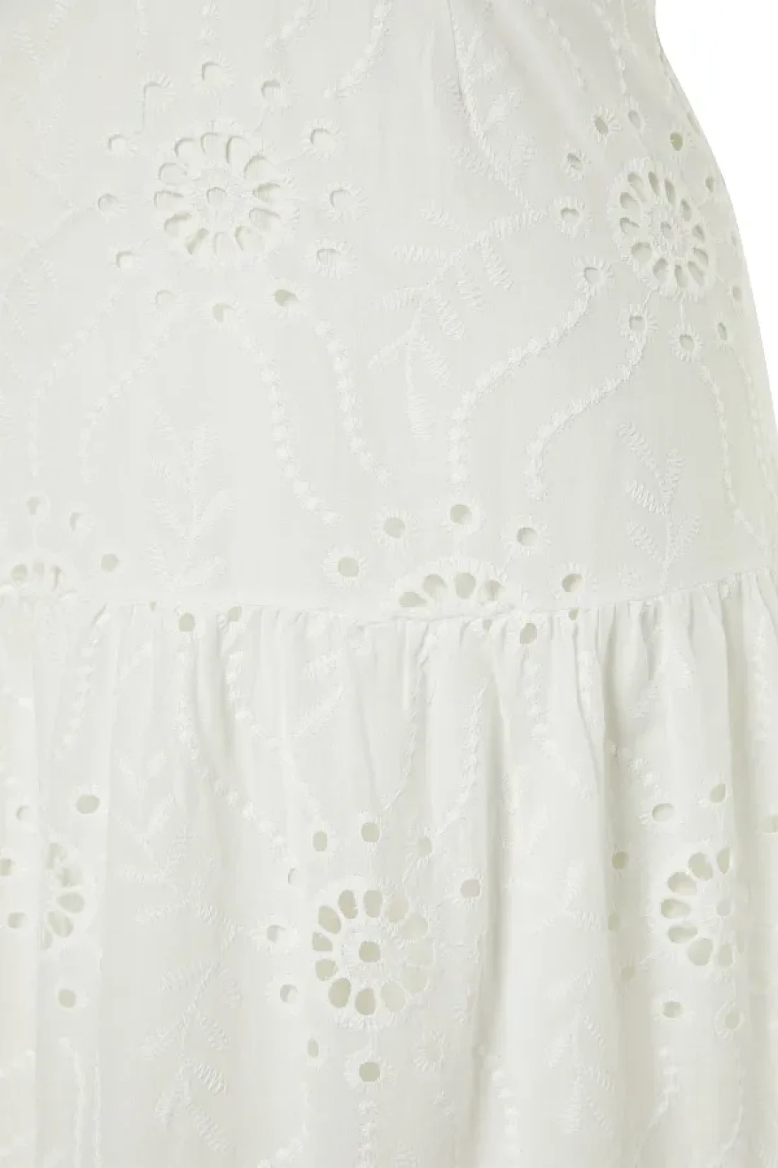 The broderie woven detailing adds an elegant and sophisticated look, elevating the overall aesthetic of the dress
