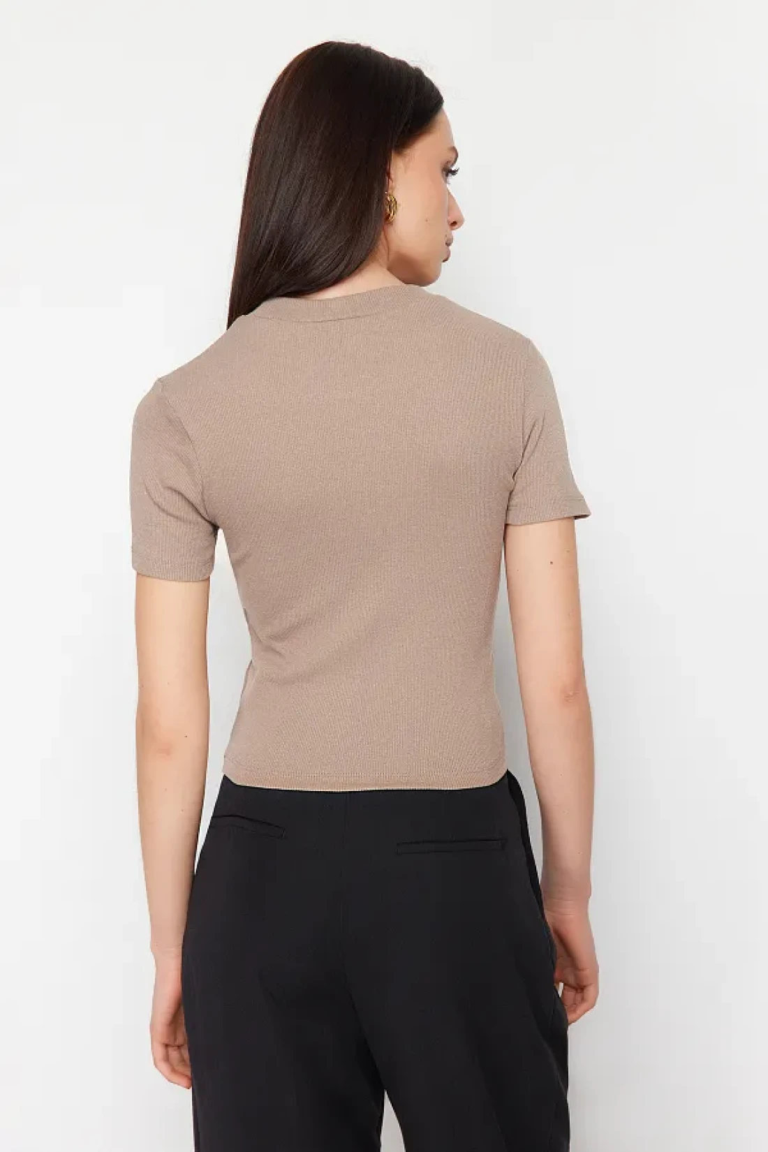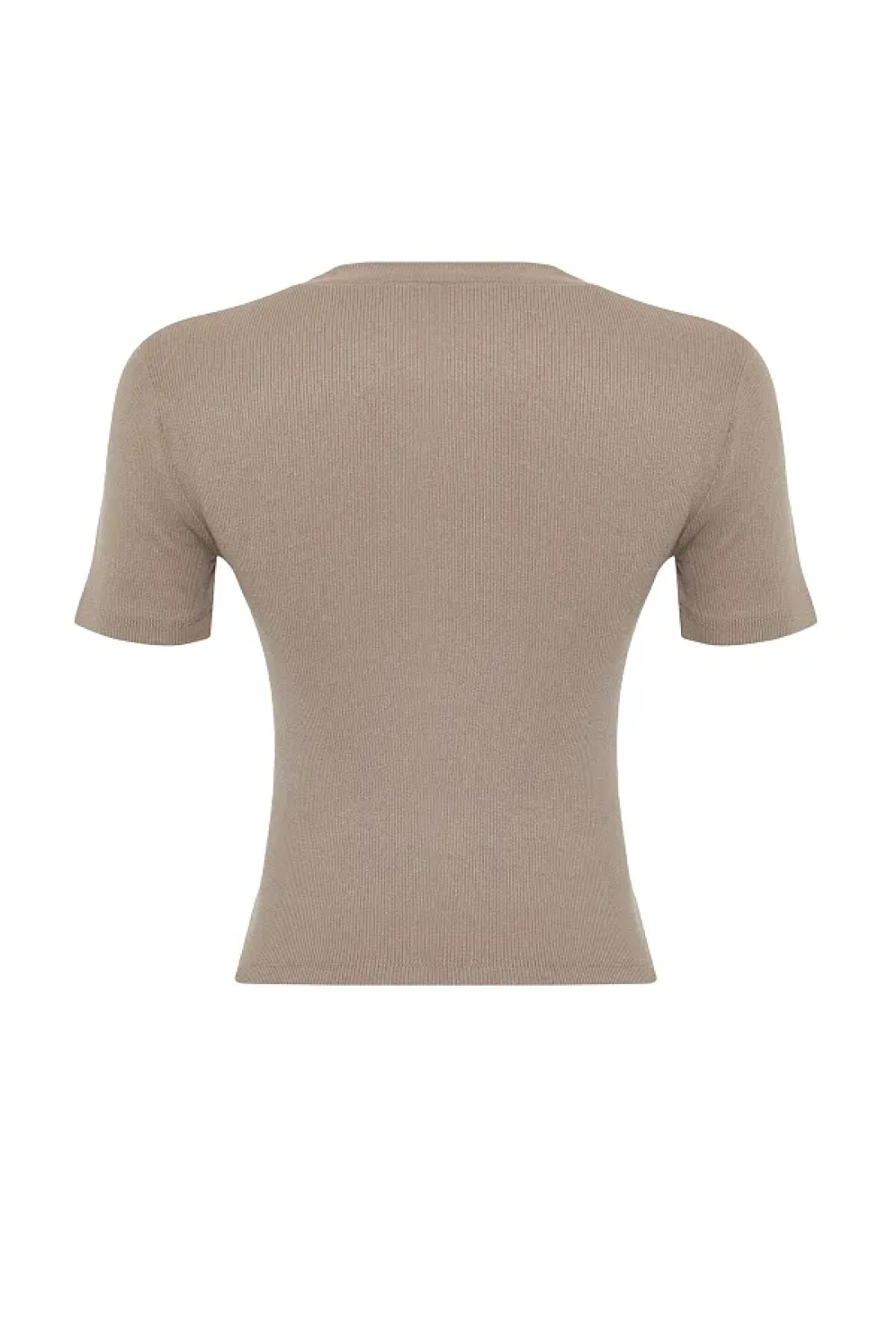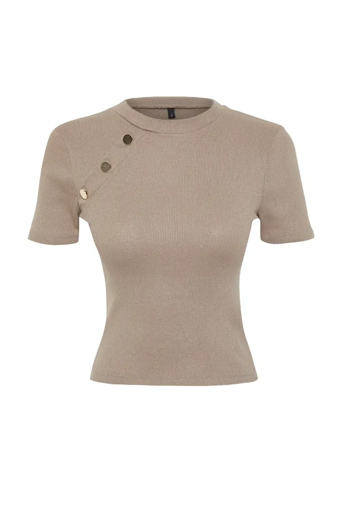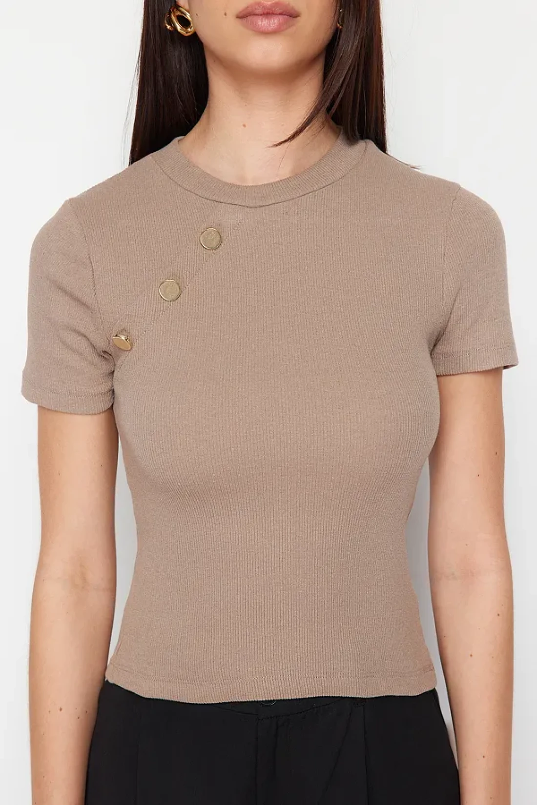 Collection Mink Button Detailed Ribbed Fitted/Fitted Stretch Knitted Blouse TWOSS24BZ00536