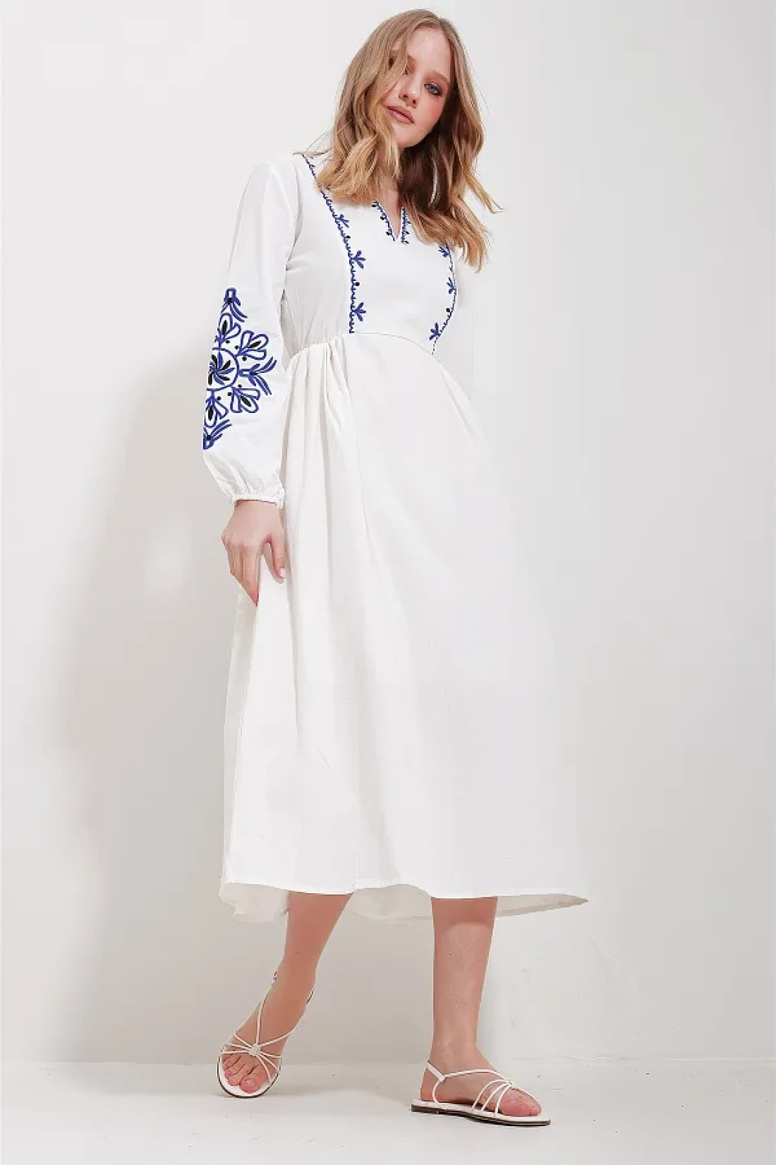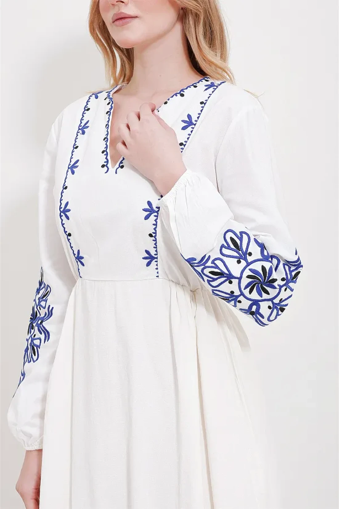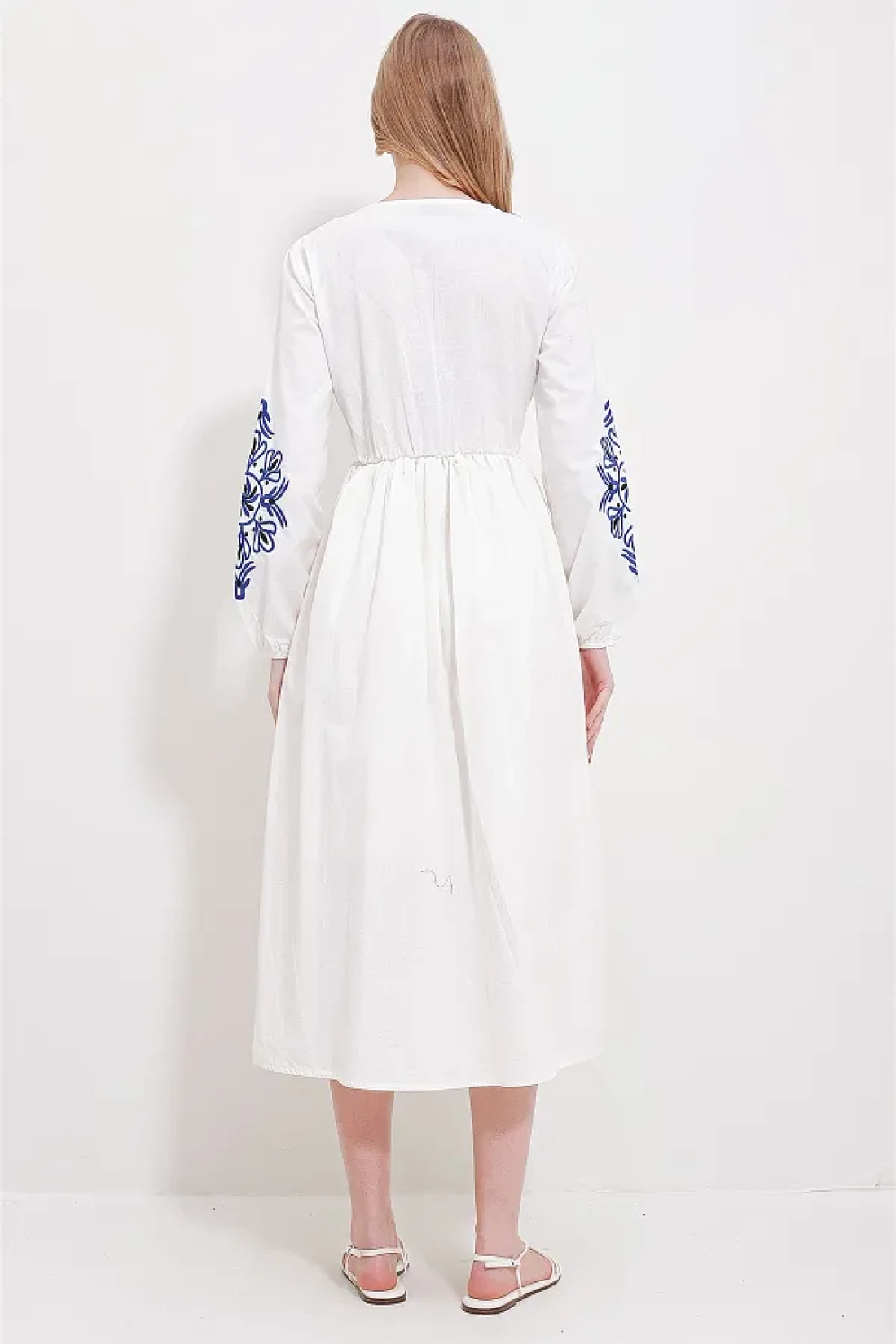 midi-length dresses provide both a stylish and comfortable look and can be found in various styles. You can prefer these dresses for daily wear or for more special events. You can complete it with high heels or sandals to combine. Midiboy dresses are a great option that will allow you to create a feminine and elegant style! Alaçatı style v-neck lined linen embroidered midi length dress is with you! Sample size: s/36/1
