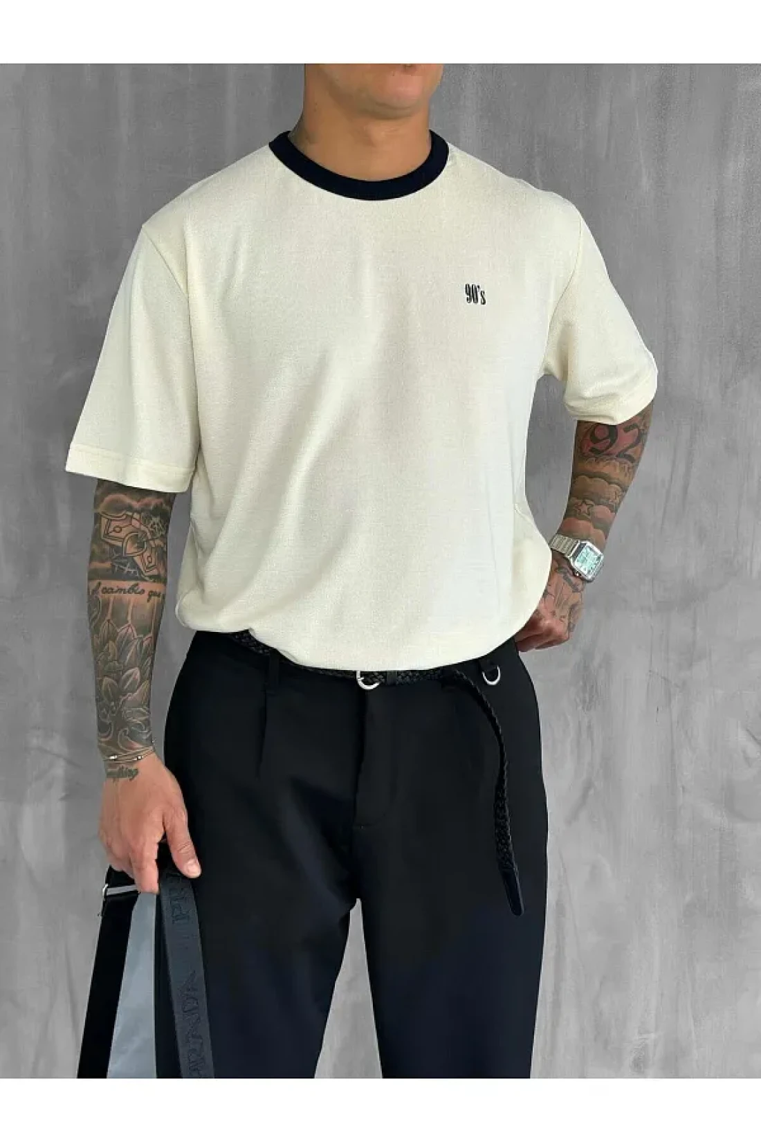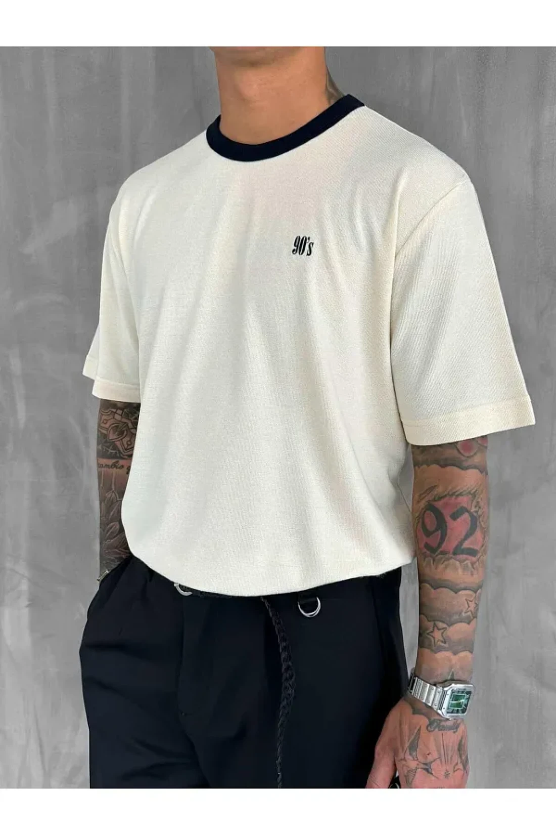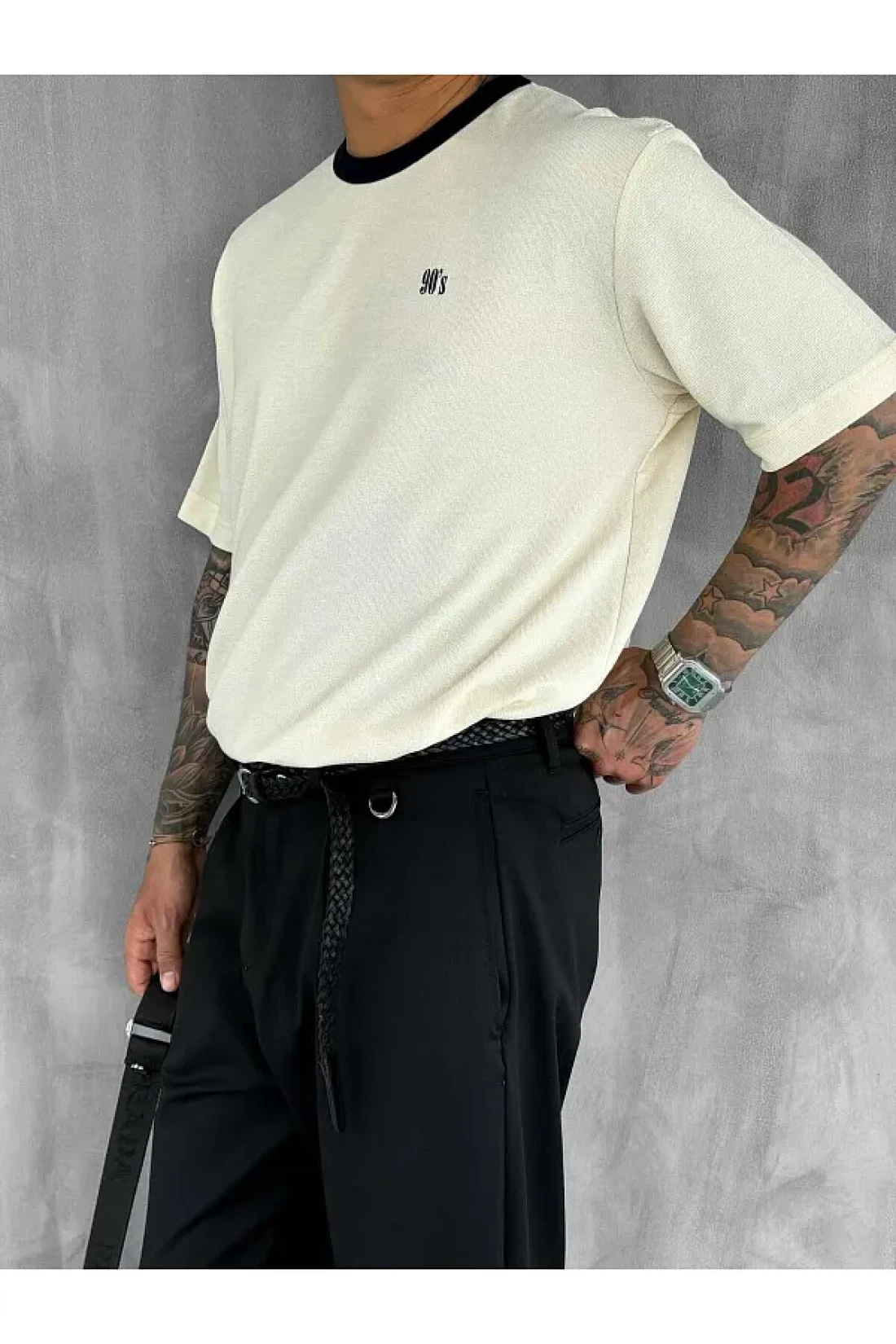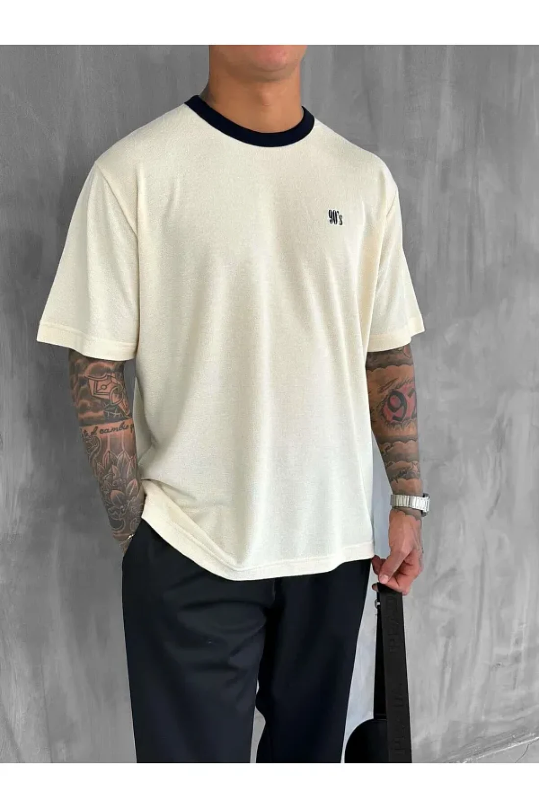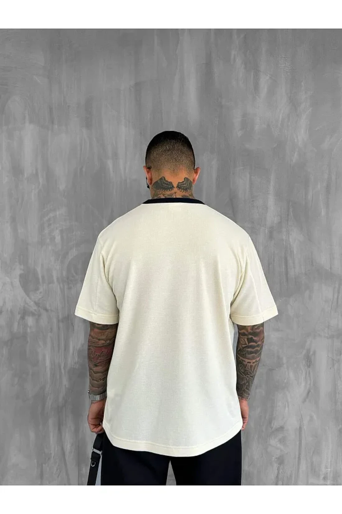 ablukaonline Men's Contrast Detailed Oversize Basic T-Shirt Cream