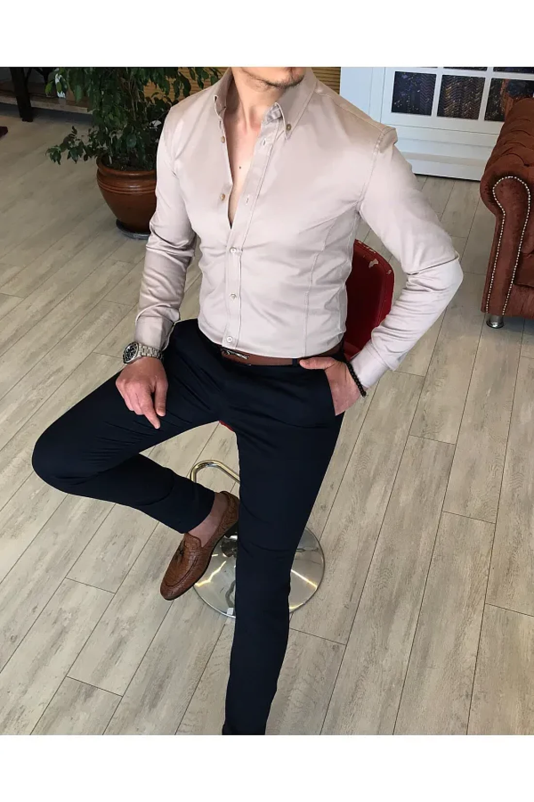 TerziAdemAltun Italian Style Slim Fit Stand Collar Satin Men's Shirt Beige T4751