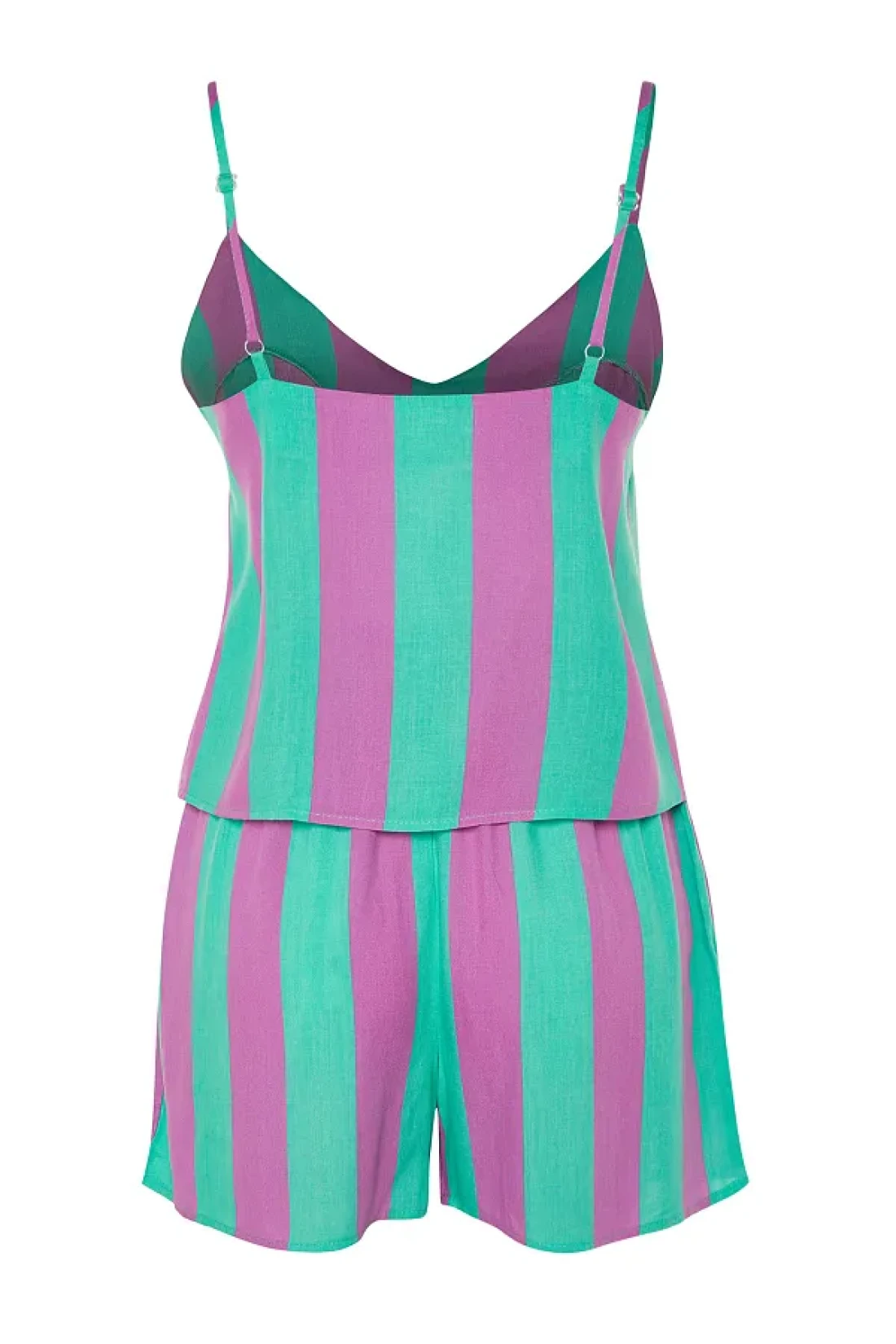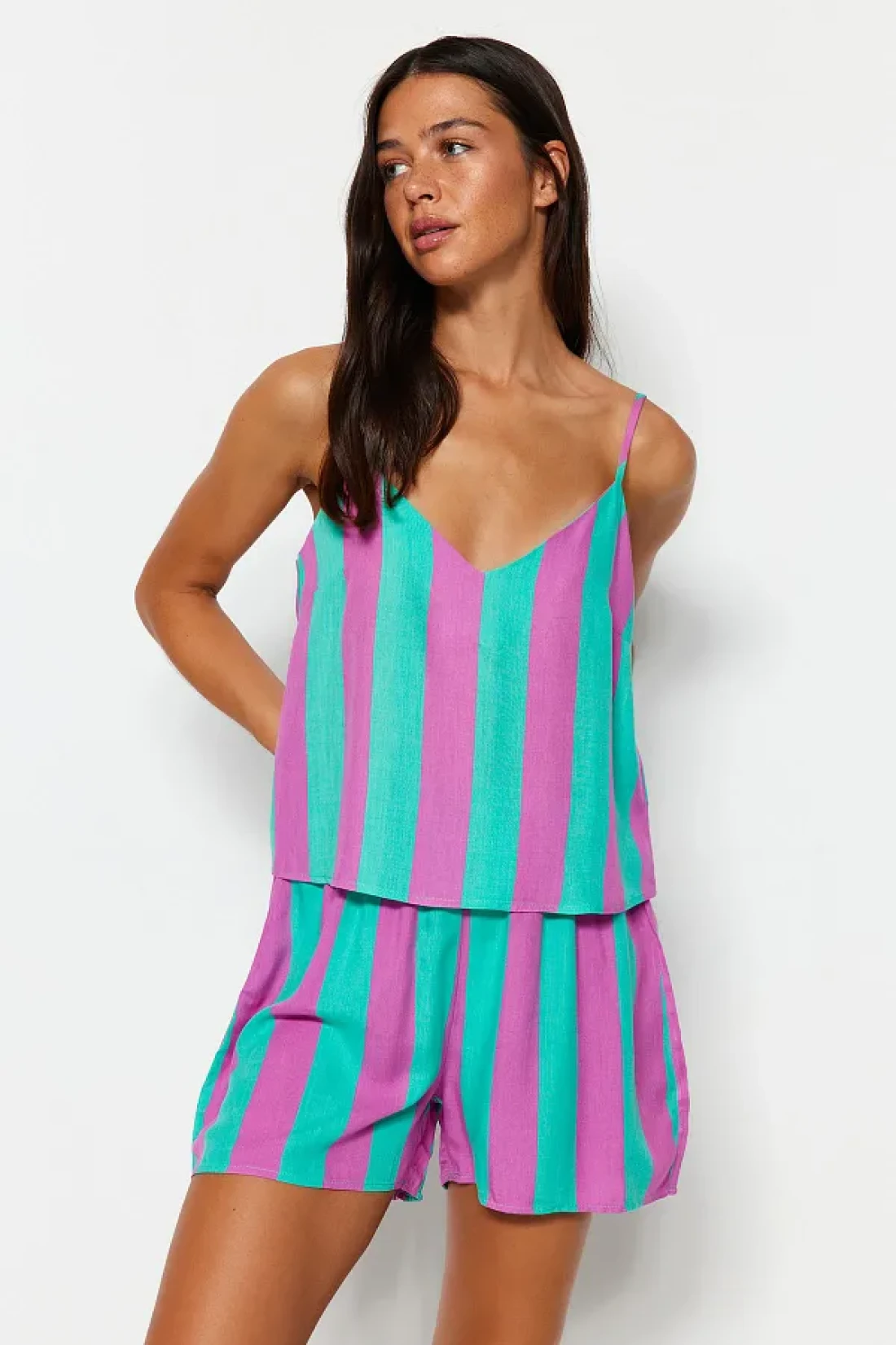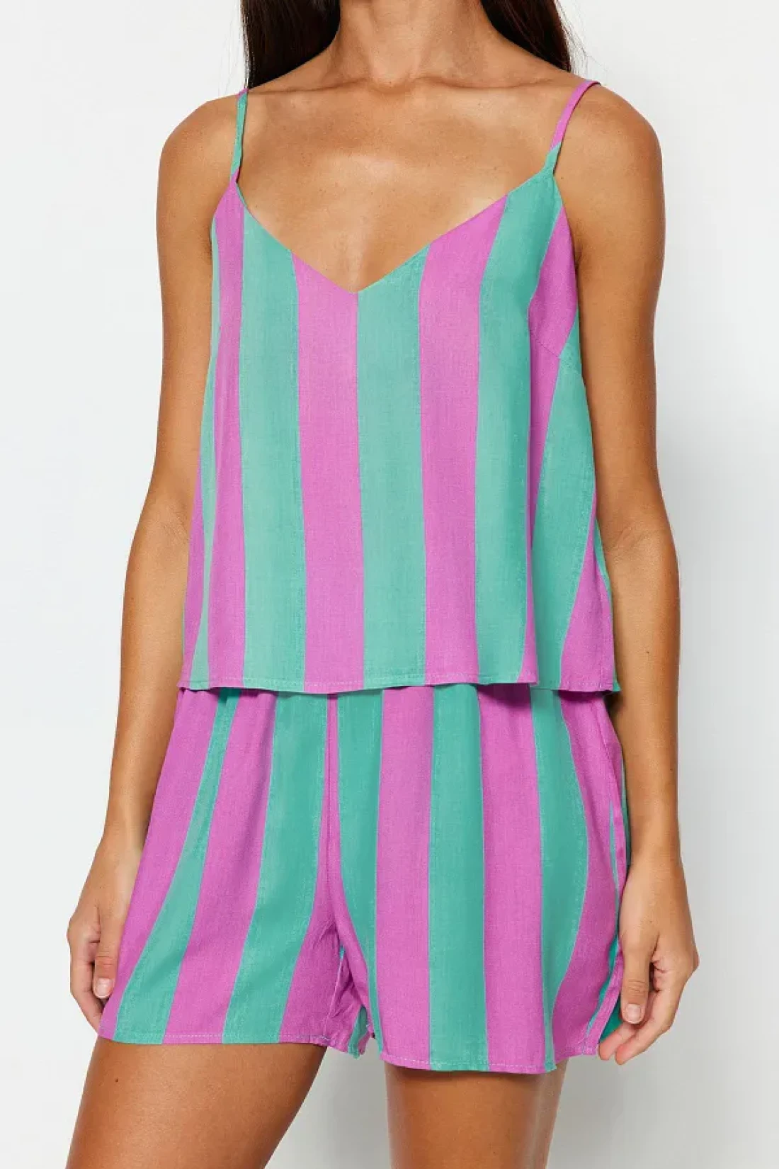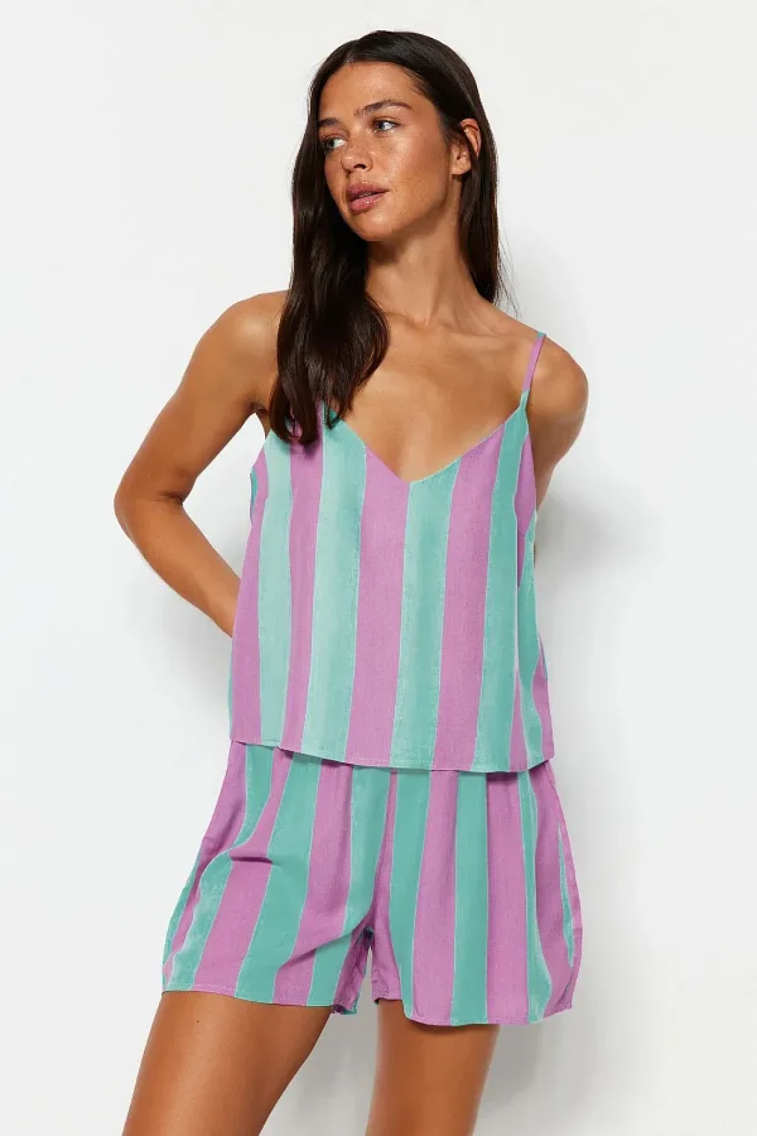 Collection Multicolor Striped Rope Strap Woven Pajama Set with Viscose Shorts Thmss23Pt00225