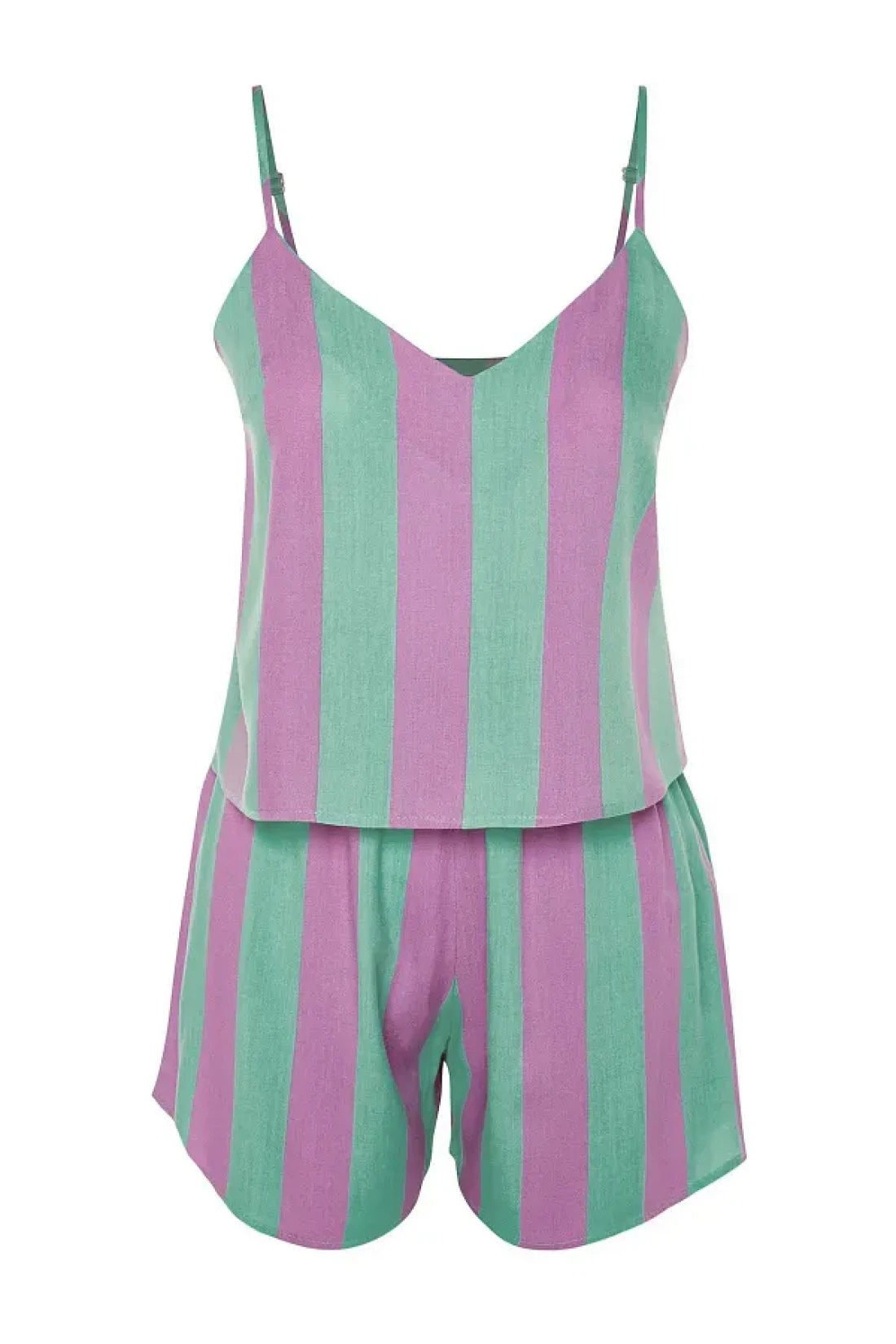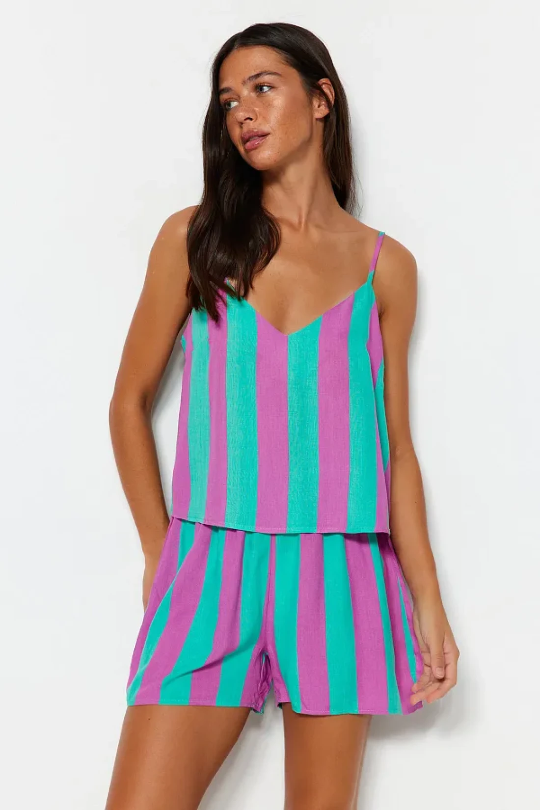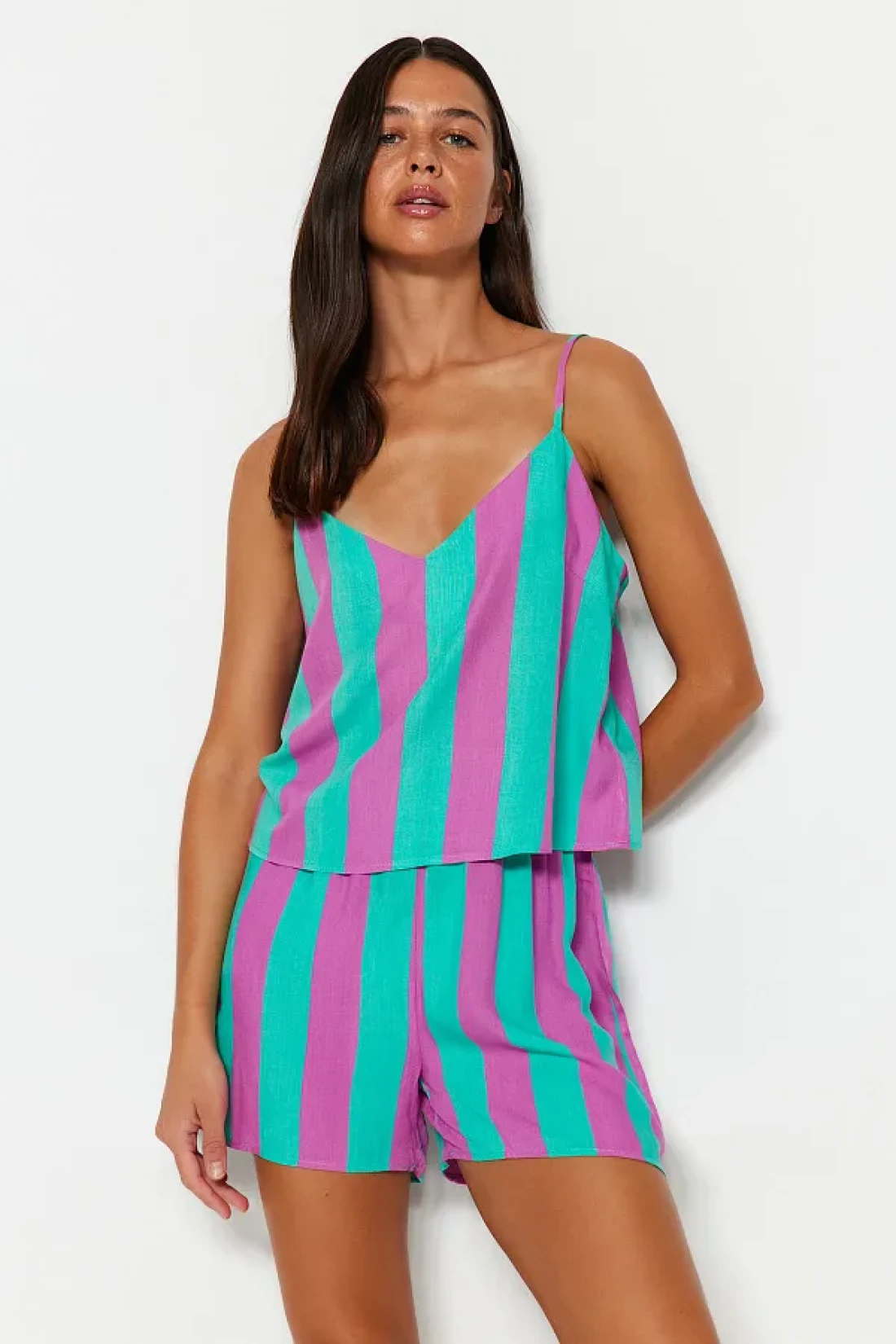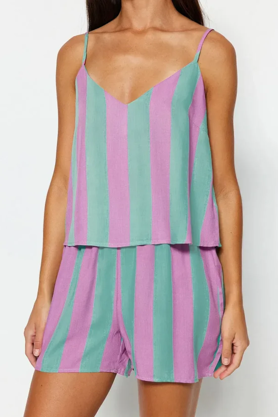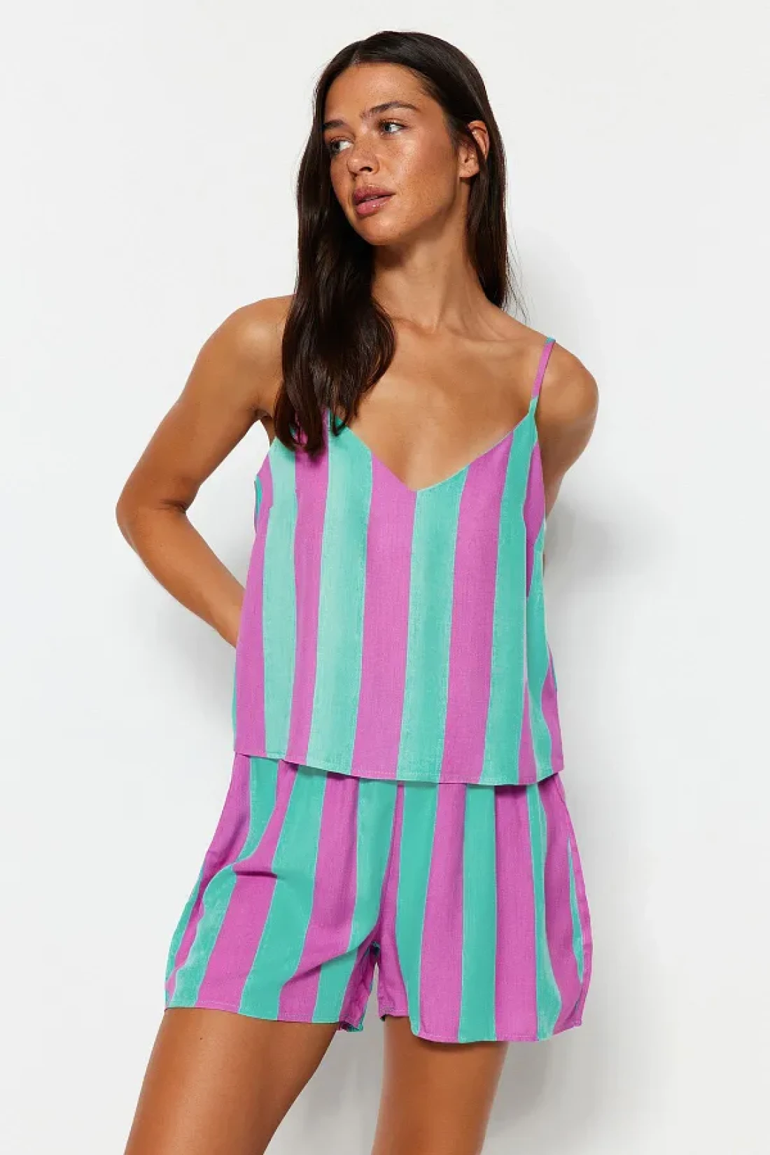 Collection Multicolor Striped Rope Strap Woven Pajama Set with Viscose Shorts Thmss23Pt00225