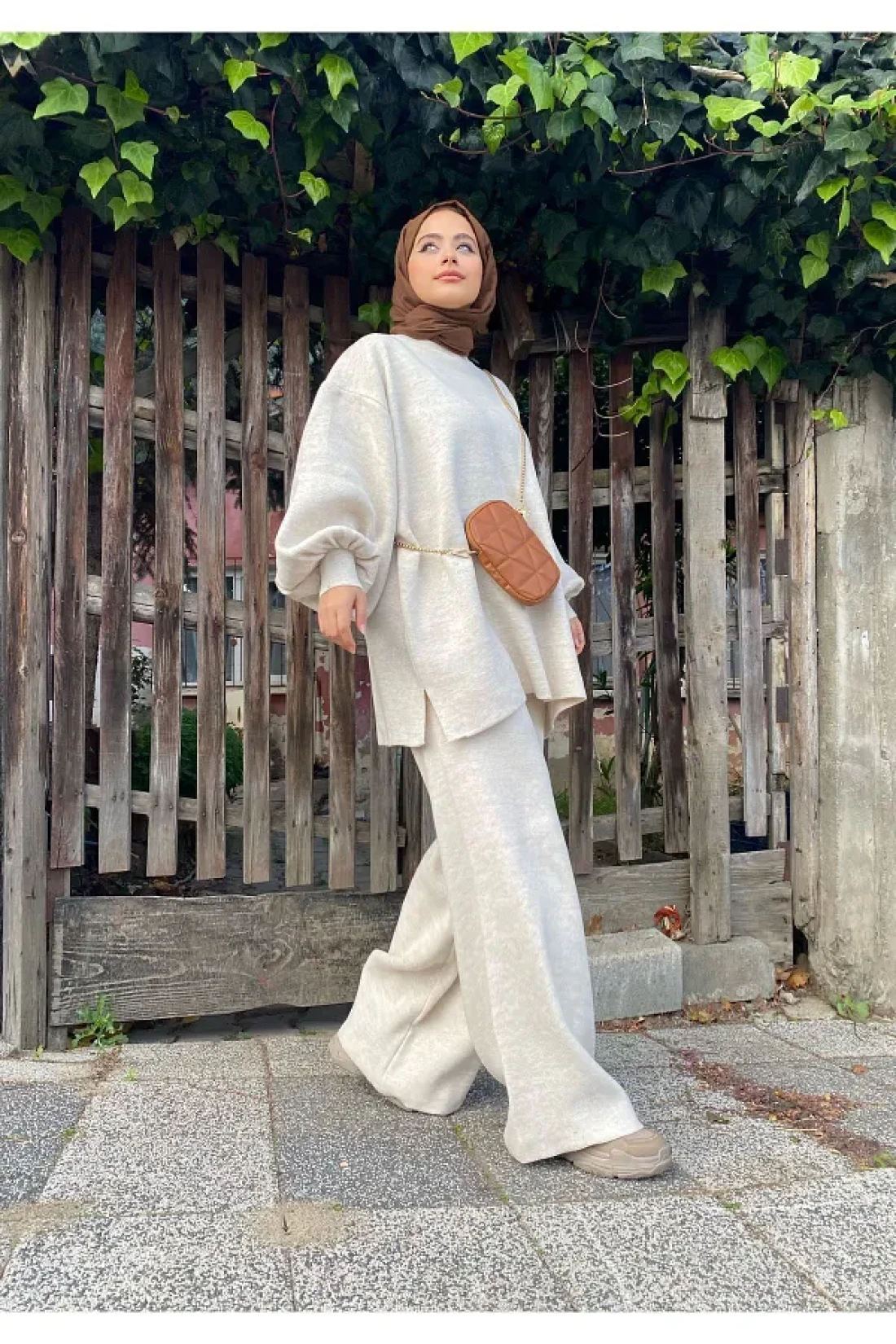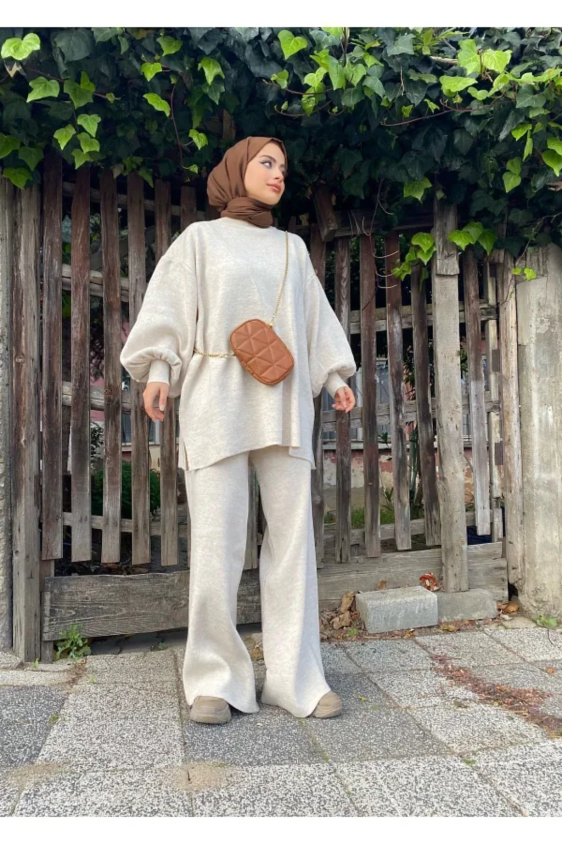 With its balloon sleeve detail, it gives a modern and trendy look, while wide-leg trousers offer freedom of comfortable movement. With its crew neck design, it exhibits both comfort and an elegant stance. Thanks to its thick knitted fabric, it keeps you at the ideal temperature during seasonal transitions. Ideal for long-term use with washing instructions for easy care