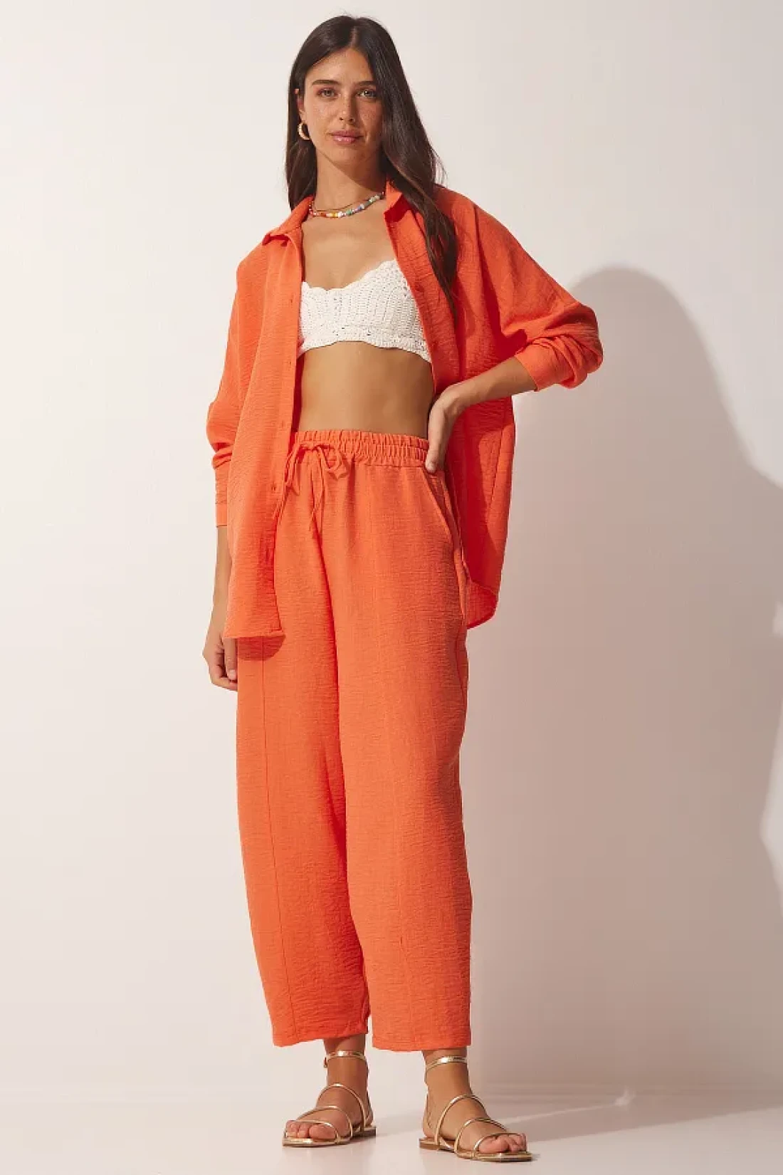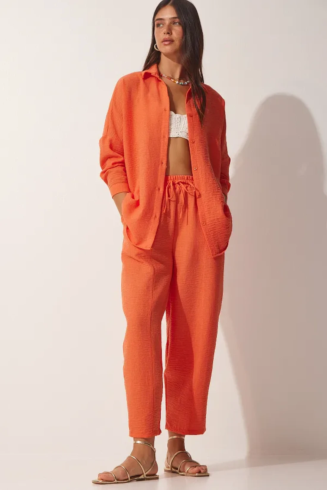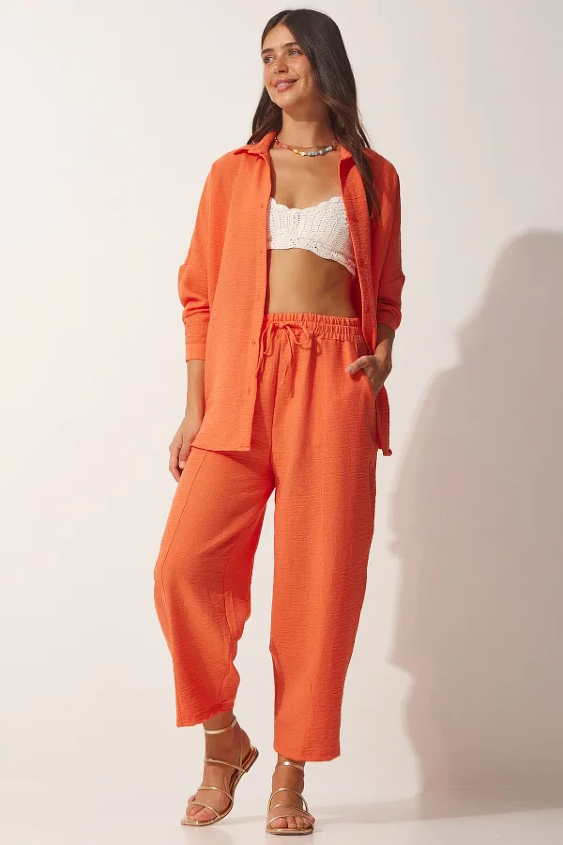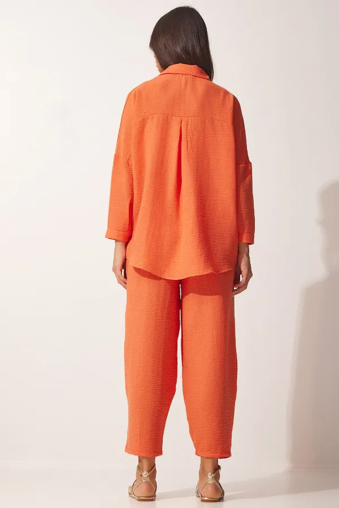 Happiness İstanbul Women's Orange Linen Shirt Baggy Trousers Set DZ00080