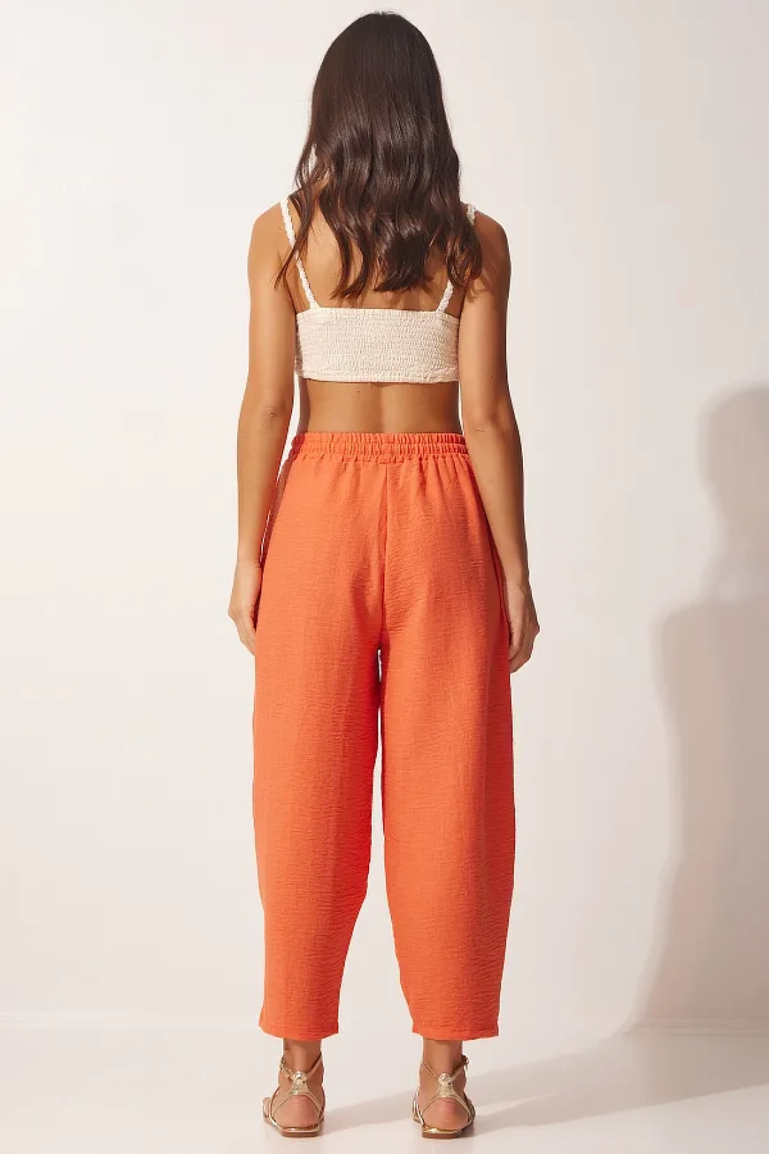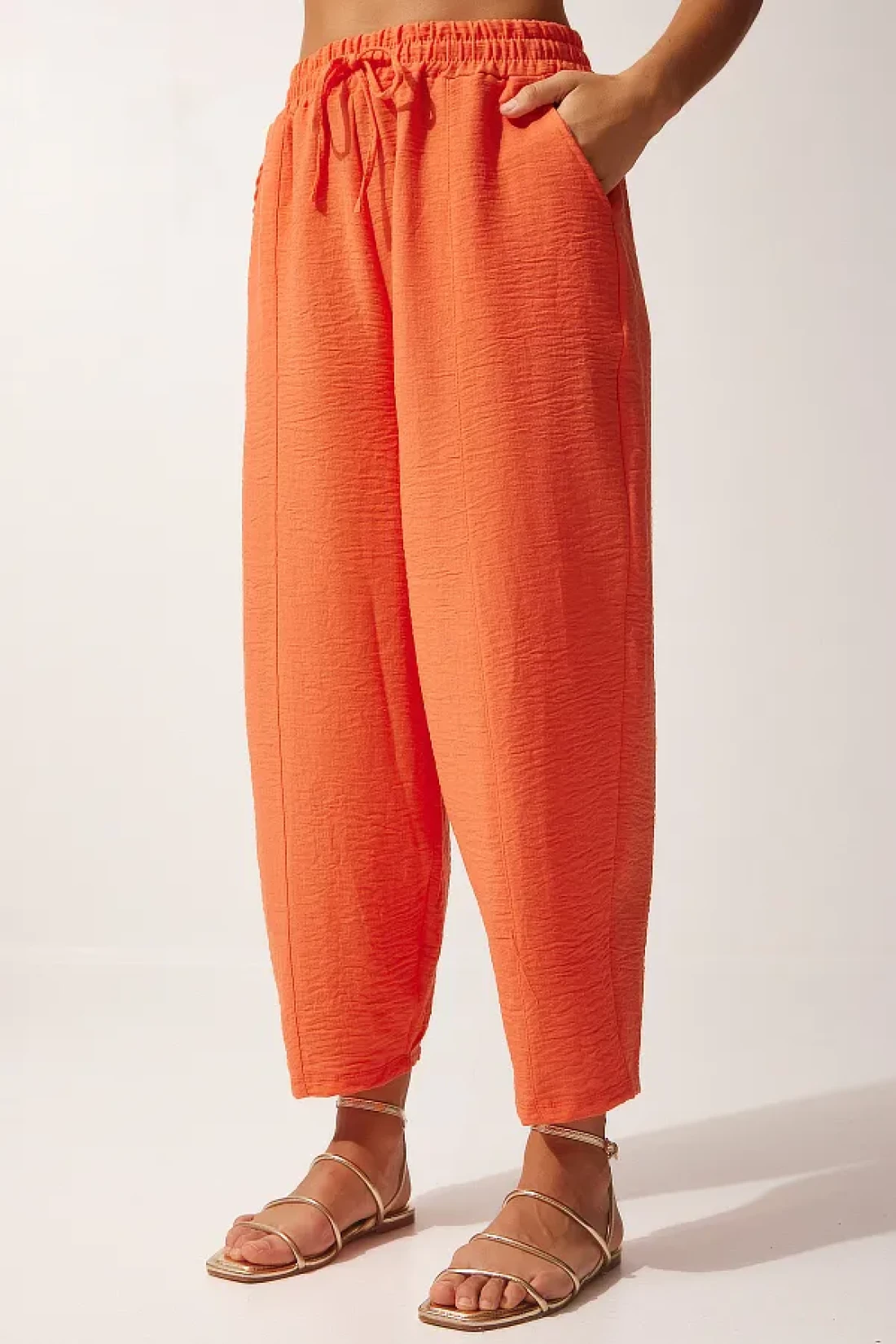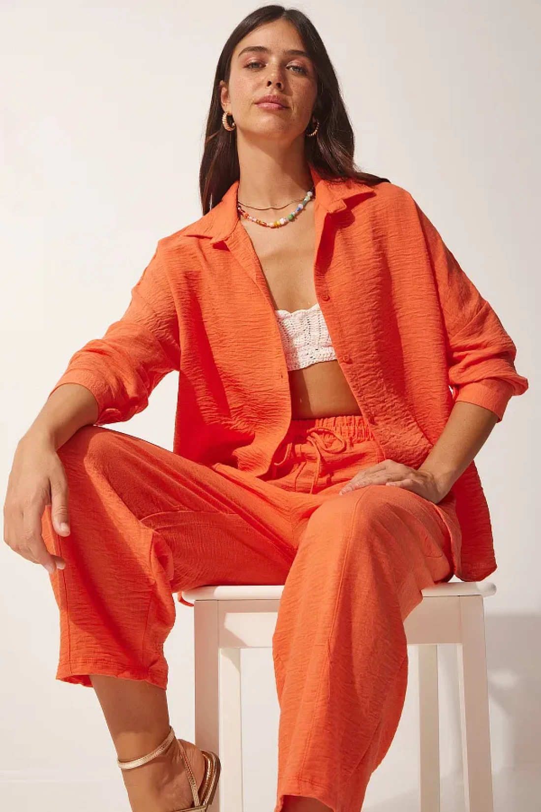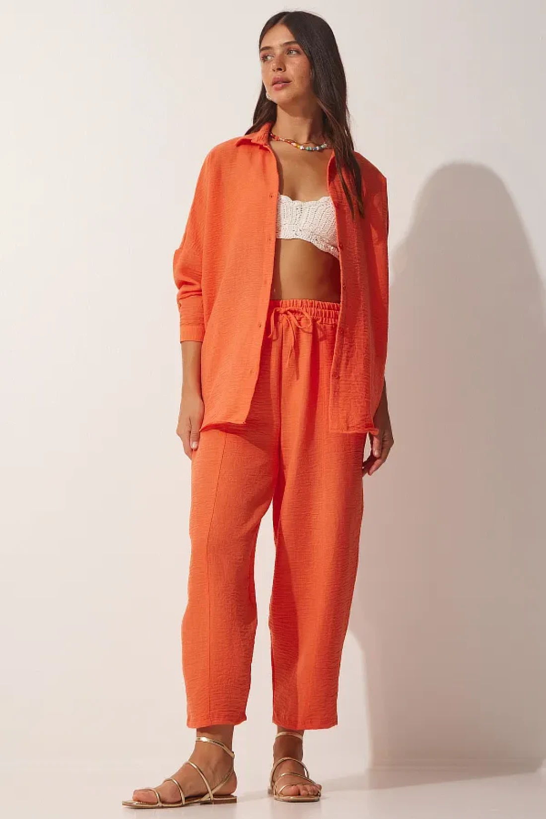 Happiness İstanbul Women's Orange Linen Shirt Baggy Trousers Set DZ00080
