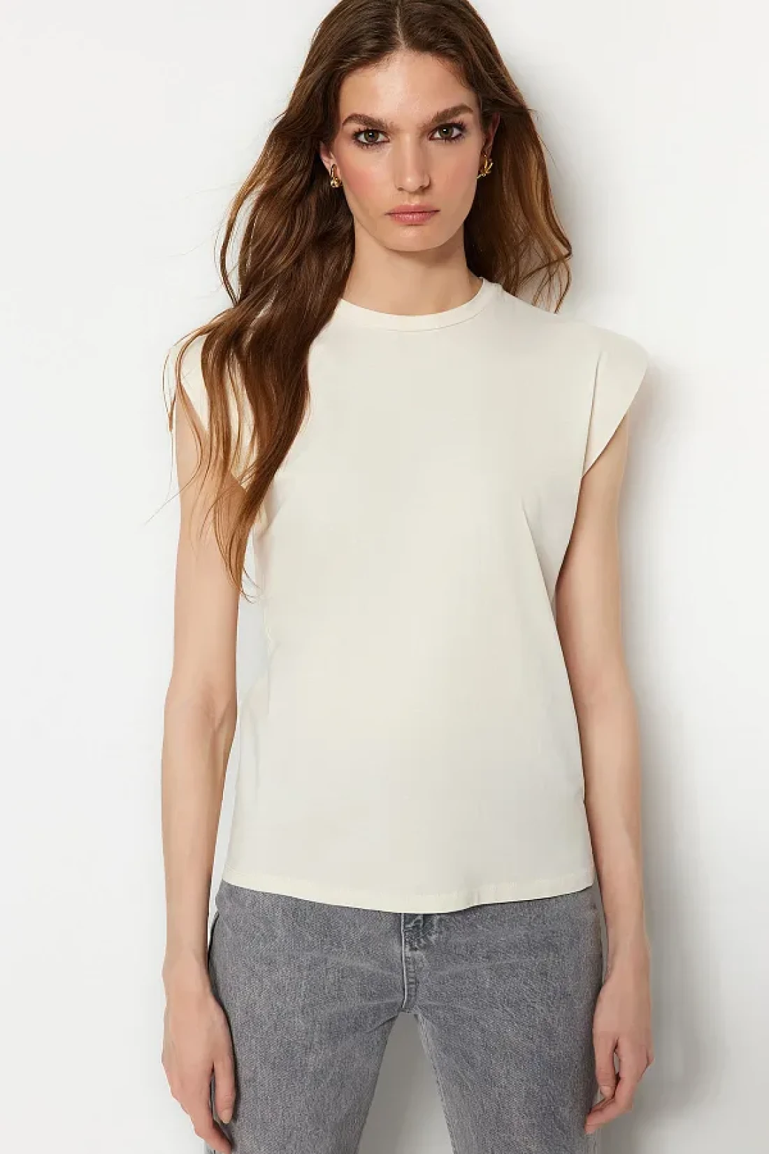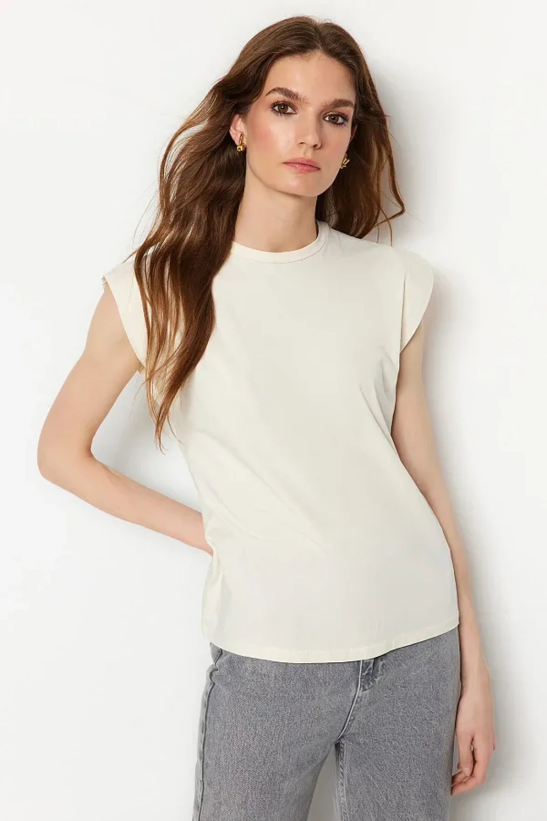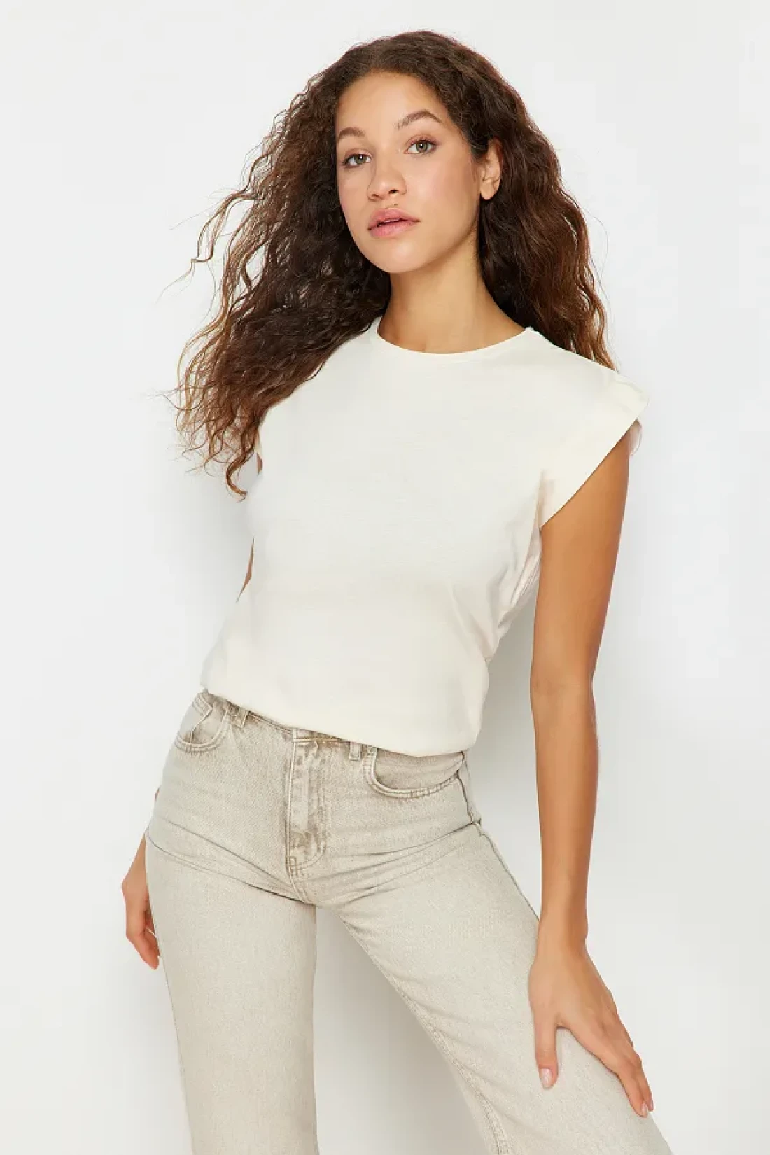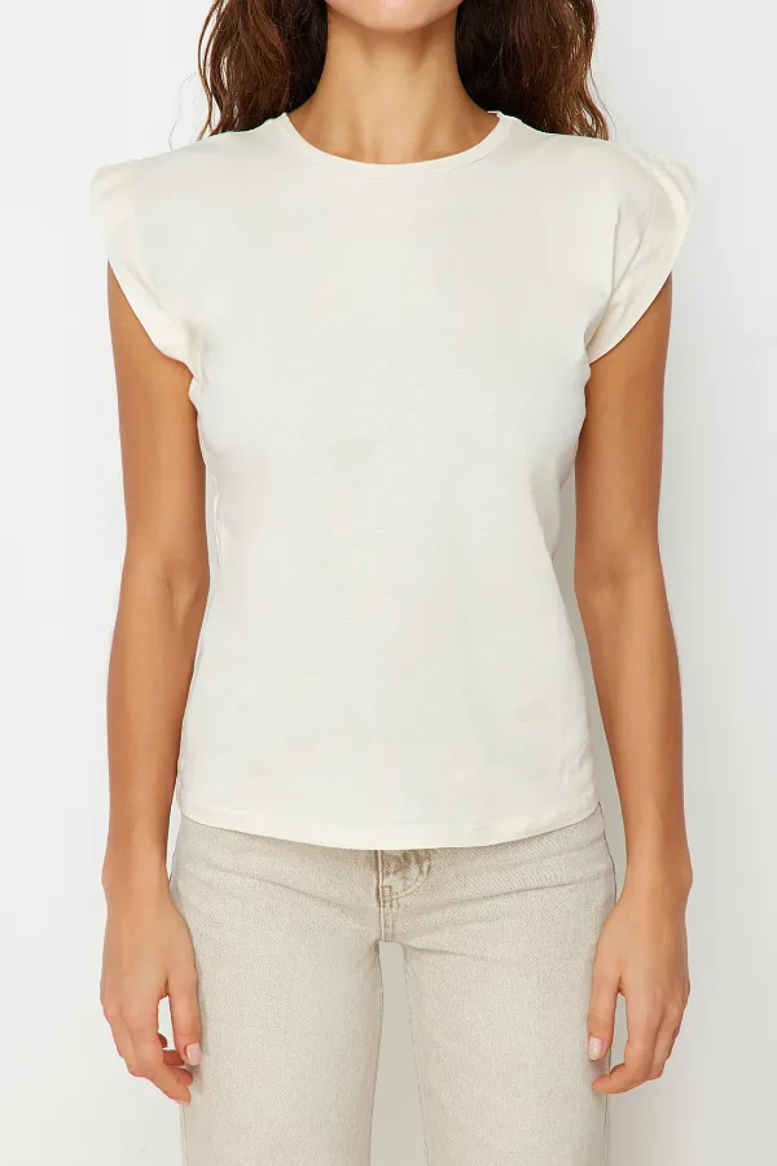 Collection Beige 100% Cotton Wadding Look Basic Crew Neck Knitted T-Shirt TWOSS20TS0021