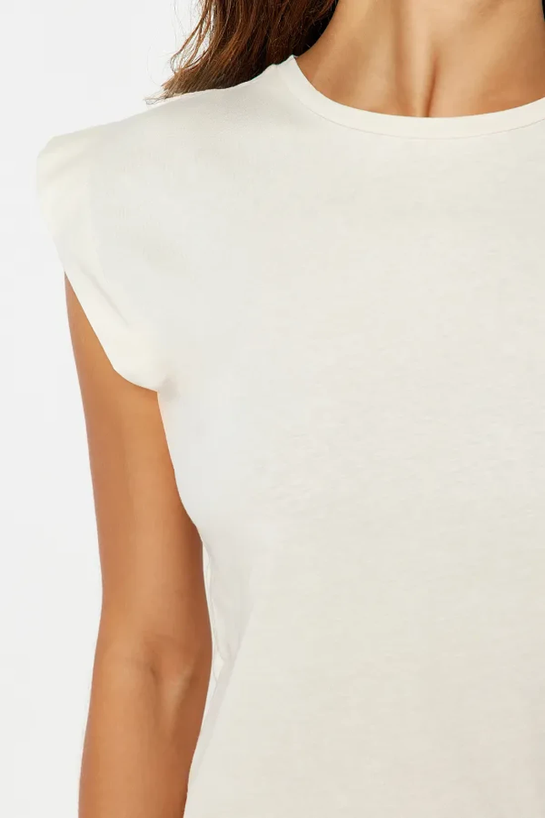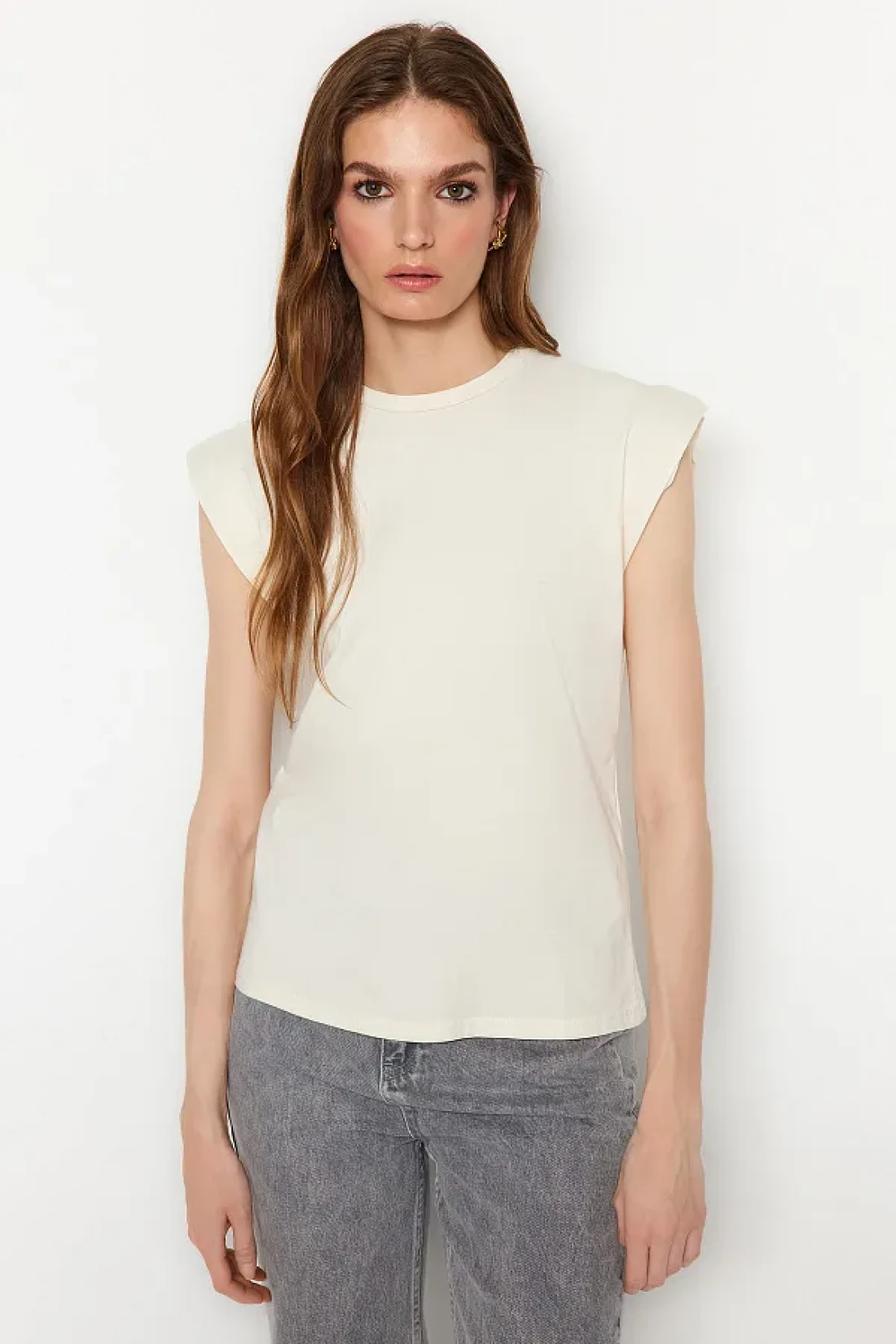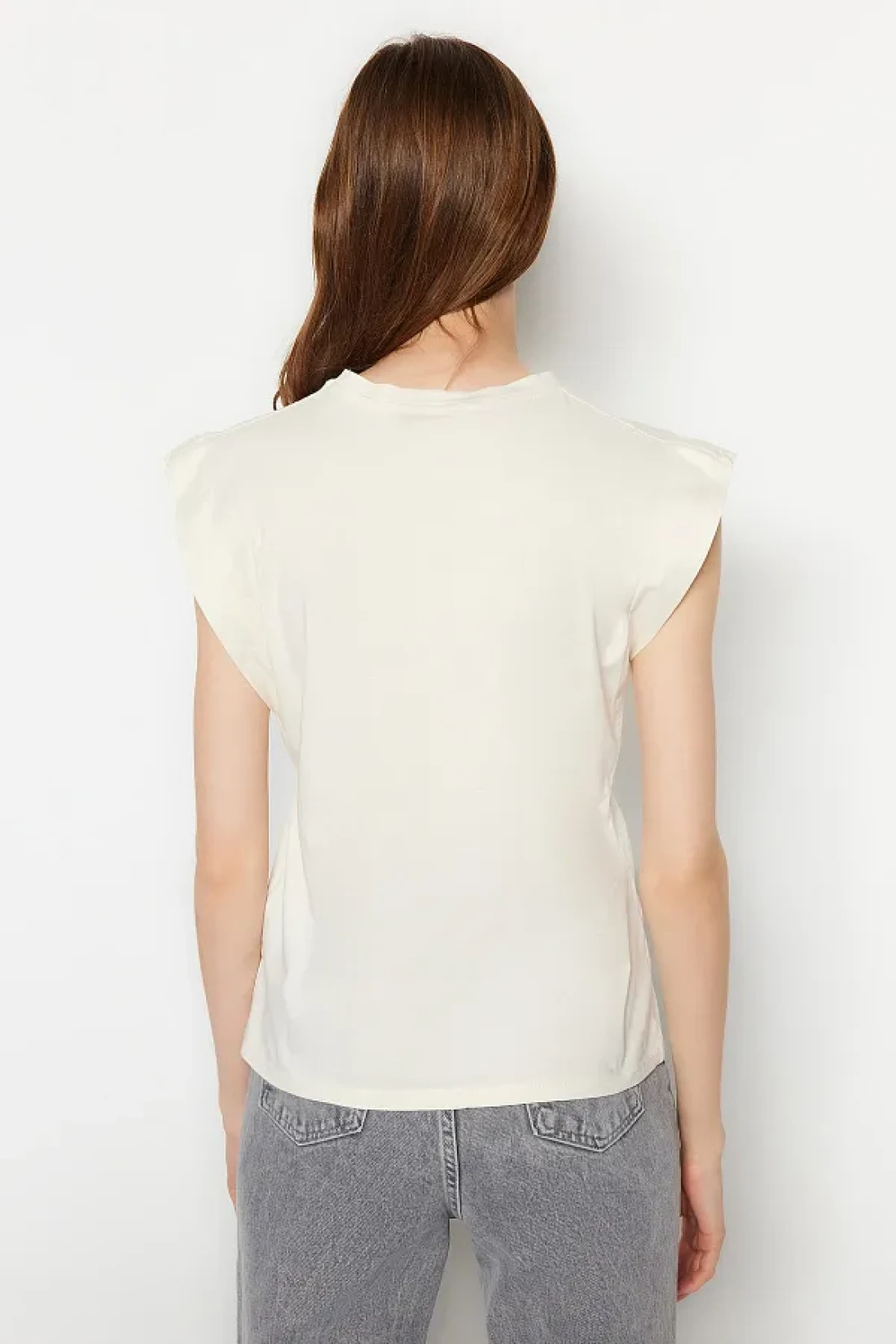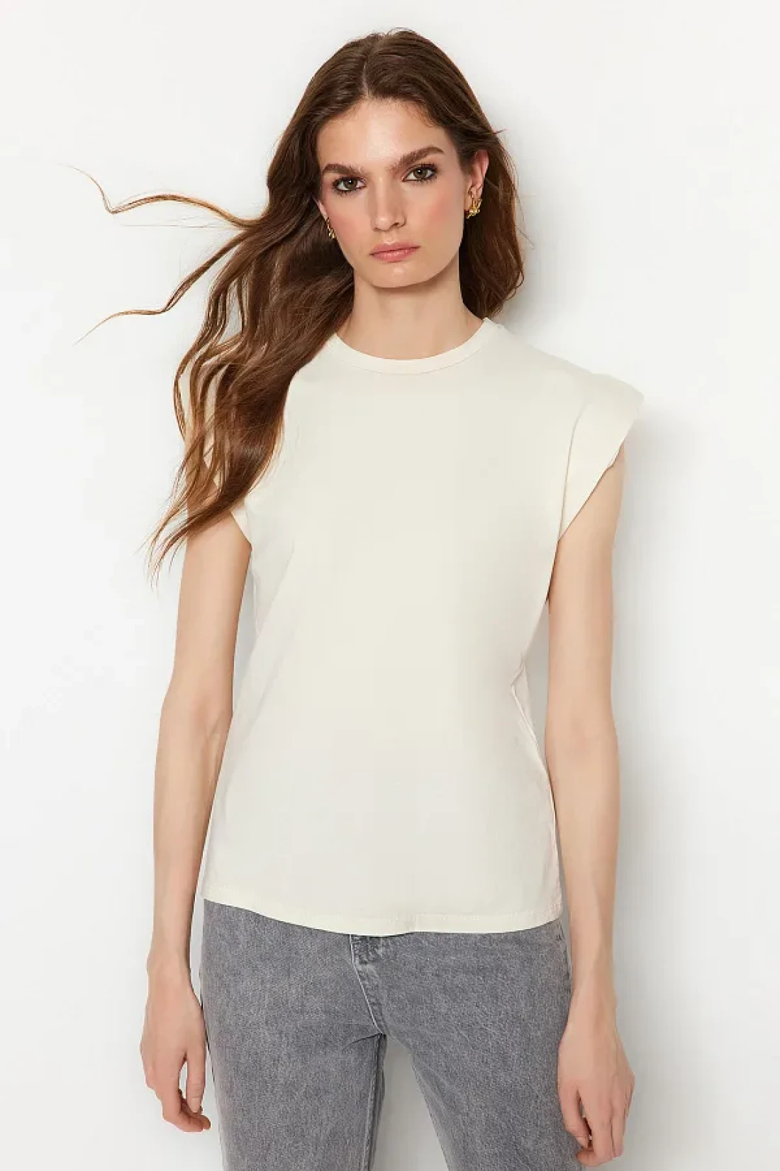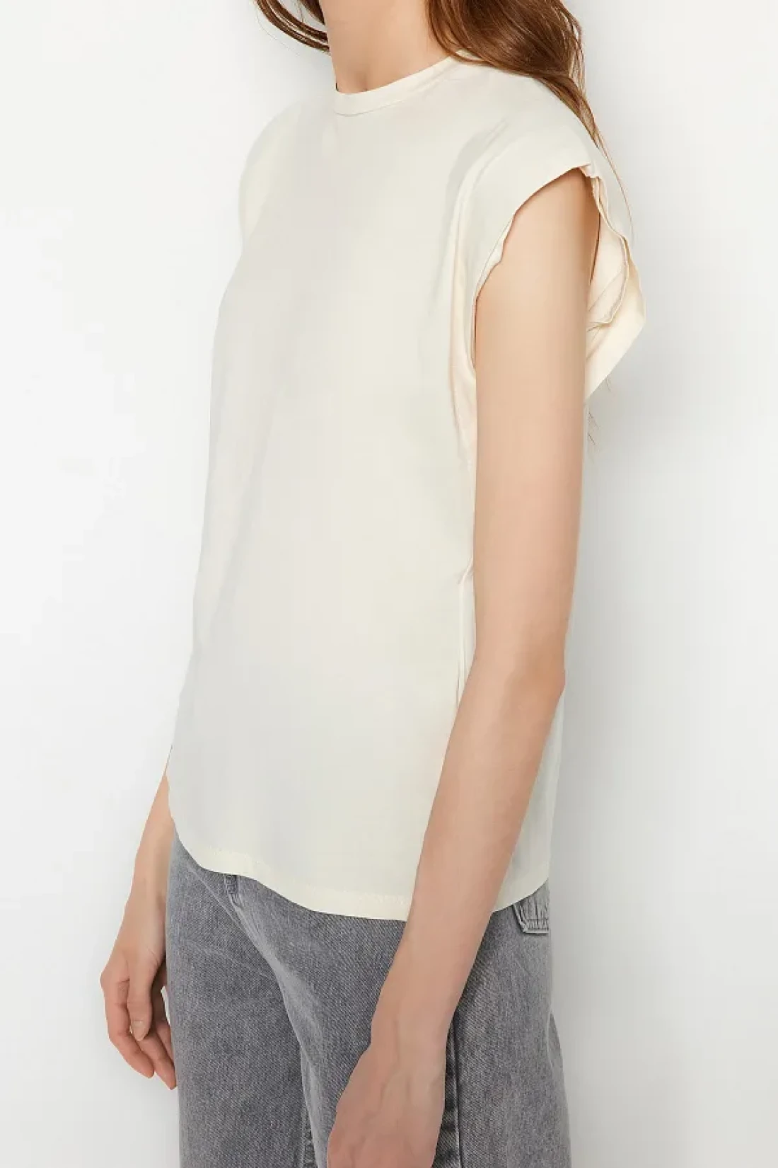 Collection Beige 100% Cotton Wadding Look Basic Crew Neck Knitted T-Shirt TWOSS20TS0021