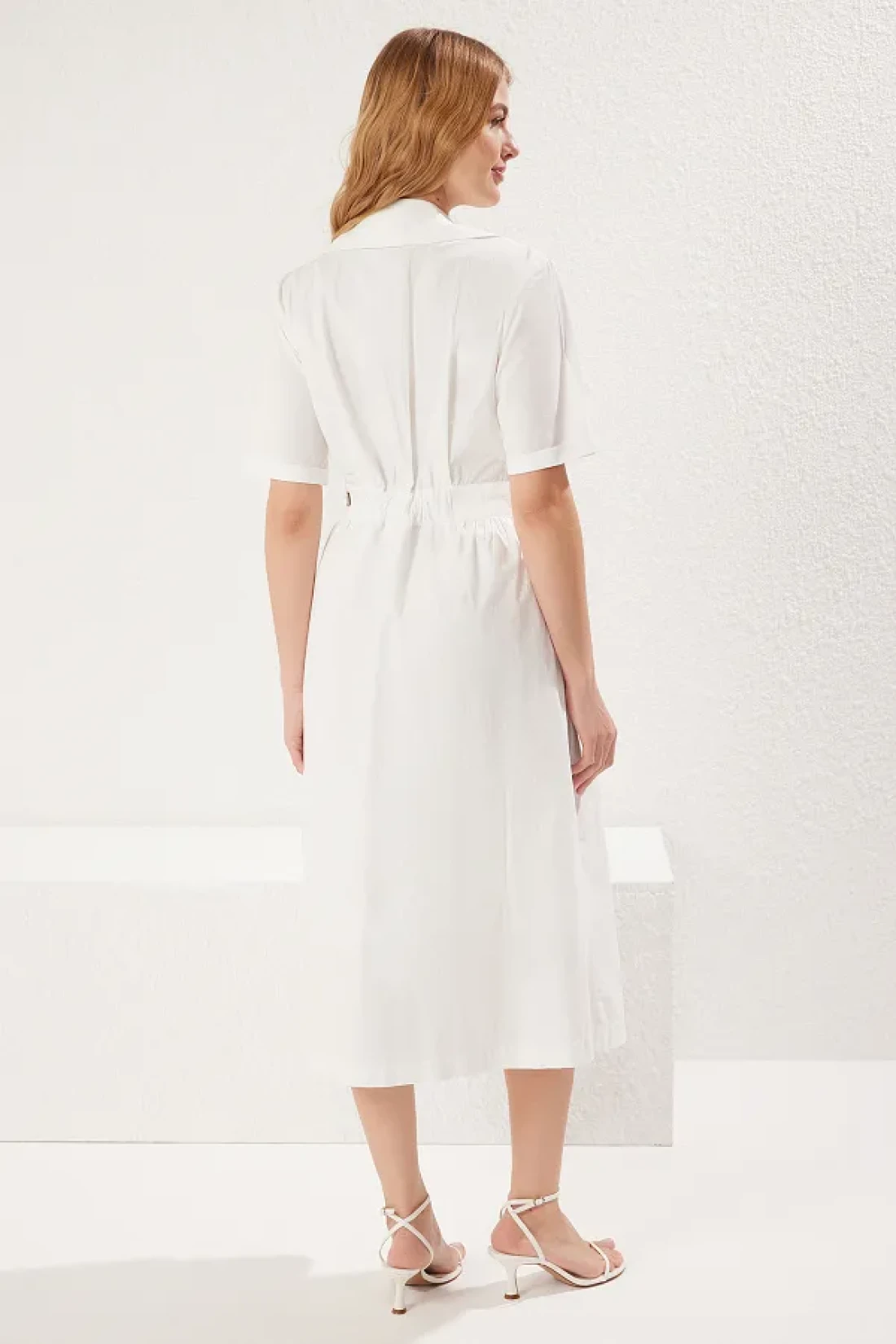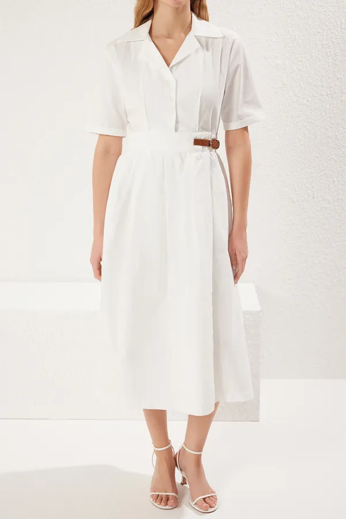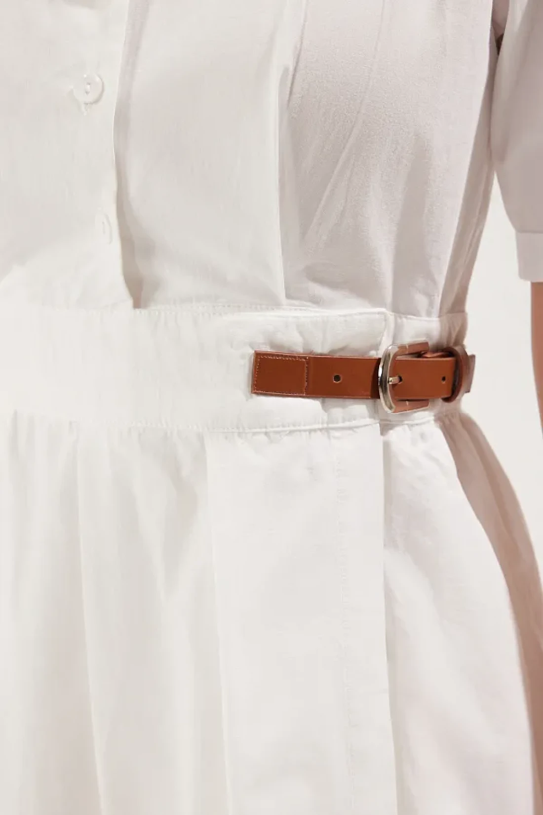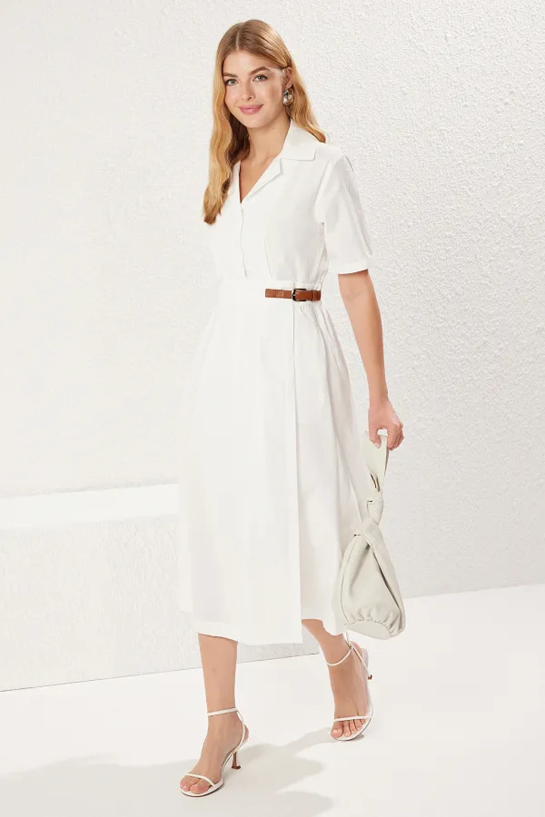 Collection White A-Line Pleat and Belt Detail Poplin Lining Midi Woven Dress Twoss25El00060