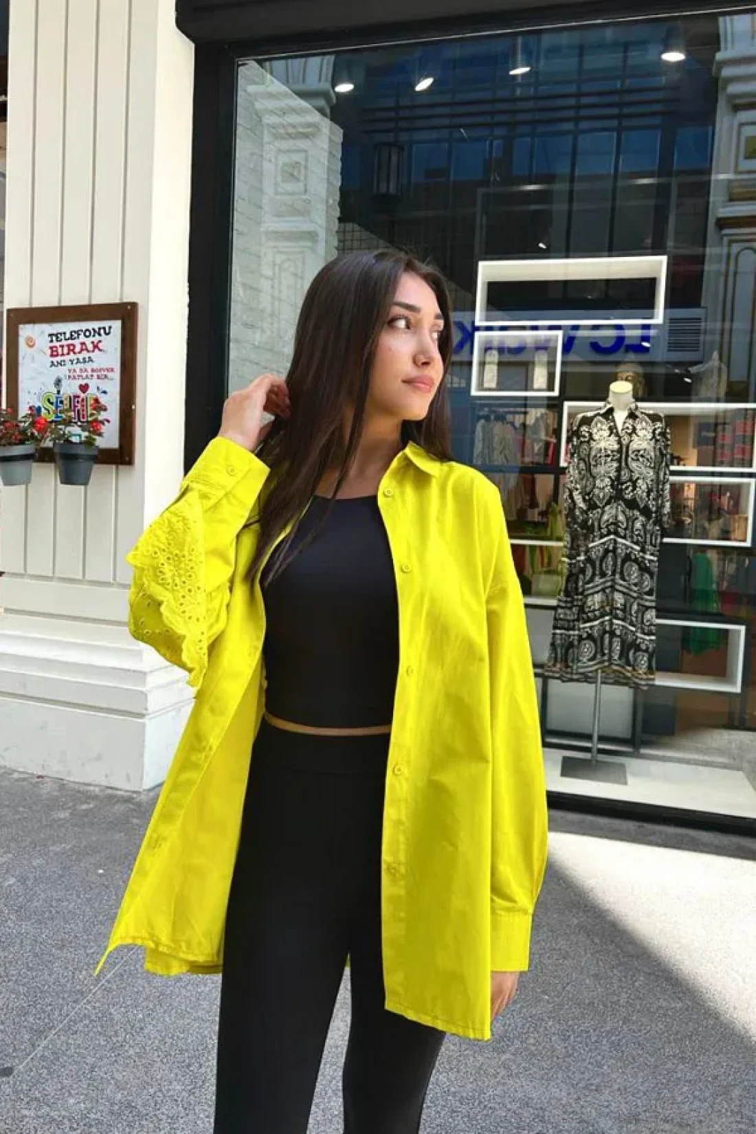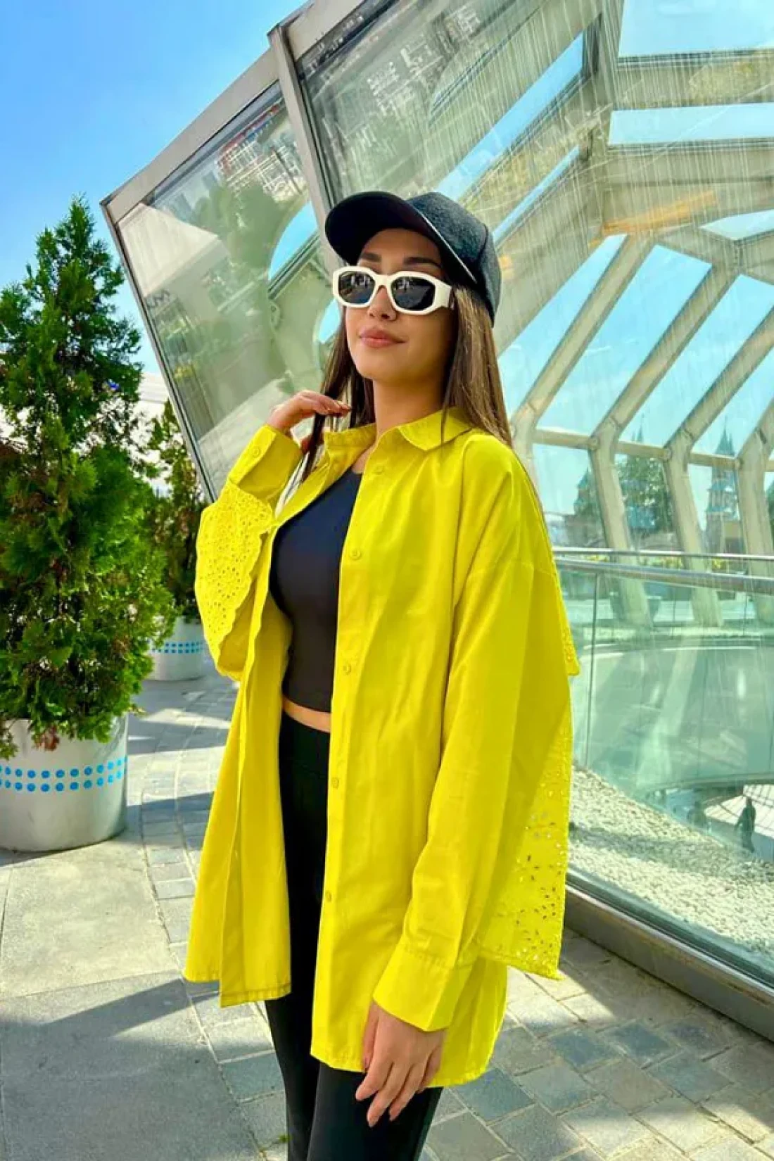 It offers both elegance and comfort with its long-length design. Provides an elegant look in classic environments Ideal for formal and daily combinations with its shirt collar detail While adding a feminine touch with lace details, the scallop weave type adds a modern flair. It offers comfortable use all day long thanks to its Oversized pattern. It can be easily combined with its plain pattern and creates a timeless style. Easy to care for in accordance with type 1 washing instructions It is suitable for everyone with its wide user base that appeals to all age groups. Woven fabric type increases durability, allowing long-term use The buttoned closure offers practical use, while the long sleeve design provides ideal protection during seasonal transitions. With its basic silhouette, it takes its place as a basic piece in every wardrobe.