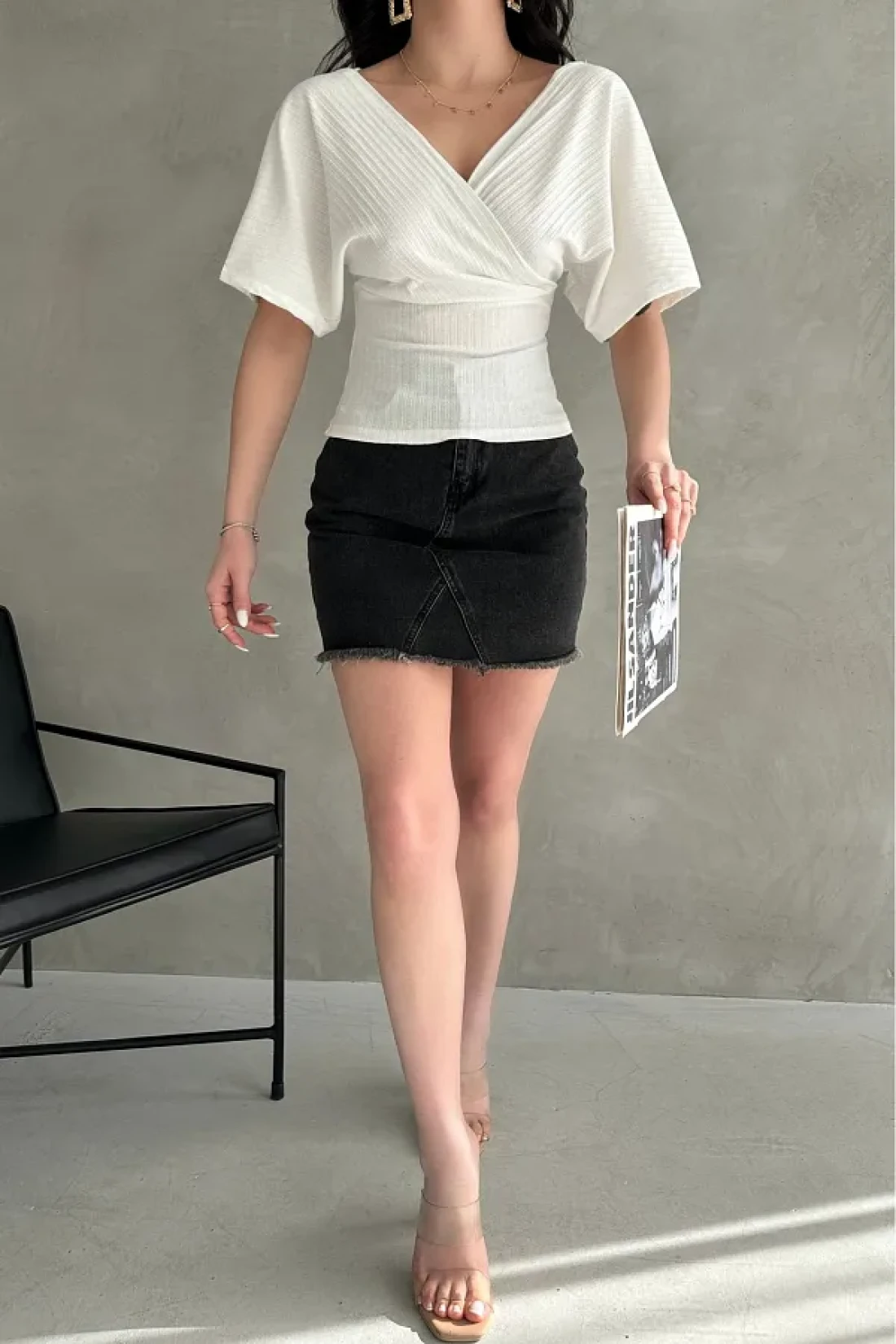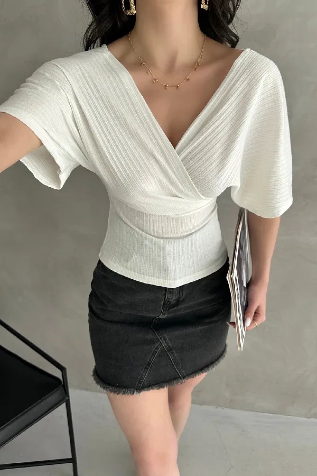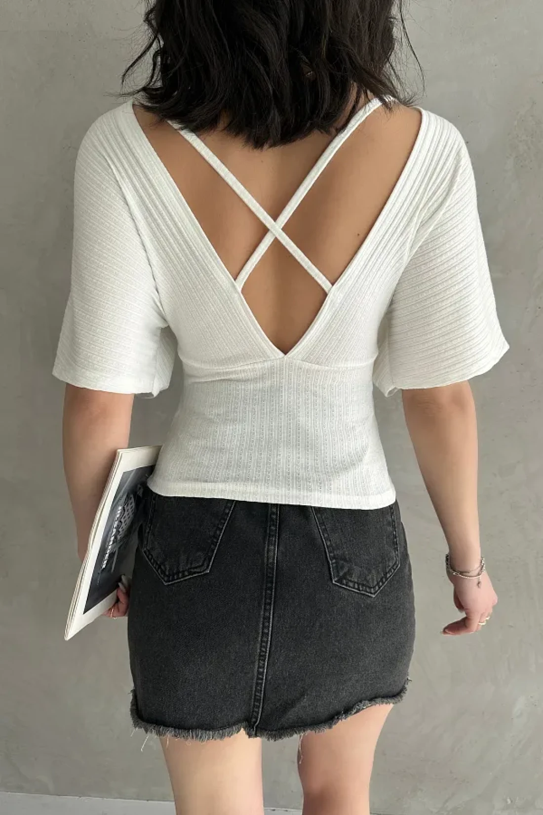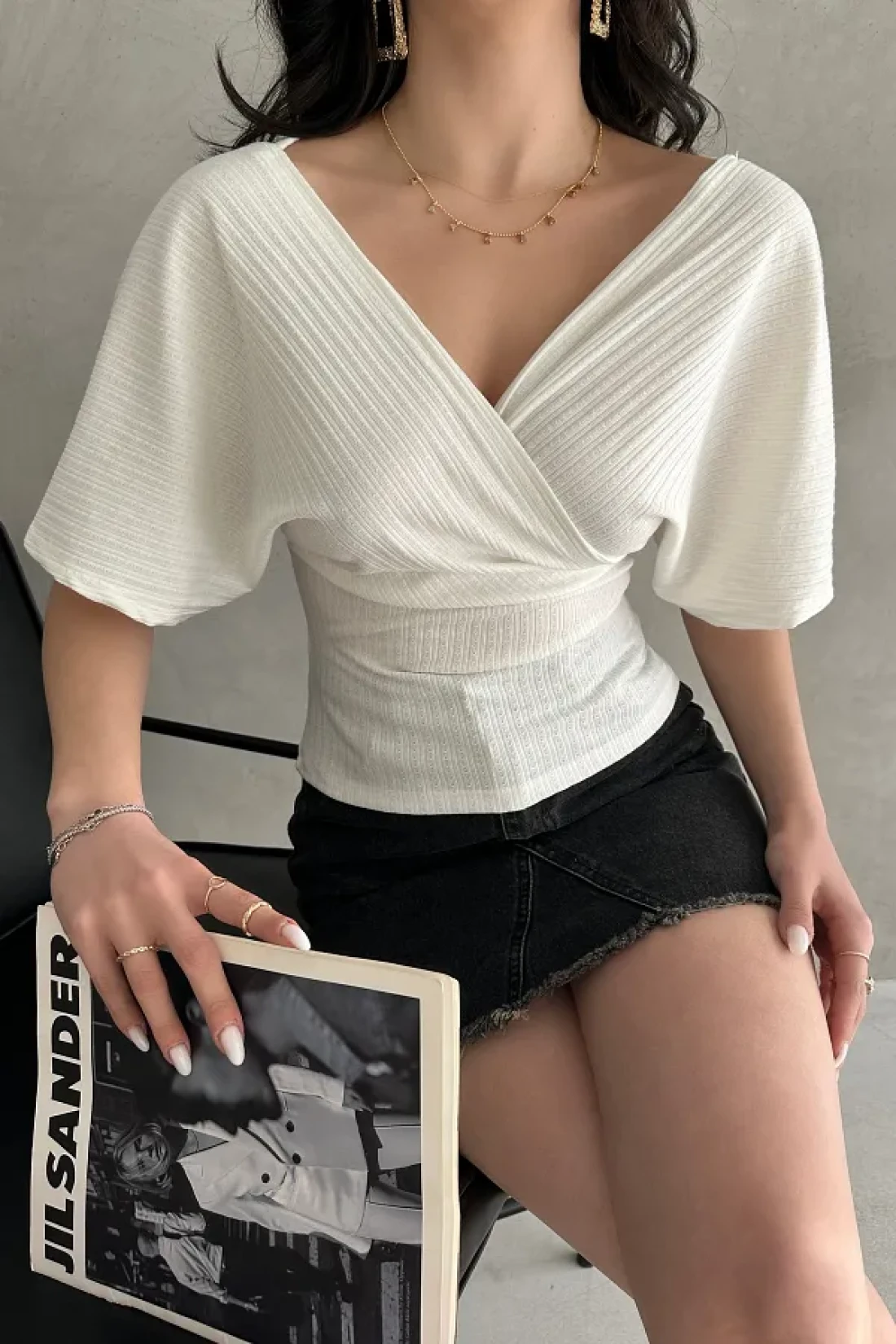 Fav Style Women's Short Sleeve Double Breasted Neck Back V Cross Band Detail Blouse White