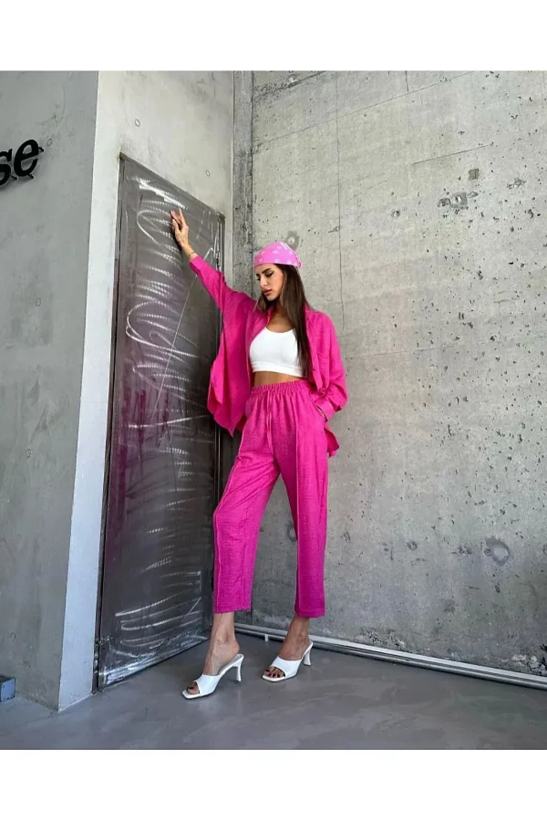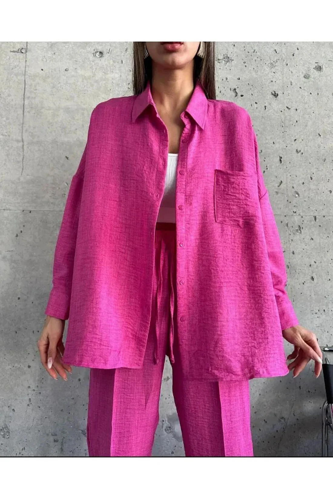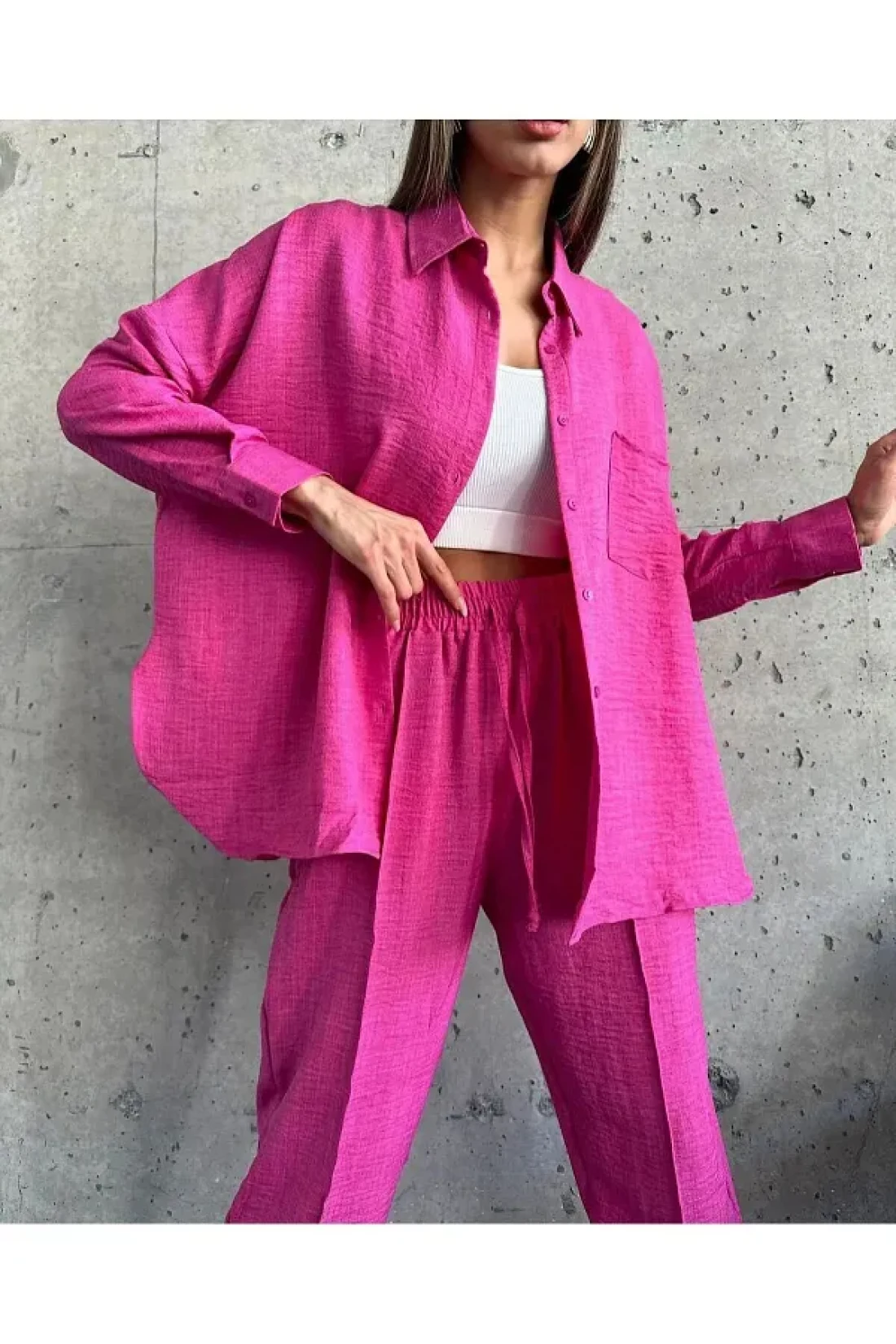 with its solid pattern and long sleeves, it creates a simple yet elegant style. Thanks to its elastic waist design, it offers comfortable use and adapts to different body types. A modern and trendy look is achieved with the Oversized silhouette. The woven fabric type gives a quality feel, while the linen blend material stands out with its lightness and breathability. This set, which belongs to the design collection, has a wide user base that appeals to all age groups. When cared for according to washing instructions, it offers the possibility of long-term use.