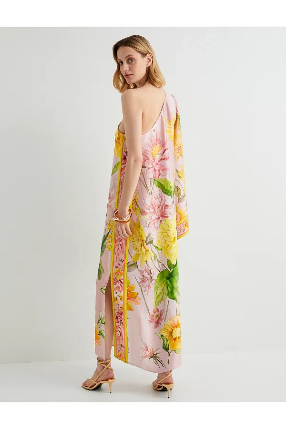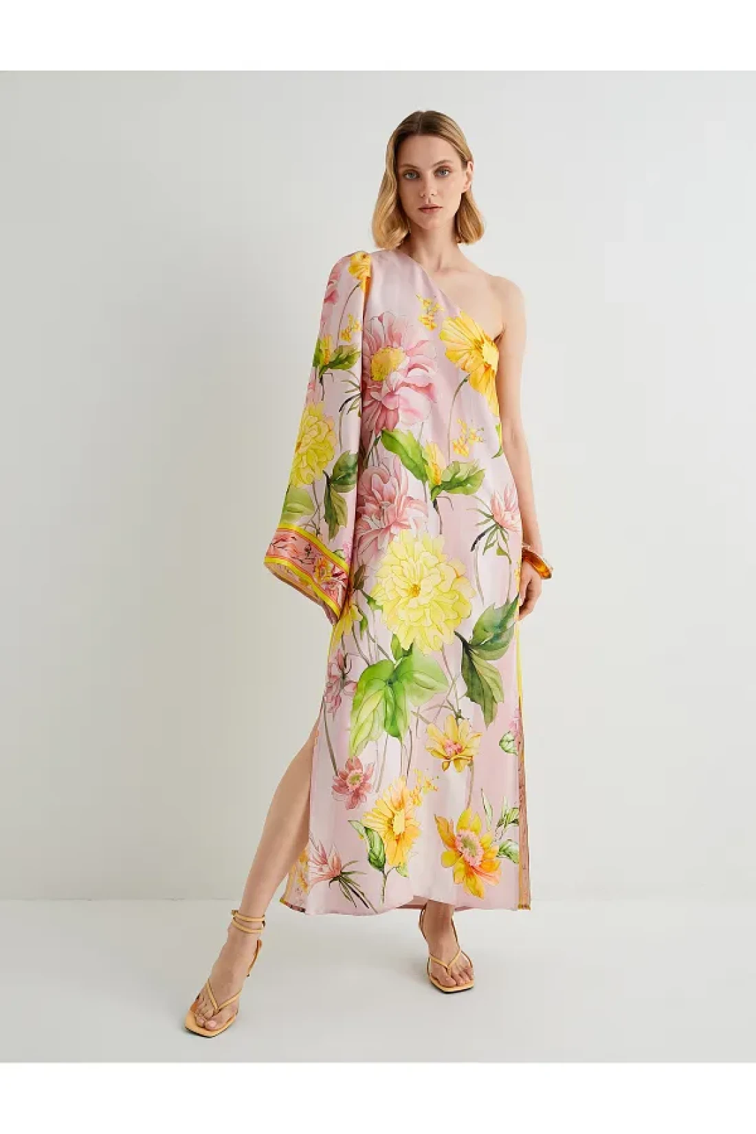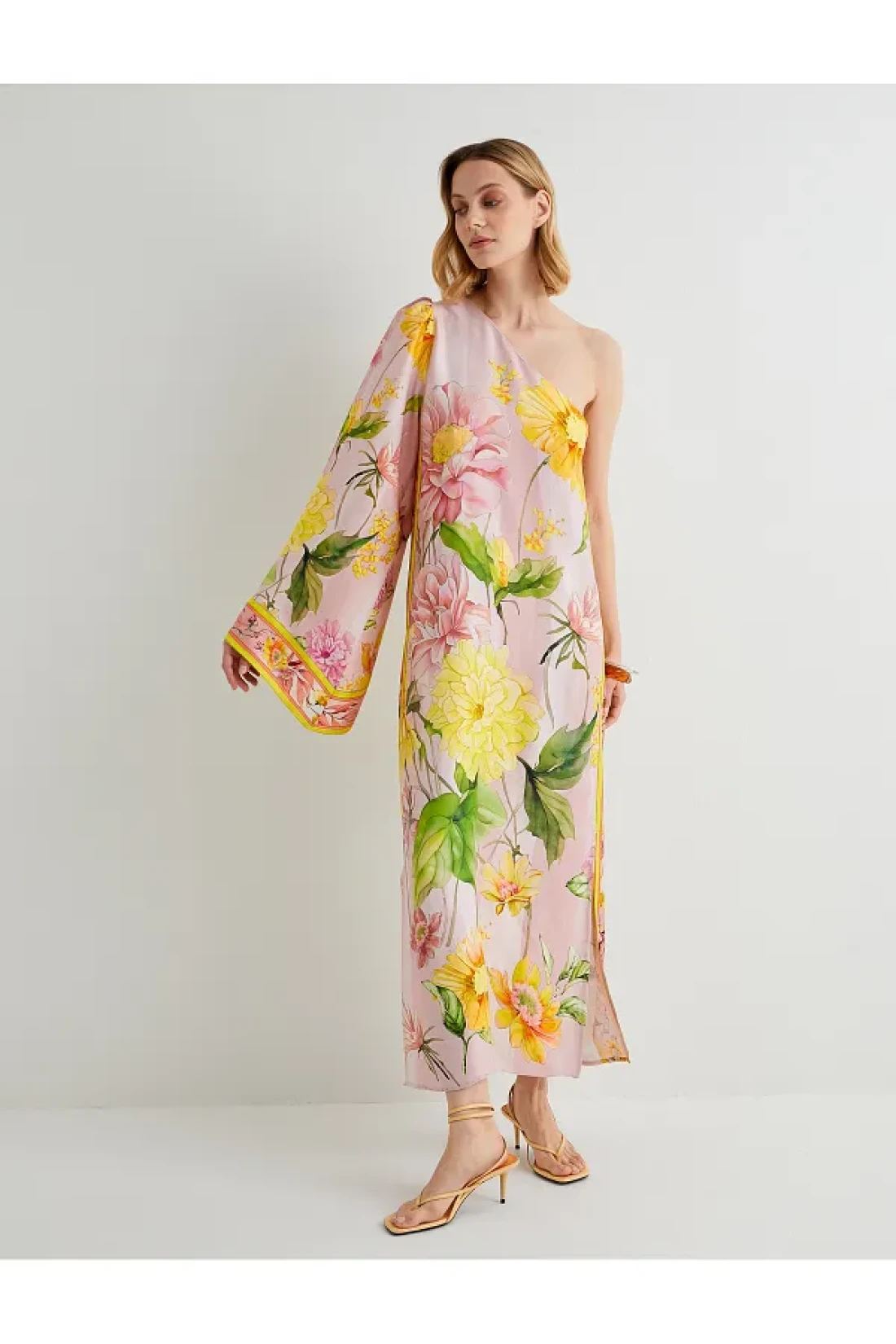 Koton x tuba Ünsal | One-shoulder, floral, slit detailed, midi length, viscose dress.