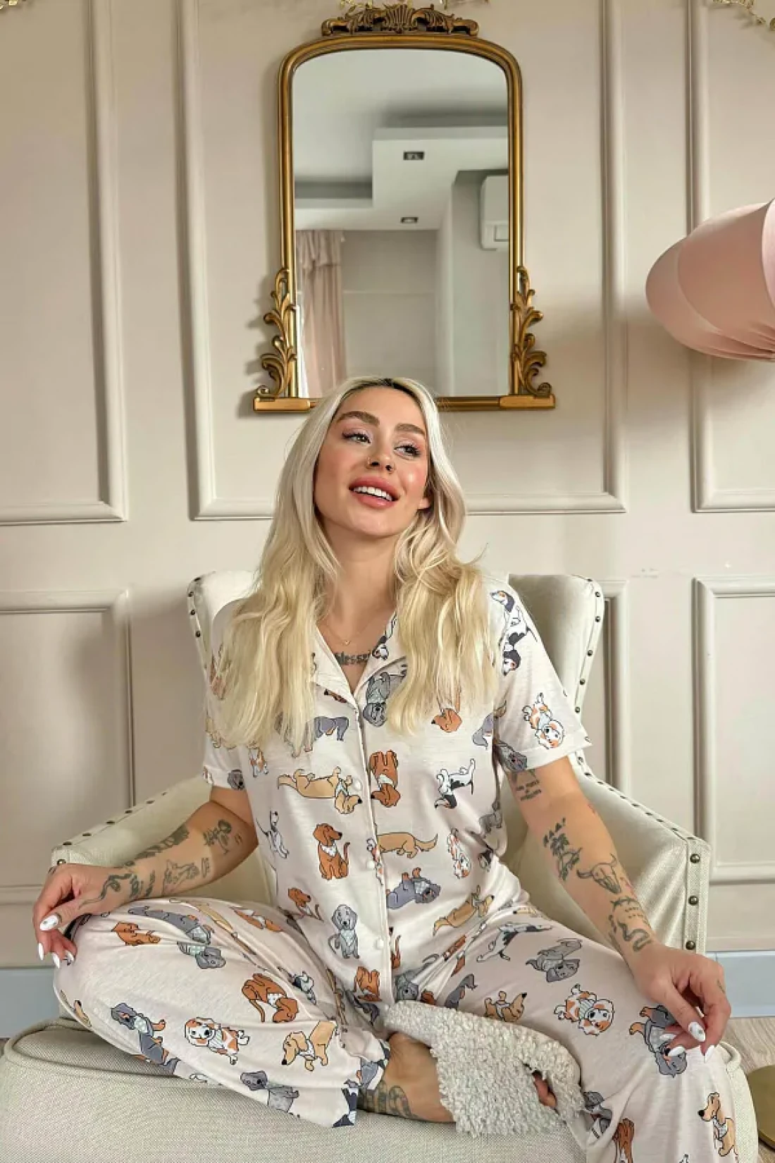 Fabric type: 95% bamboo 5% elastane The women's summer pajama set with patterned front buttons is thoughtfully designed to provide a cool and comfortable sleep experience during hot summer nights. This set, made using imported soft fabric, offers your skin a perfect softness and flexibility with its 95% bamboo and 5% elastane blend. The measurements of the model are