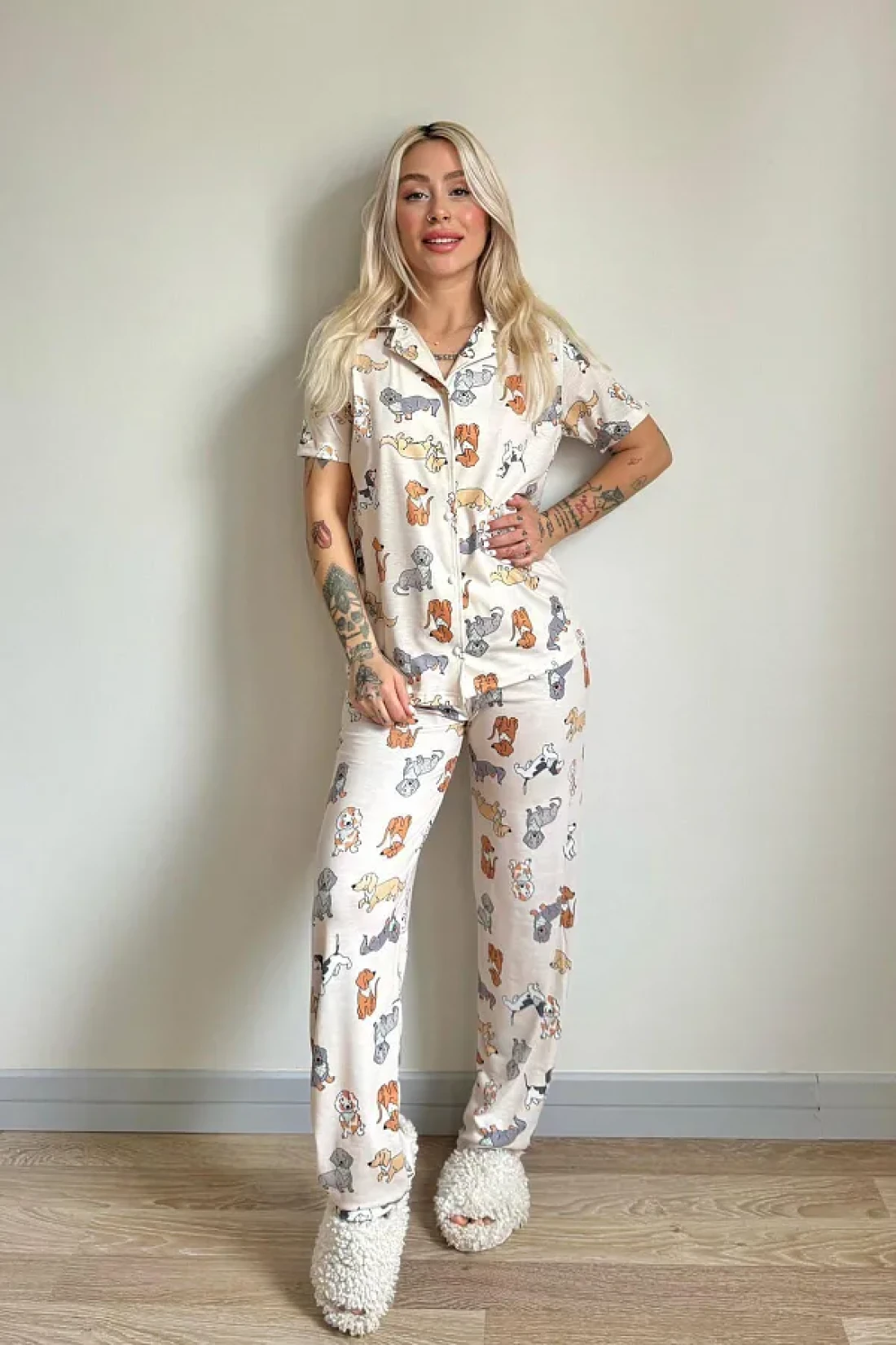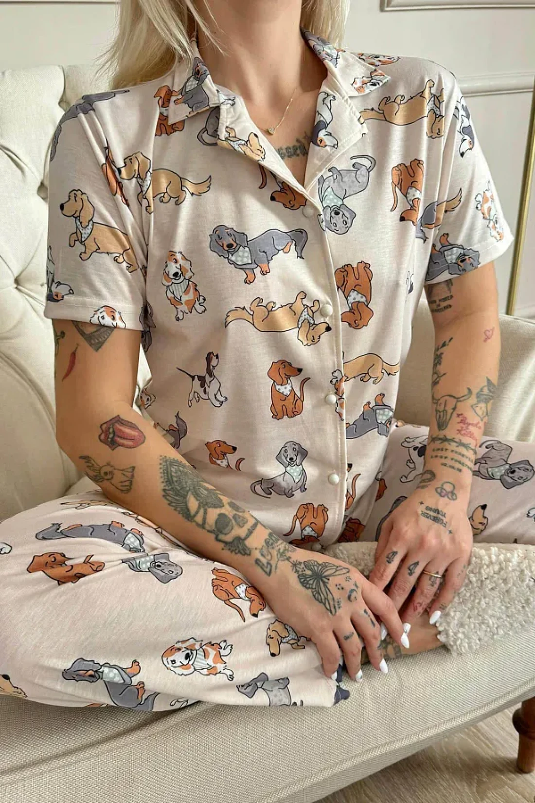 Pijamaevi Labrador Patterned Short Sleeve Front Buttoned Women's Pajamas Set