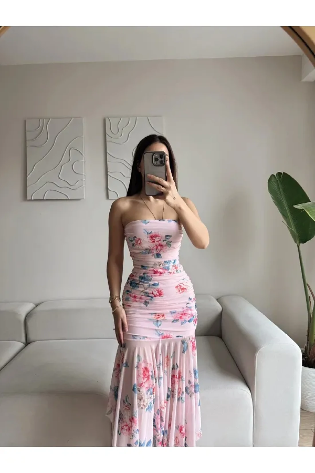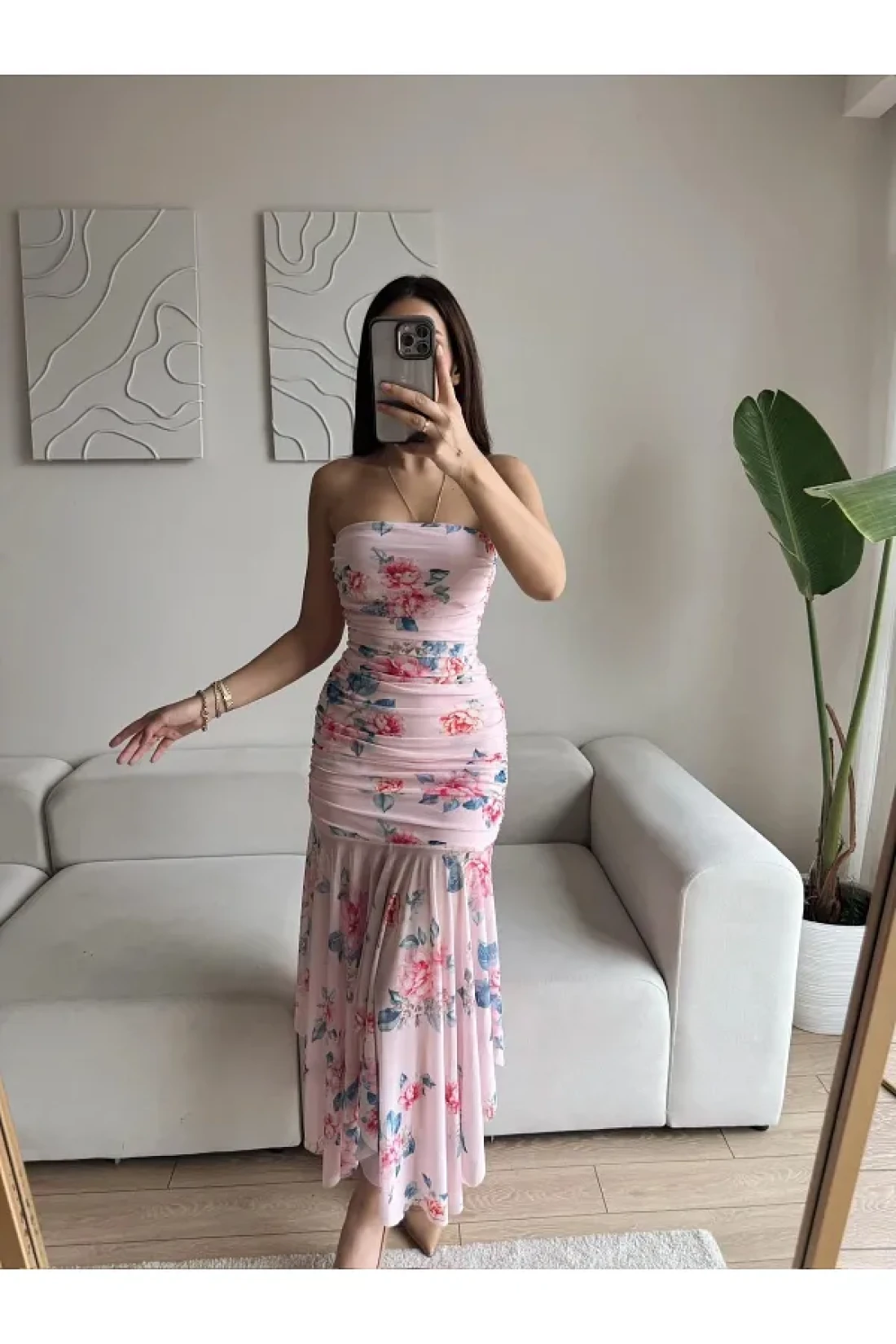 Zoom Butik Floral strapless Draped dress - pink