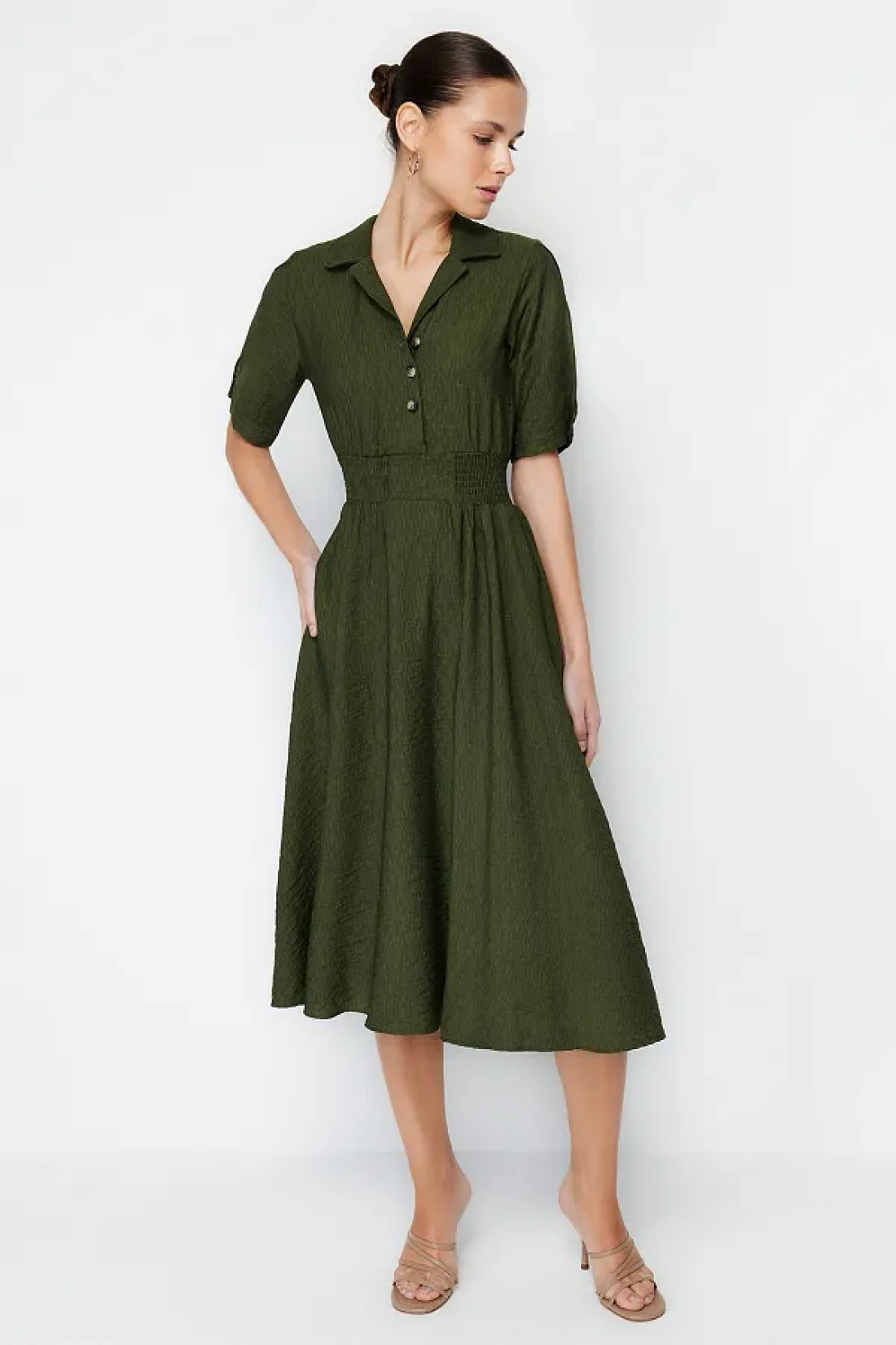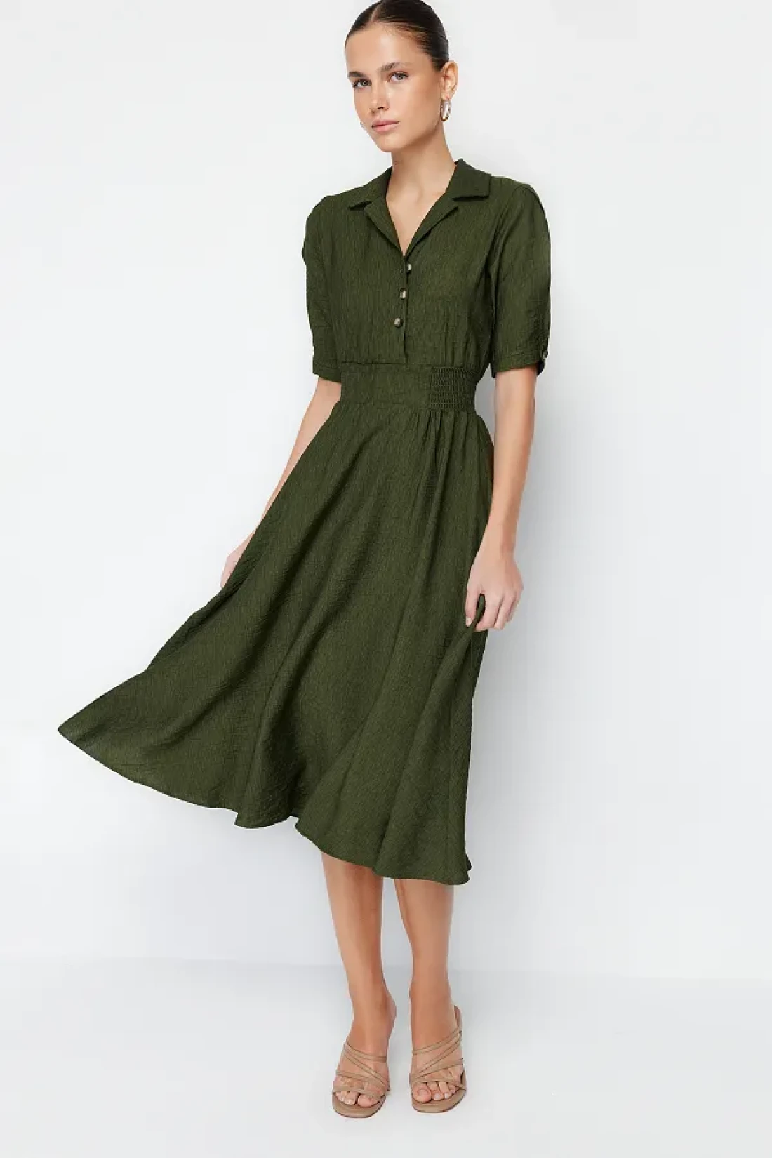 Collection Khaki A-line Shirt Collar Guiped Midi Woven Dress TWOSS21EL1023