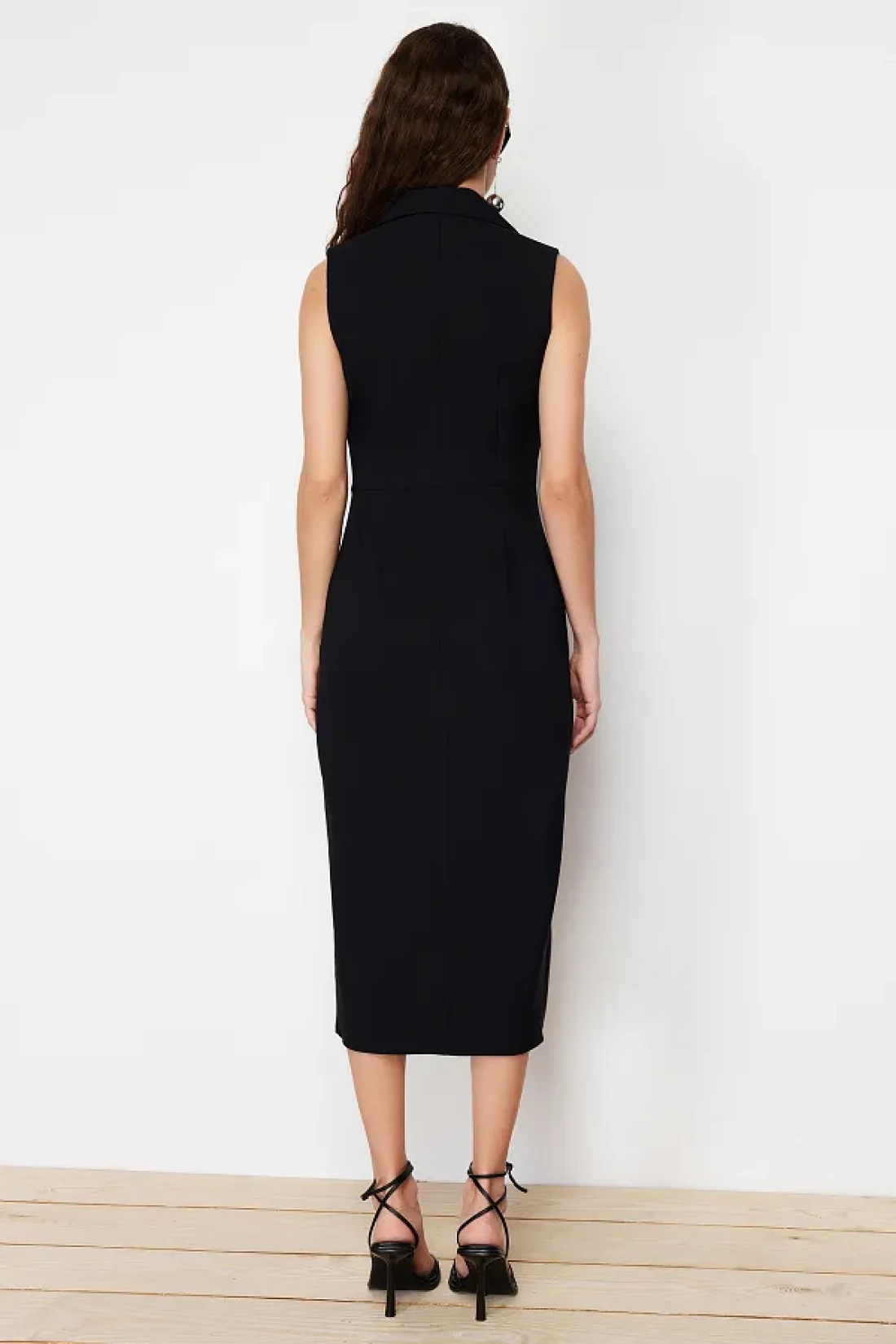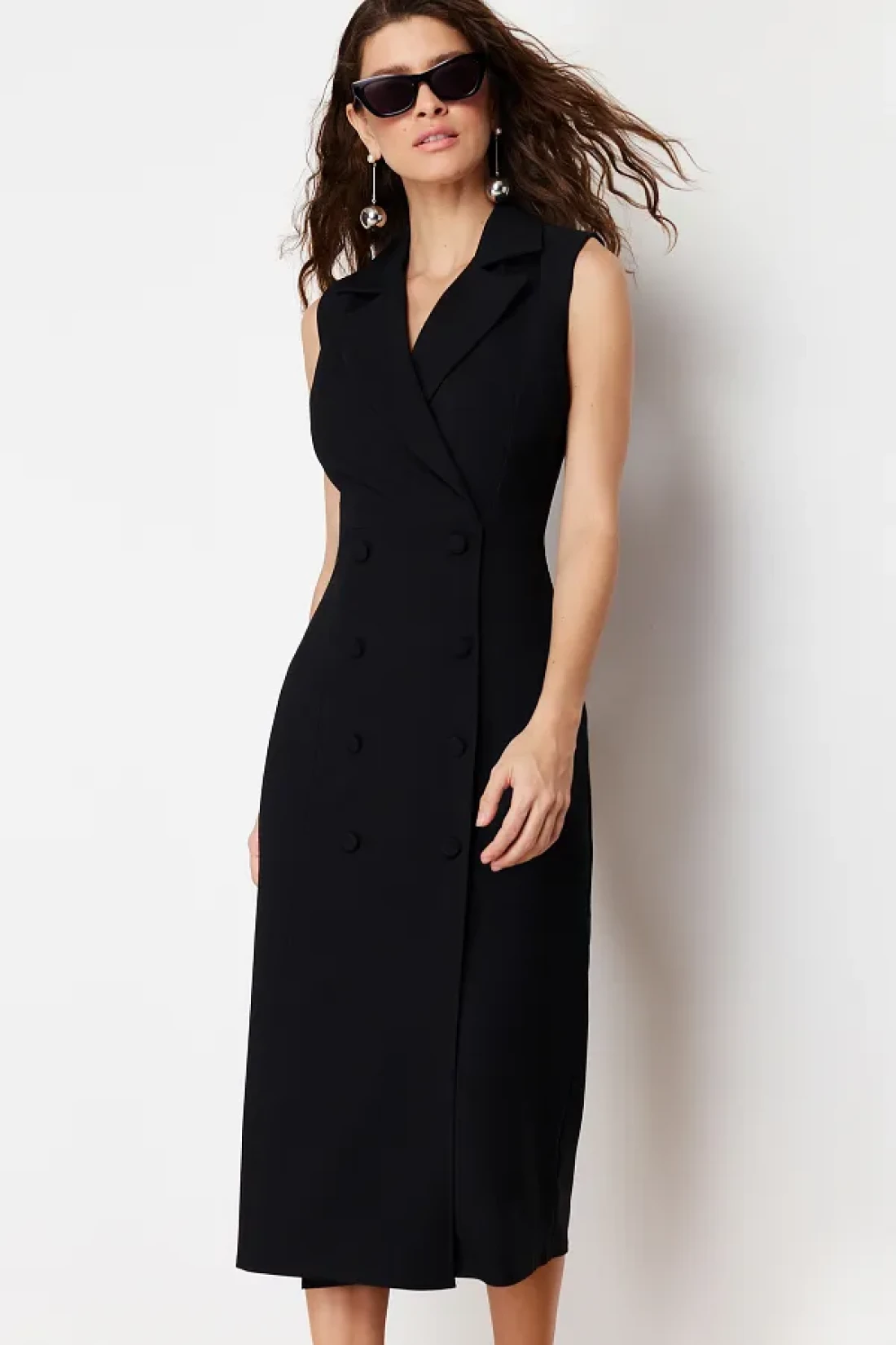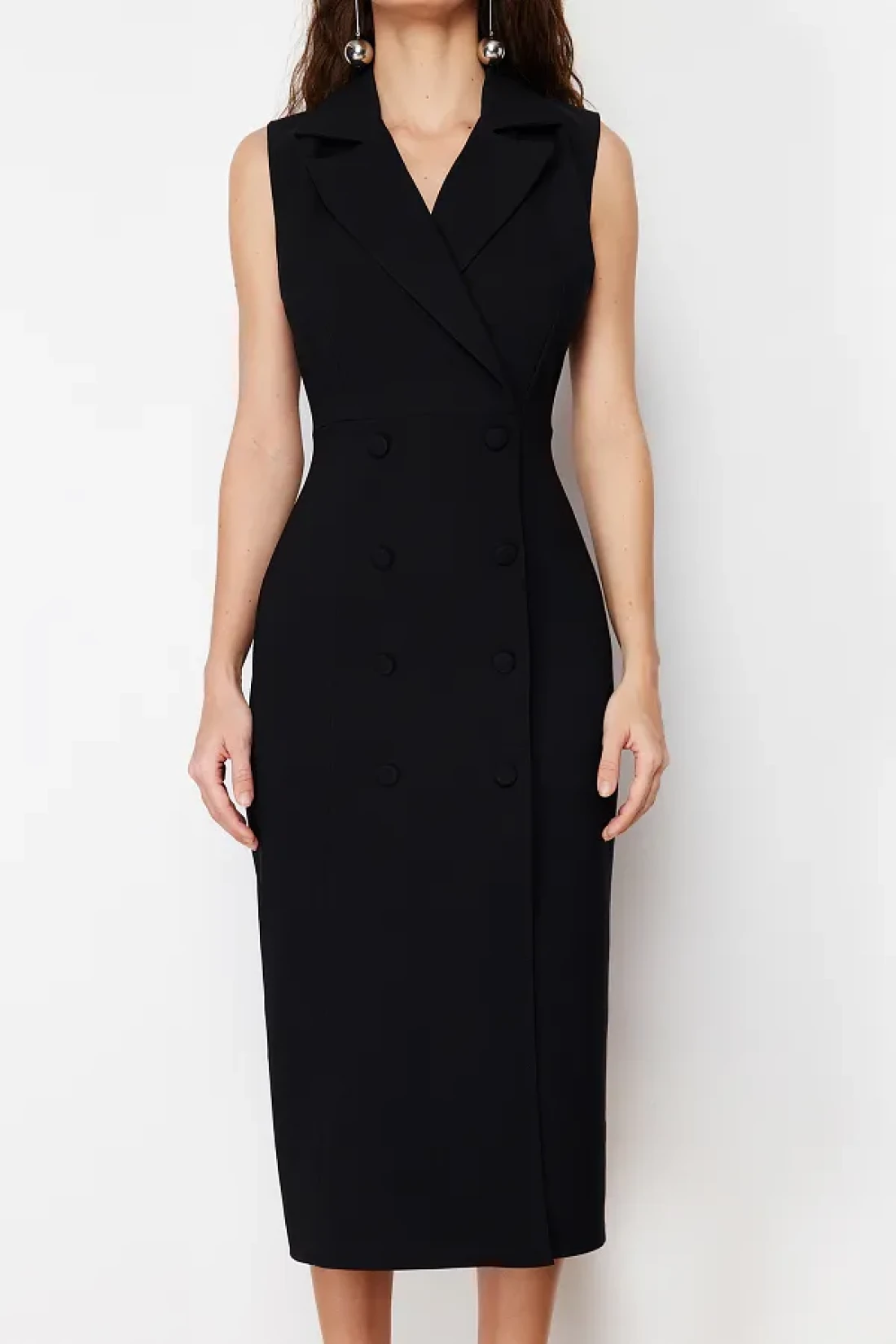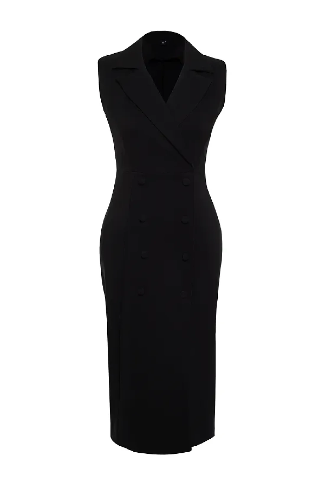 Collection Double Breasted Collar Black Midi Dress with Pencil Skirt - Button Detail, Sleeveless - TWOSS24EL00616