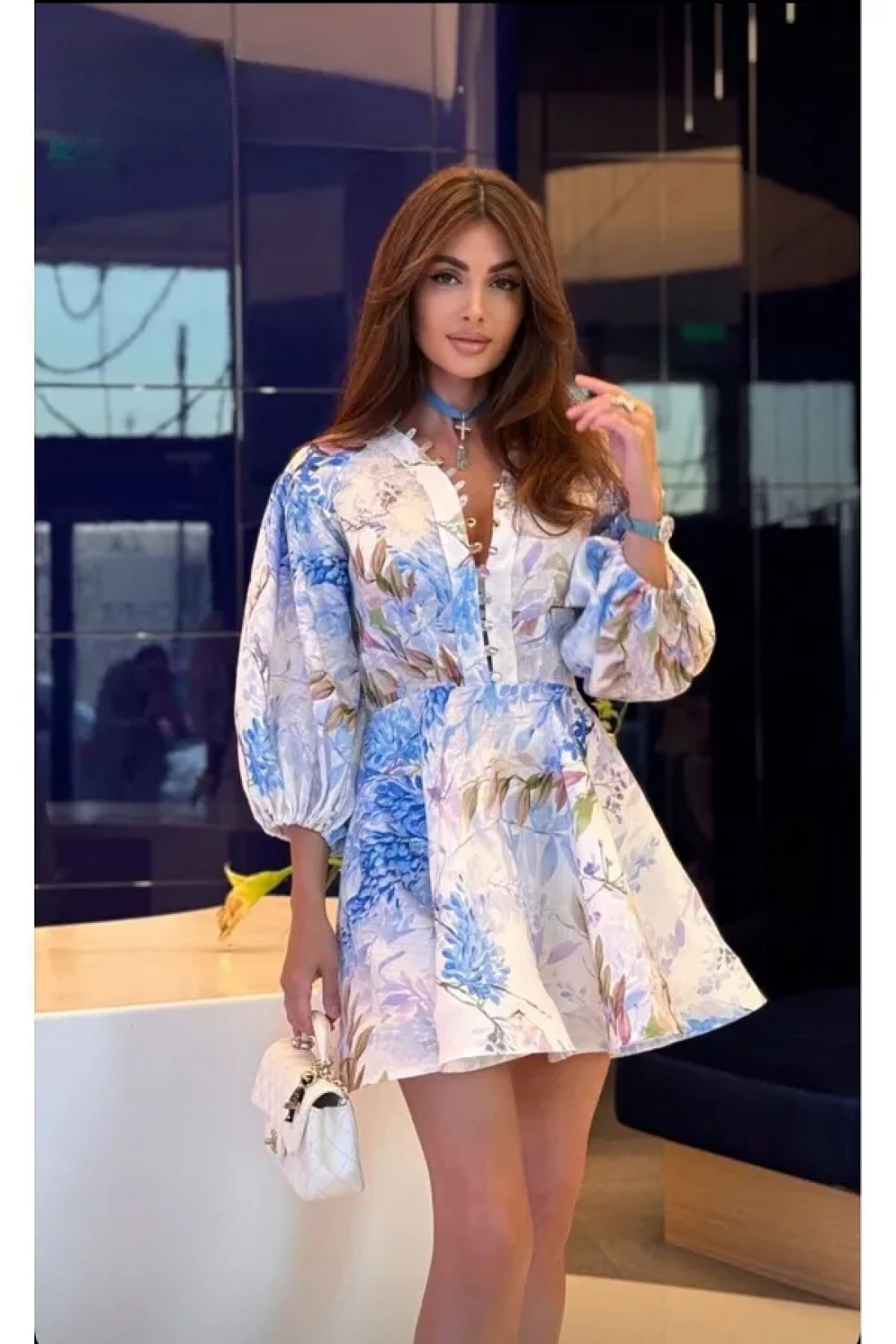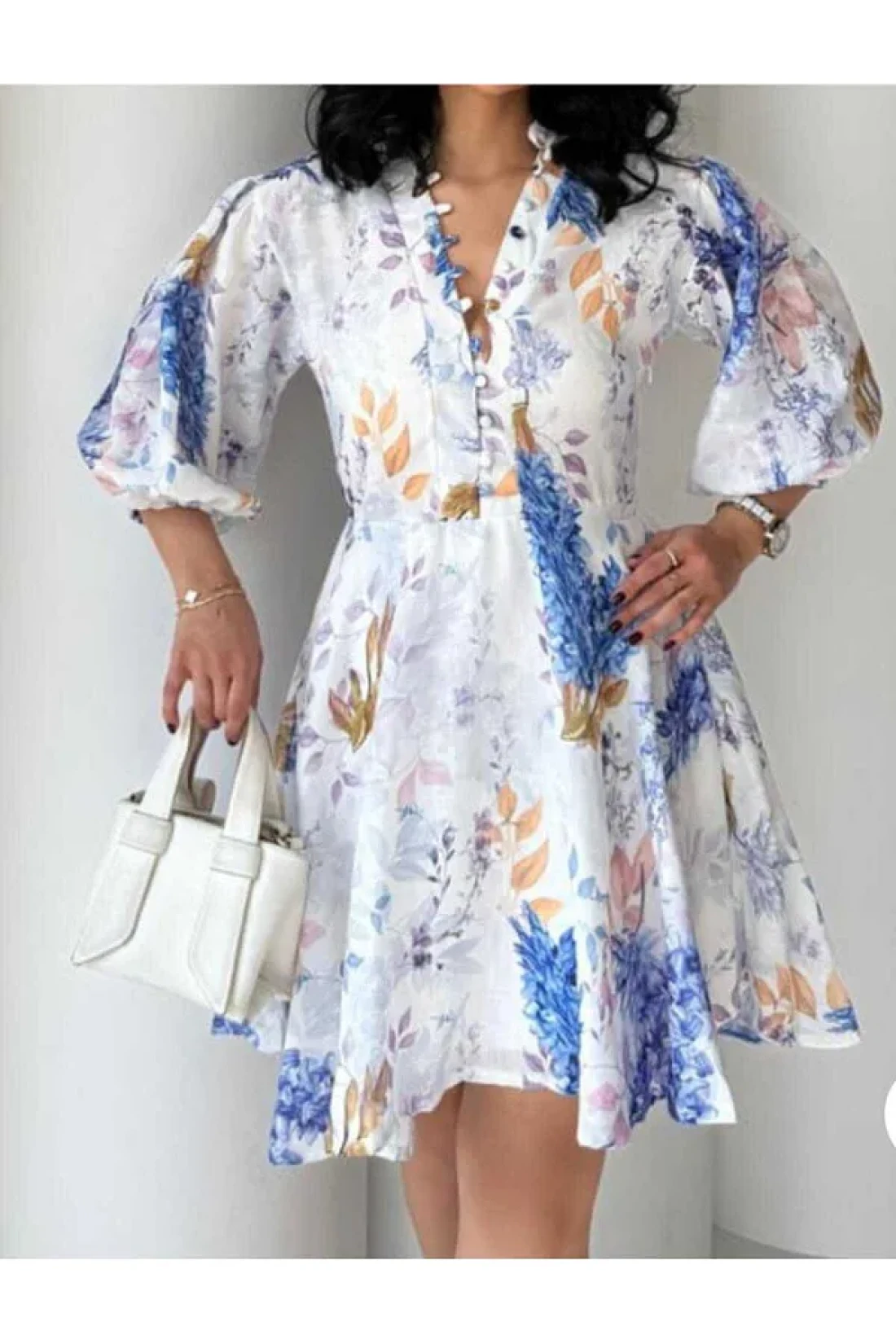 it promises long-lasting use. It does not compromise on comfort while adopting a minimalist design concept with its container-less structure. Thanks to its lining, it does not show through and provides a more professional appearance. Thanks to its flared silhouette, it emphasizes feminine lines and displays an elegant posture. The pattern produced with digital printing technique is eye-catching with its vibrant colors. This dress, which can be comfortably preferred in daily environments, keeps up with trends with its three-quarter sleeve cut.