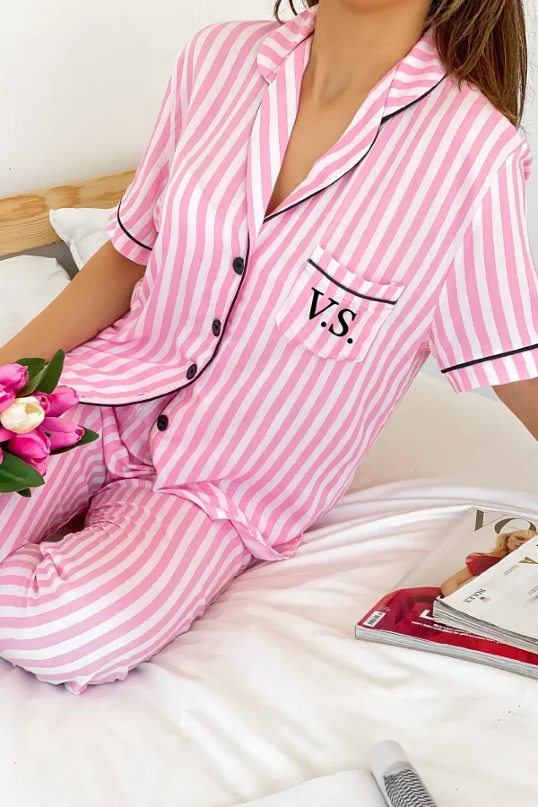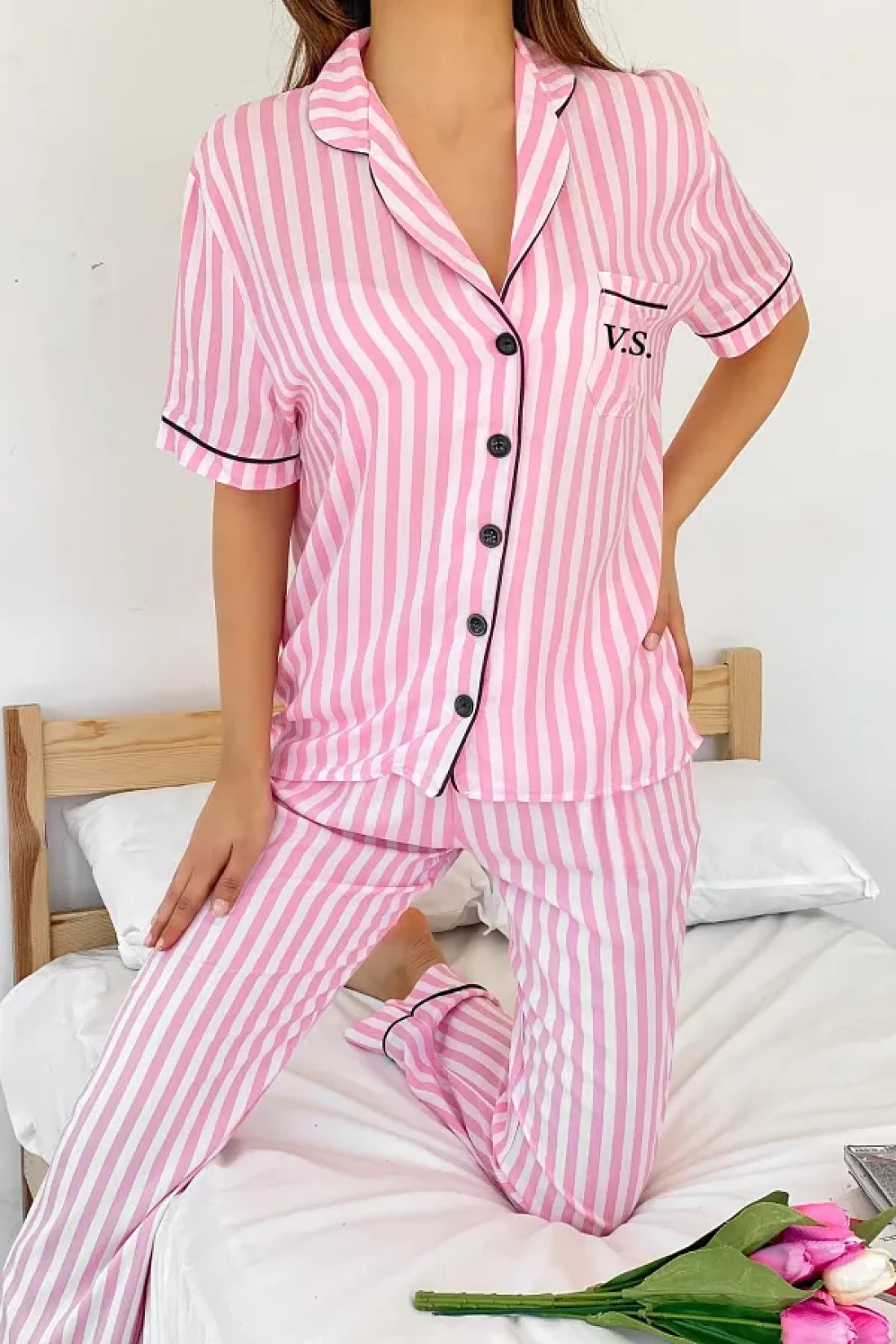 The satin pajama set offers elegance and comfort together, adding a touch of refinement with its lace details.