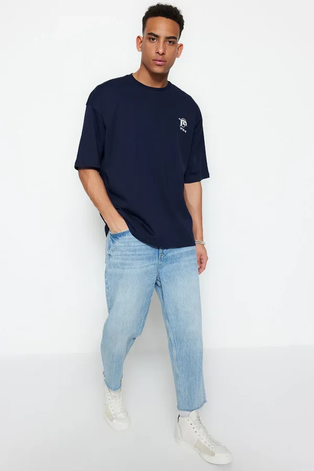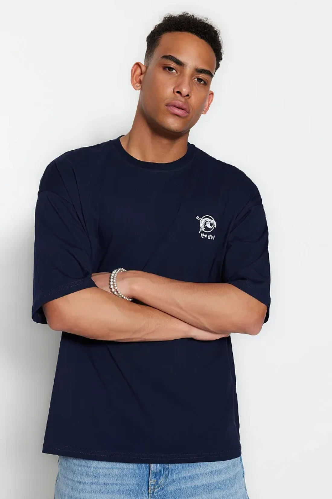 Collection Far East Patterned Navy Blue Oversize Cotton T-Shirt - TMNSS23TS00170