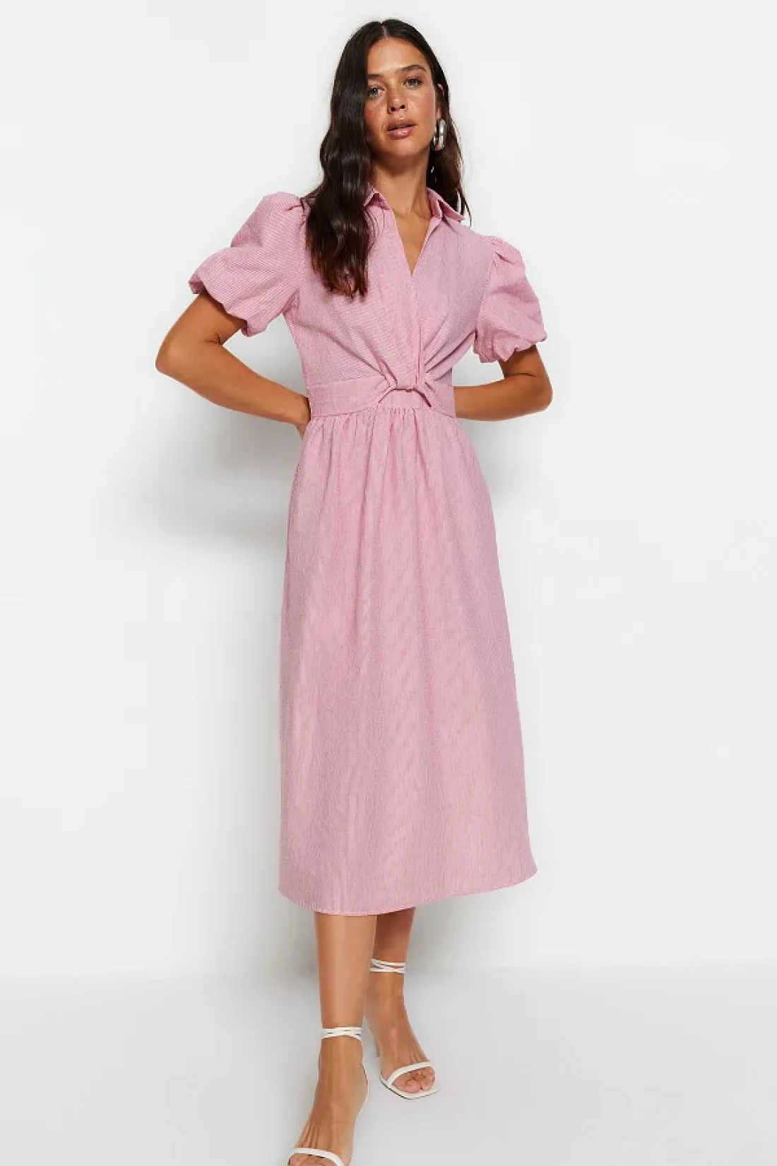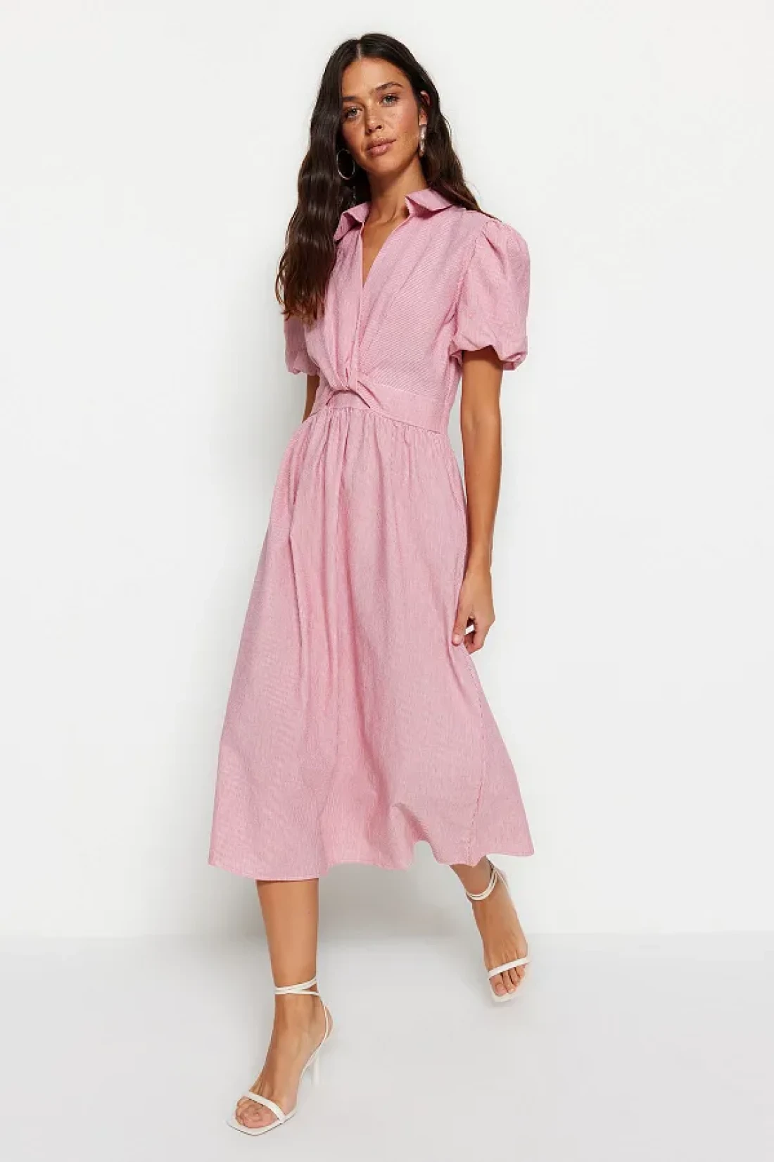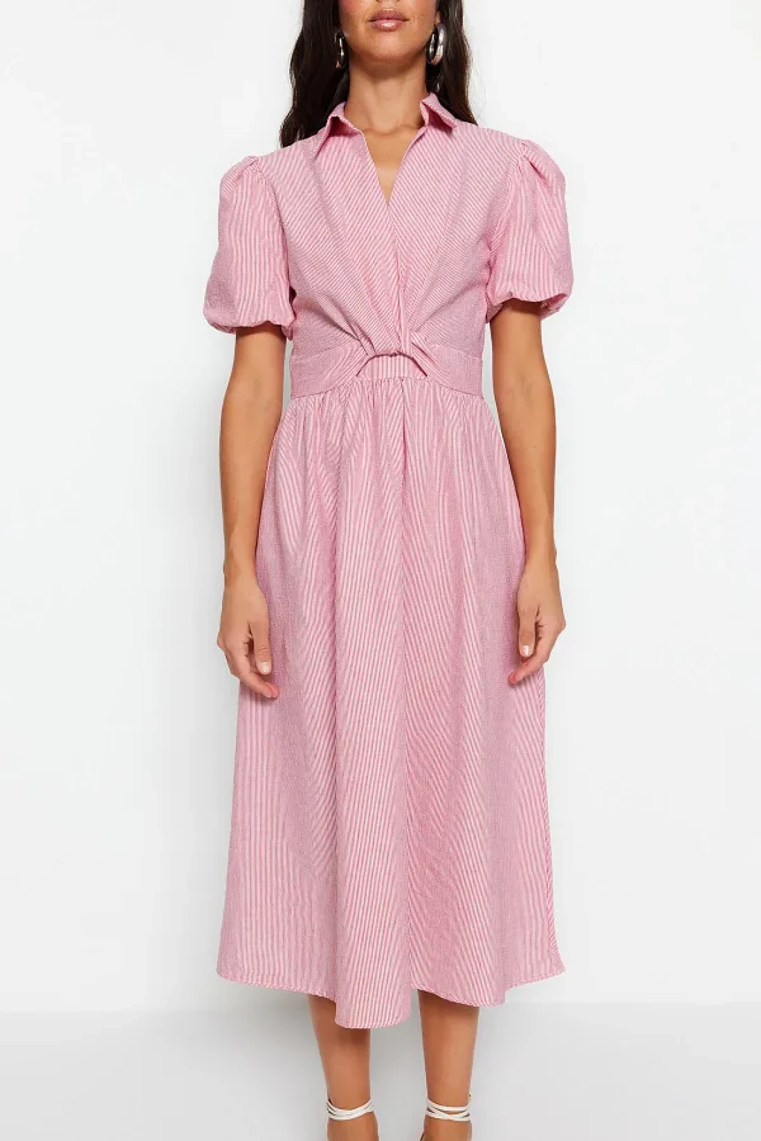Collection Pink Striped Double Breasted Collar Midi Woven Dress TWOSS23EL02233